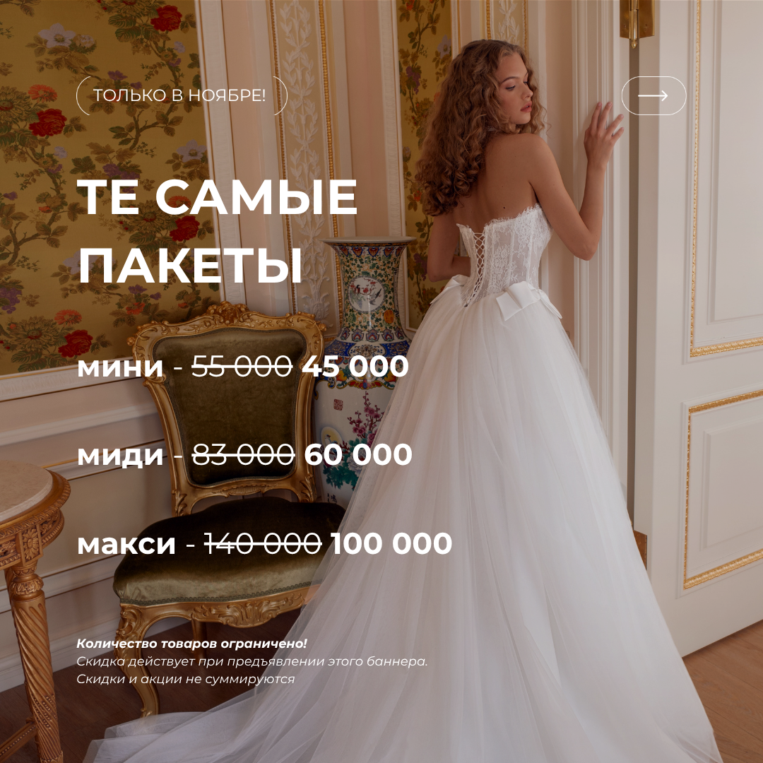В ноябре в салоне действуют сразу несколько акций, которые помогут собрать свадебный образ мечты с удовольствием и со скидкой: