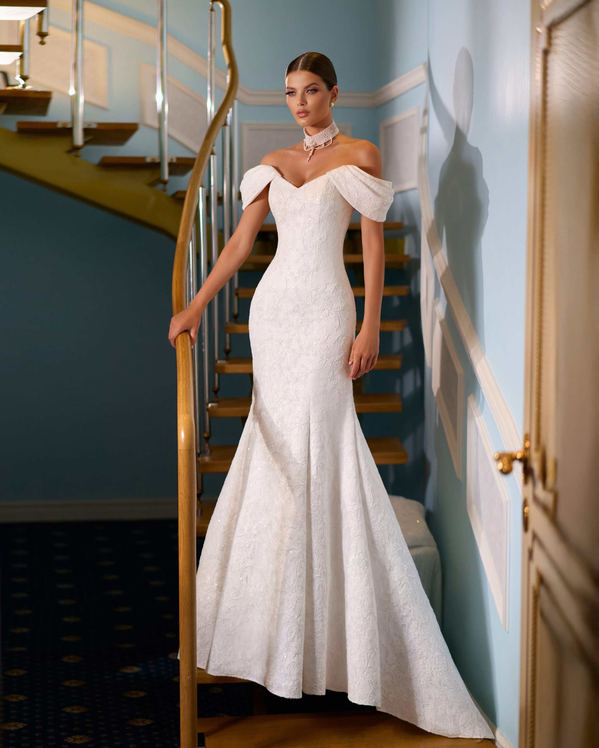 Платье, где каждая деталь важна. Шикарный лиф с мягким декольте, пышные рукава и лёгкая юбка, которая плавно расходит по бокам — всё в этом платье говорит о женственности, уверенности и чувственности. Нежное кружево с перламутровым сиянием, подчеркивающее грацию, создаёт образ, который захватывает.