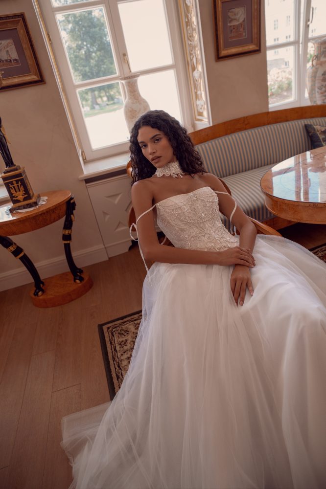 Платье, в котором кружево встречает скульптурную драпировку. Открытые плечи и изящный корсет подчеркивают женственность, а мягкие складки ткани создают идеальный баланс между классикой и современностью.