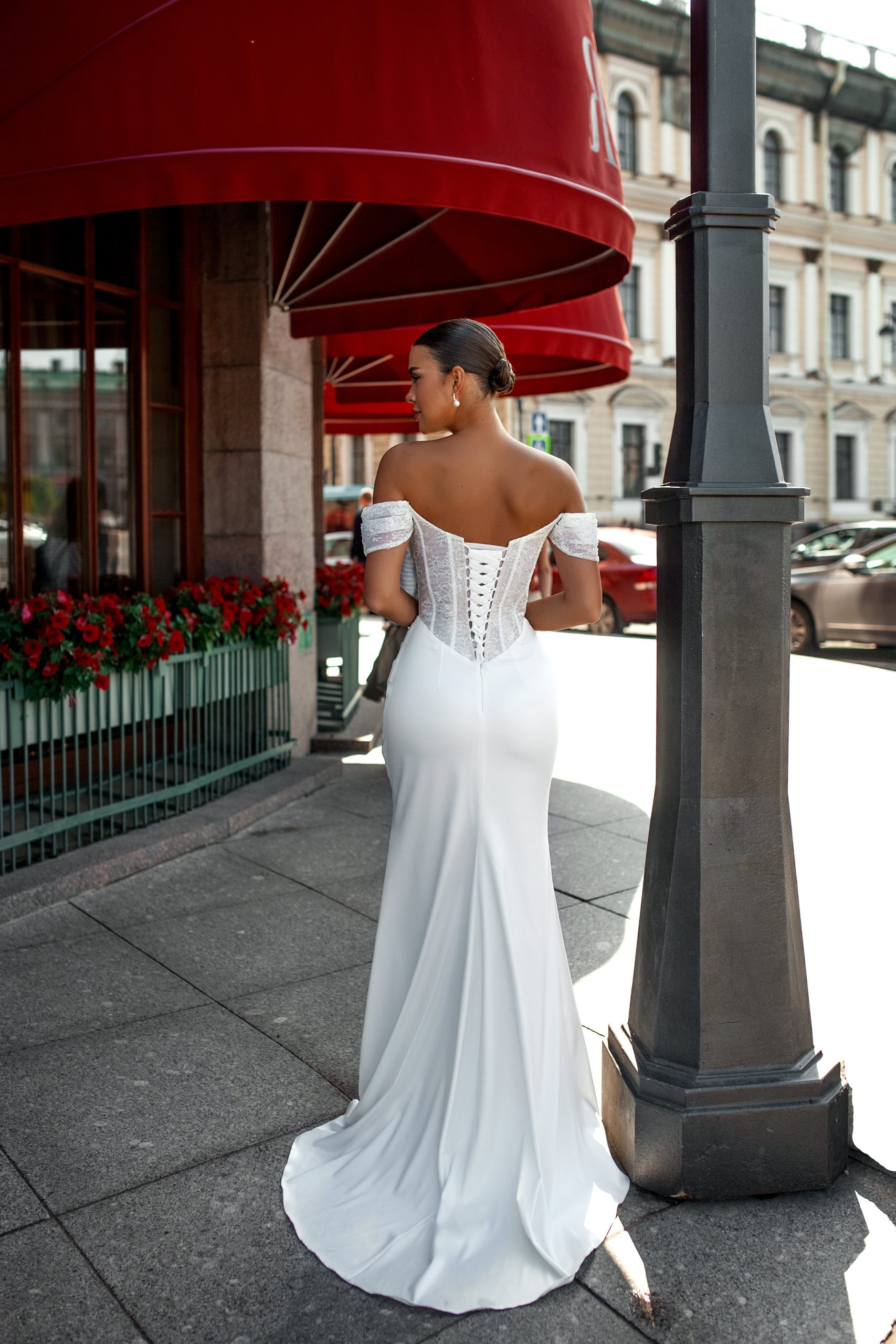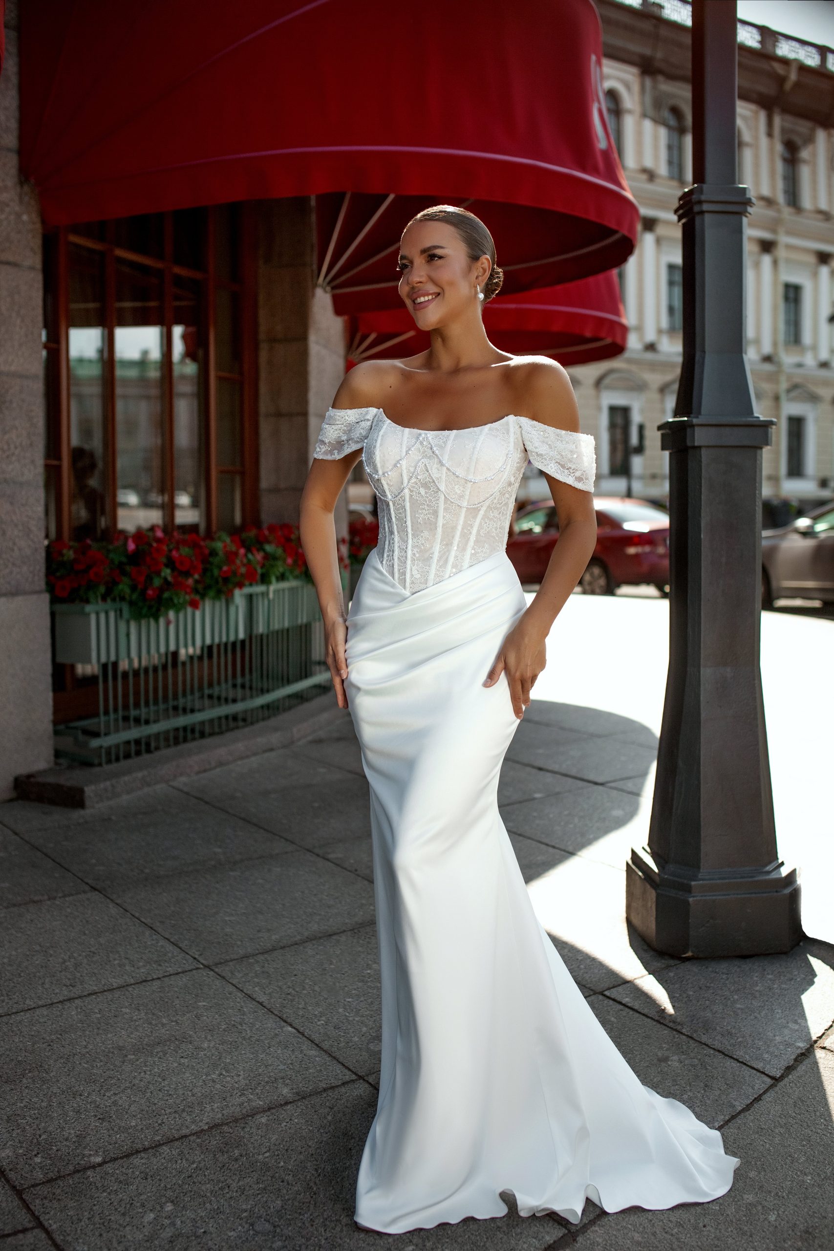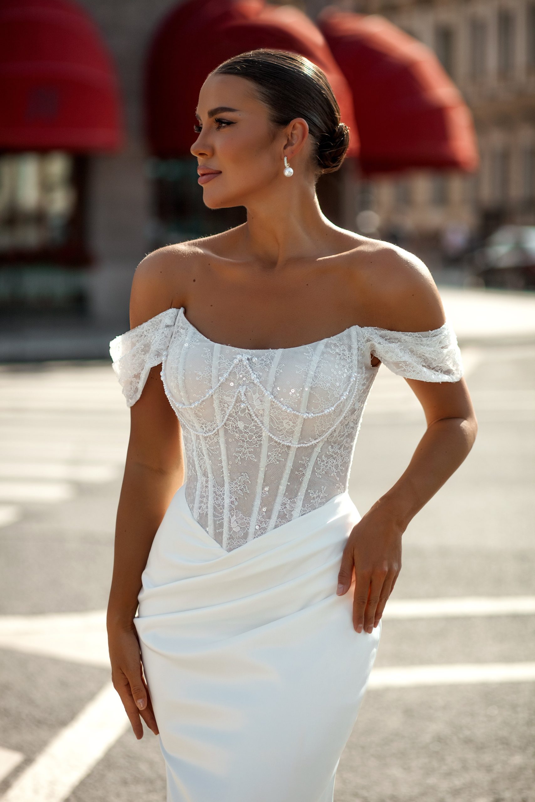 Элегантное, как кадр из старого фильма. Прозрачный корсет, тонкое кружево, мягкое драпирование на бёдрах и струящаяся юбка создают образ чувственный, но выдержанный. Для тех, кто выбирает чистую эстетику, уверенную женственность и стиль вне времени.