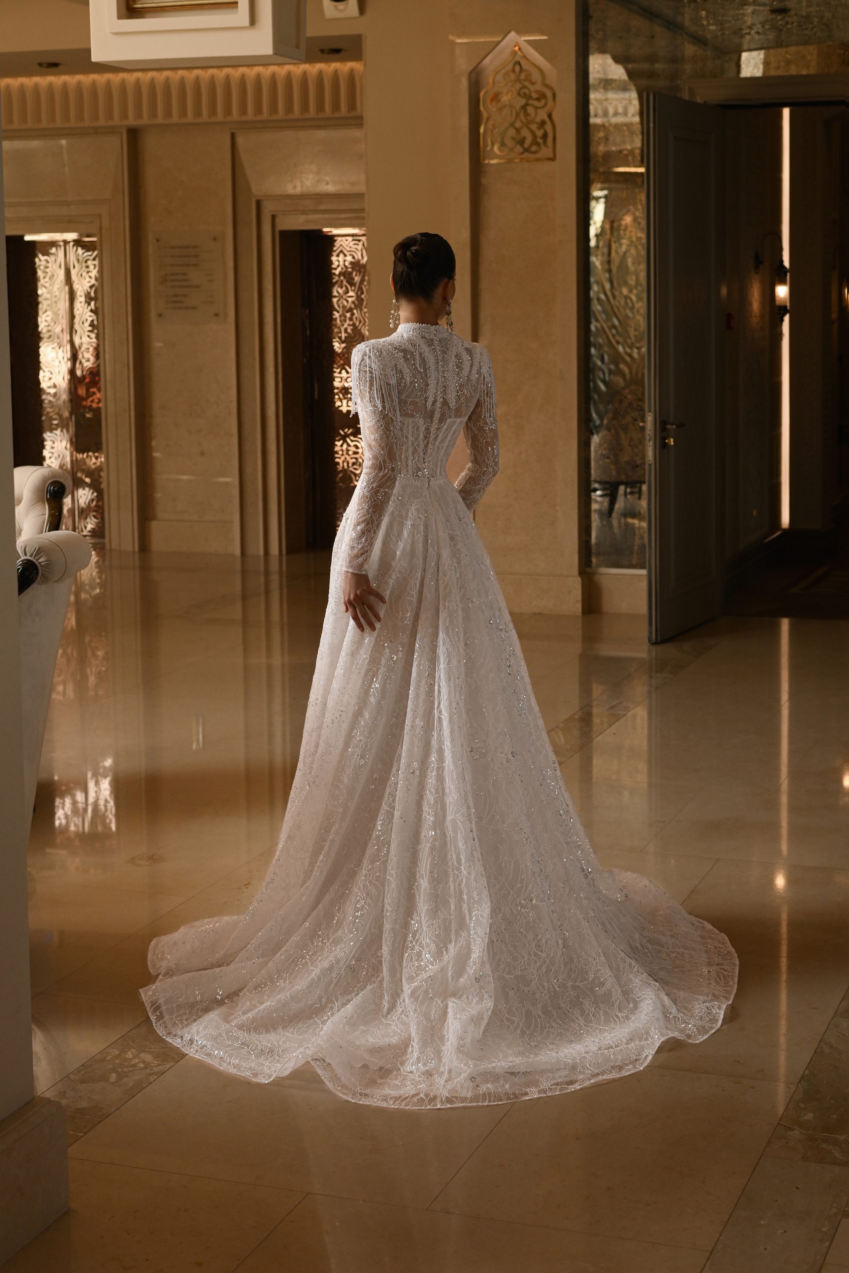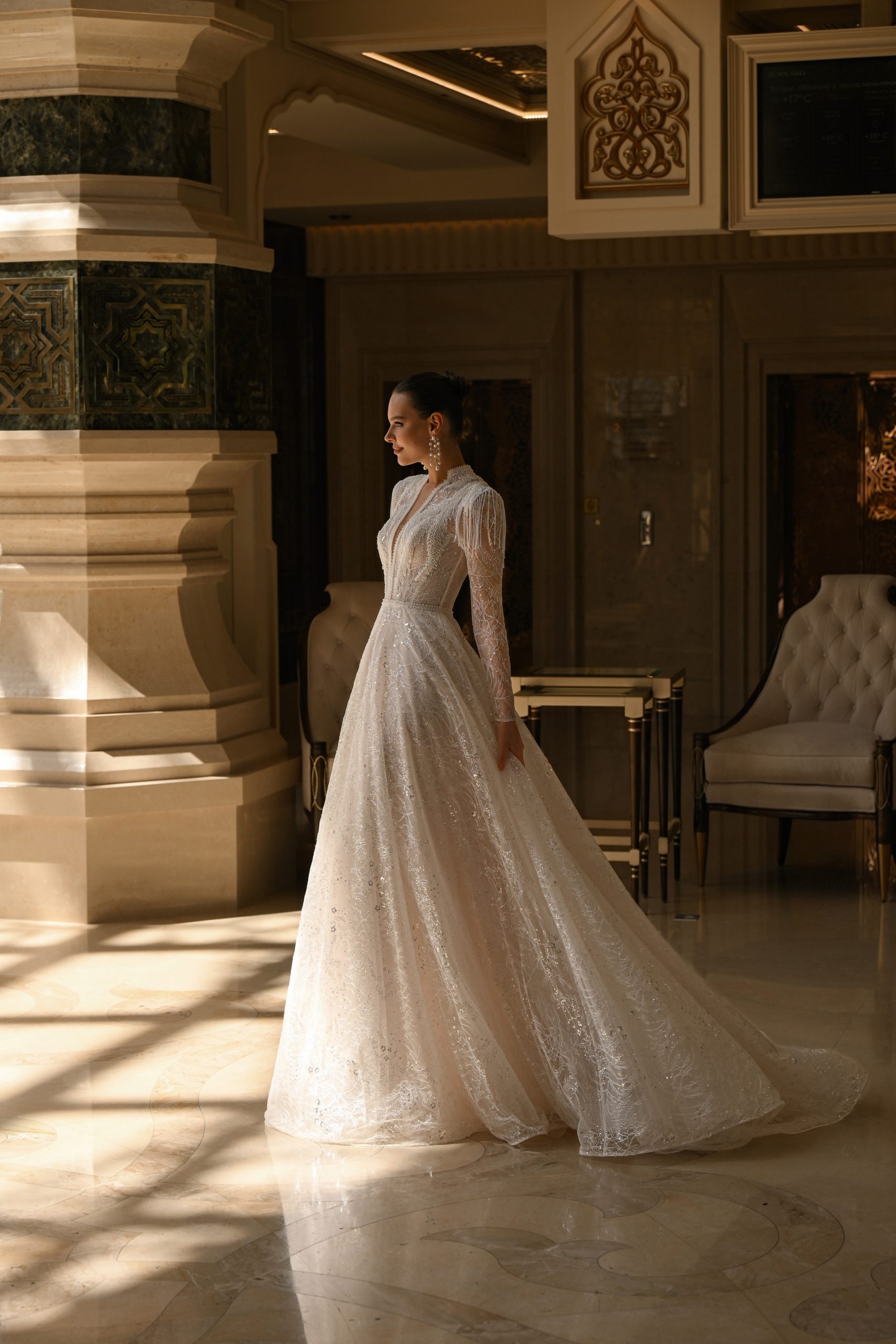 Юбка мягко раскрывается в идеальный А-силуэт, словно повторяя шаги невесты и усиливая эффект величия. Каждая пайетка и каждое плетение здесь работают на одно — сделать её образ по-настоящему незабываемым.