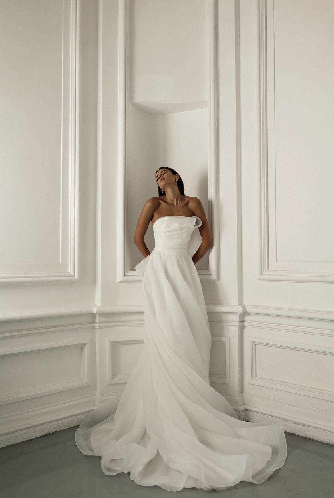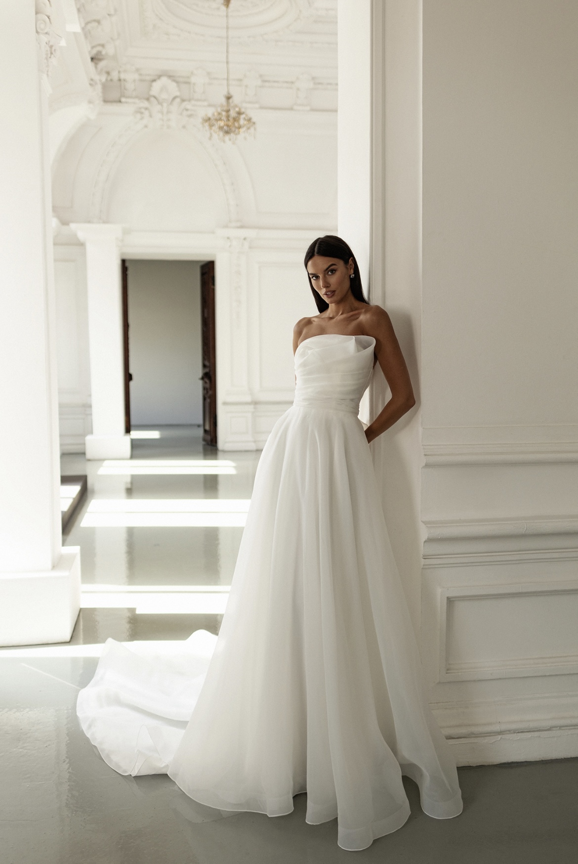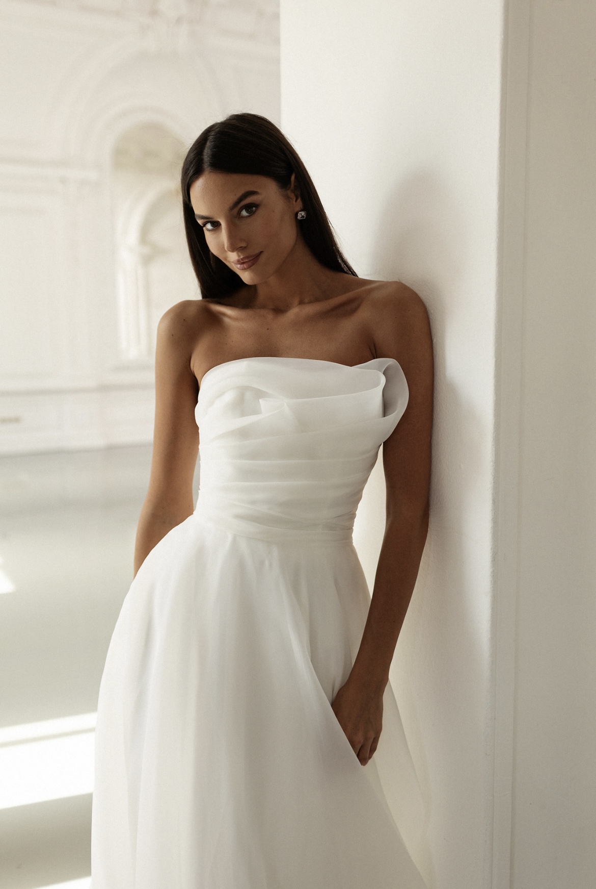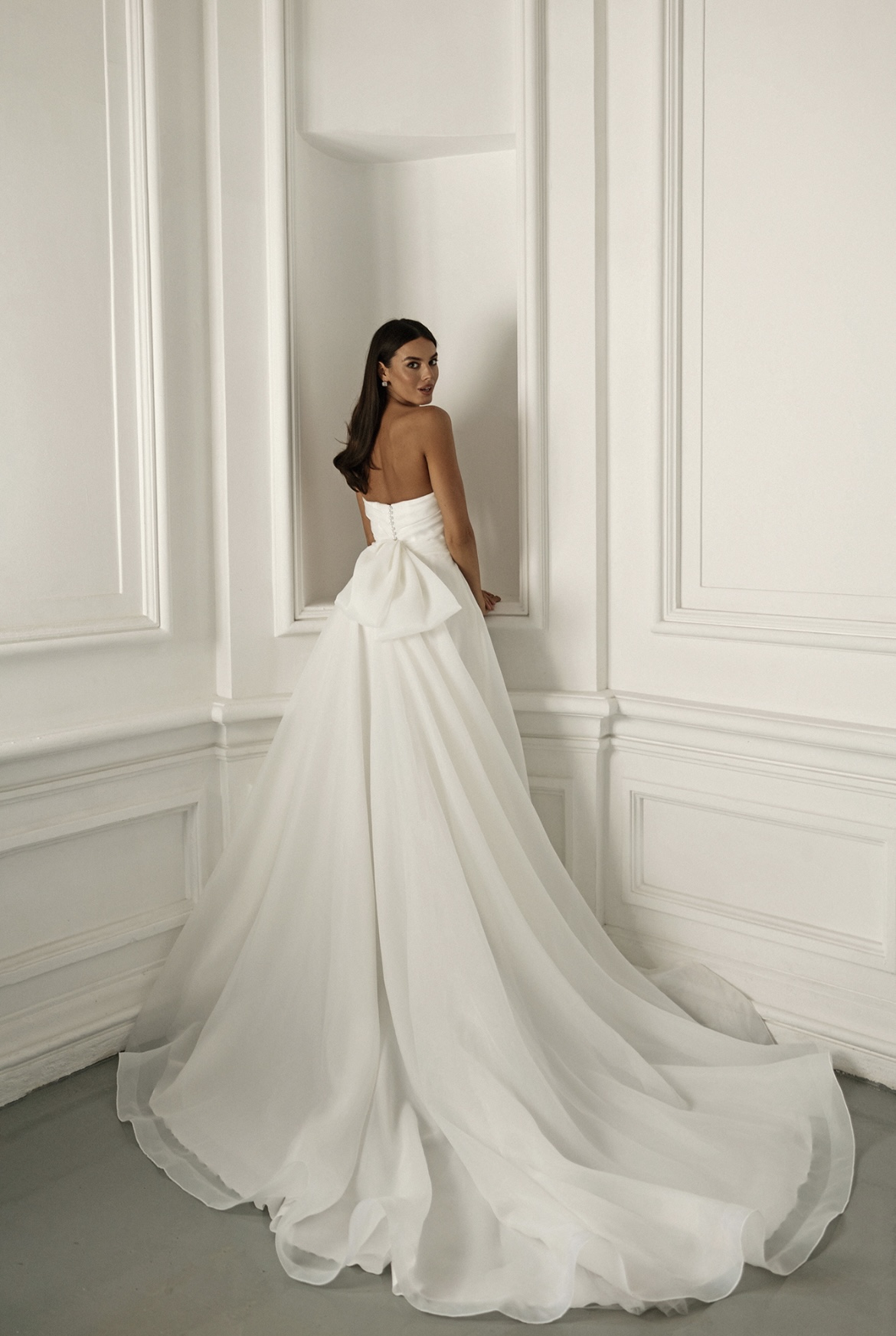 Нежное, воздушное свадебное платье. Пышная драпировка легкой органзы, ряд жемчужных пуговиц на спинке и крупный объемный бант. Платье идеально подходит для формирования образа классической невесты и гармонично смотрится во всех свадебных сезонах, а также универсально для любой свадебной локации.