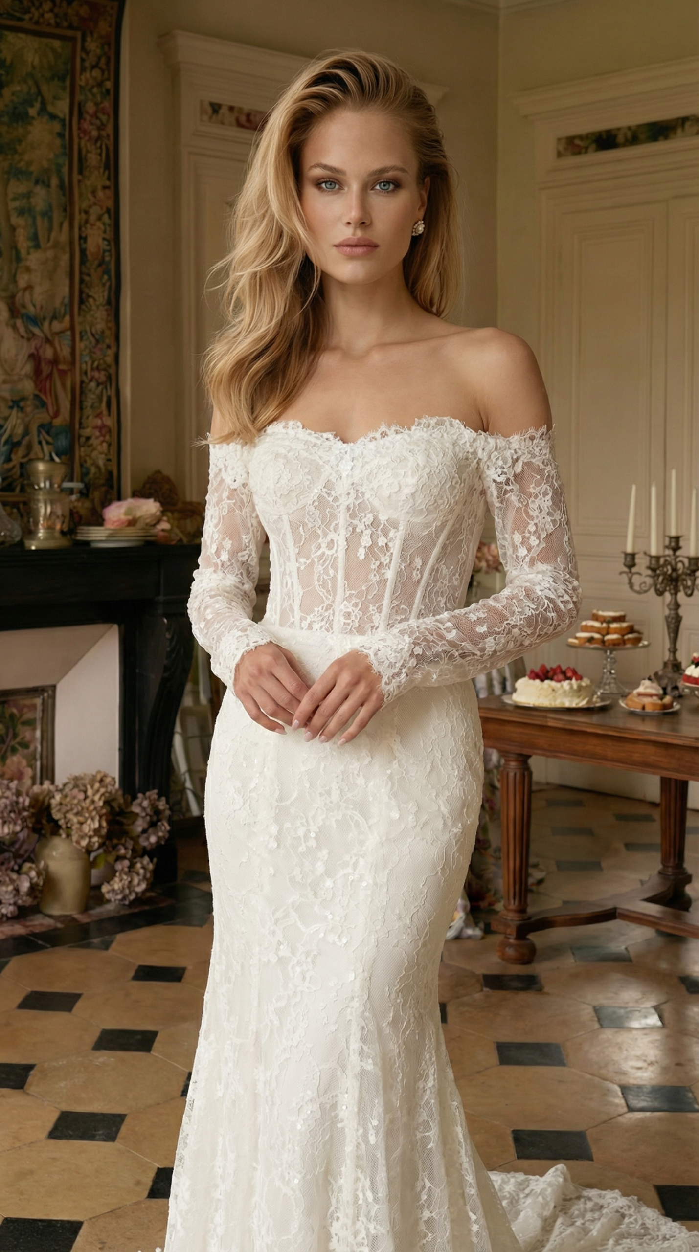 Платье, в котором нежность встречается с характером. Полупрозрачный кружевной корсет мягко подчеркивает силуэт, открытая линия плеч добавляет чувственности, а изящные рукава создают ощущение утонченной аристократичности. Юбка-рыбка плавно повторяет изгибы фигуры и раскрывается в изысканный шлейф, оставляя за невестой тонкий кружевной след.