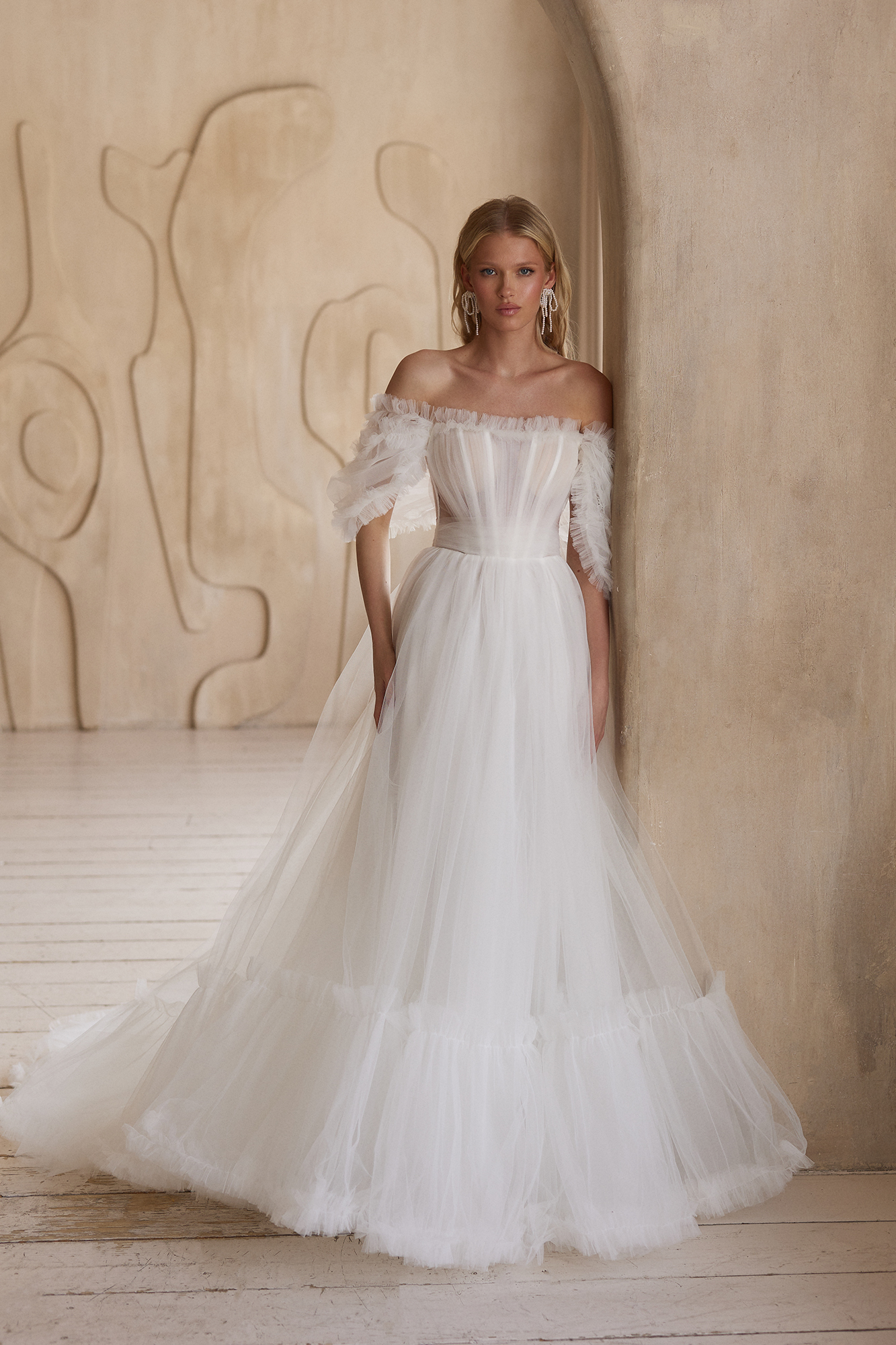 Воплощение сдержанной роскоши и чувственности. Облегающий силуэт красиво подчёркивает фигуру, а струящийся декор из вышивки и пайеток создаёт деликатное мерцание при каждом движении. Спущенные плечи придают образу воздушность и романтичную нотку.