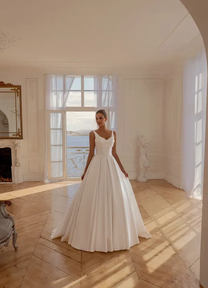 Словно танец в платье. Фиеста сочетает корсет с деликатной вышивкой и объемную юбку с высоким разрезом, открывающим ногу красиво и дерзко. Контраст фактур создаёт эффект «вау» даже без дополнительных аксессуаров. Для невест, которым хочется блеска, лёгкости и движения в каждом шаге.