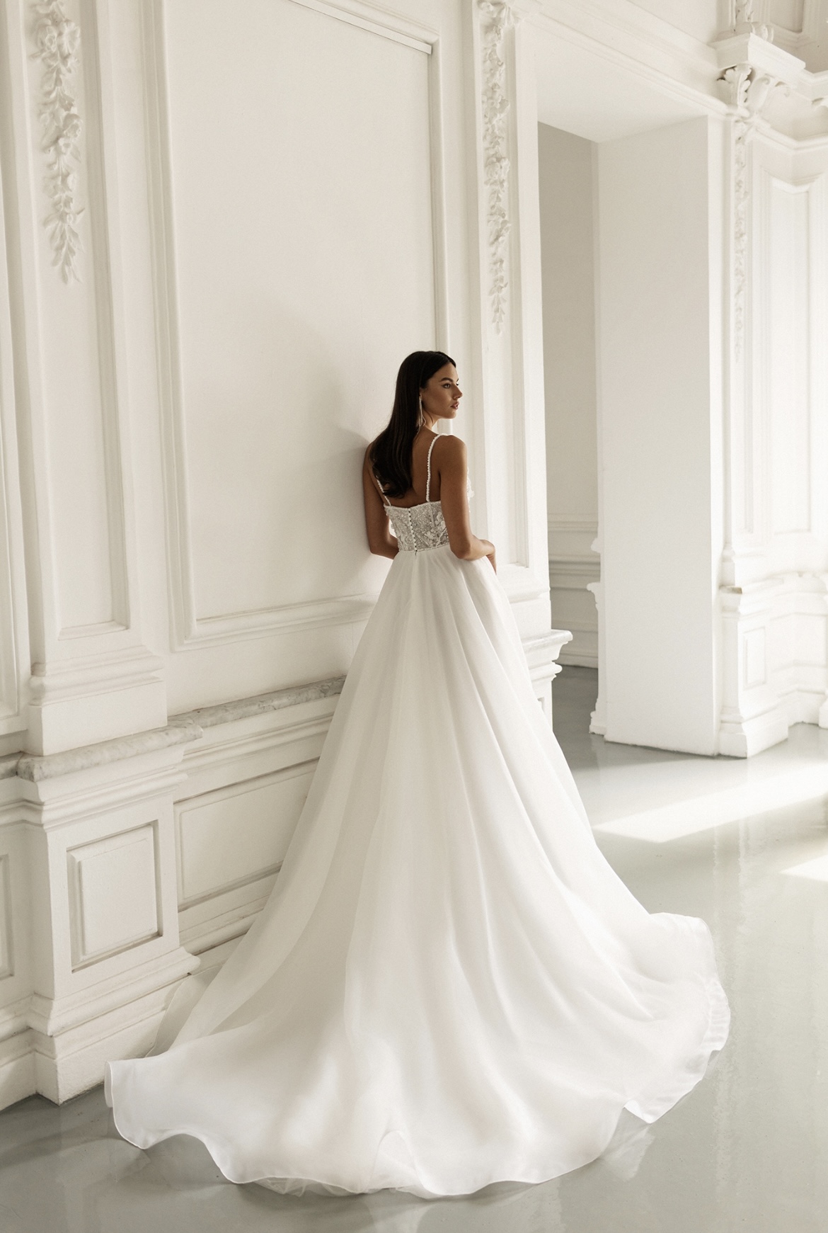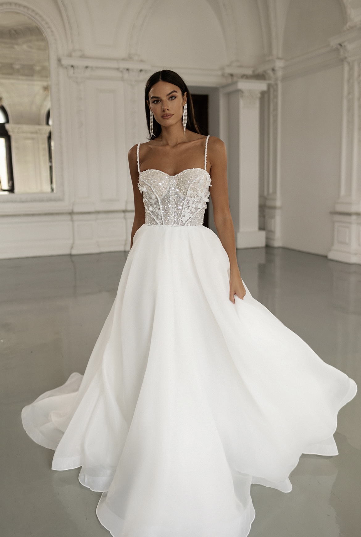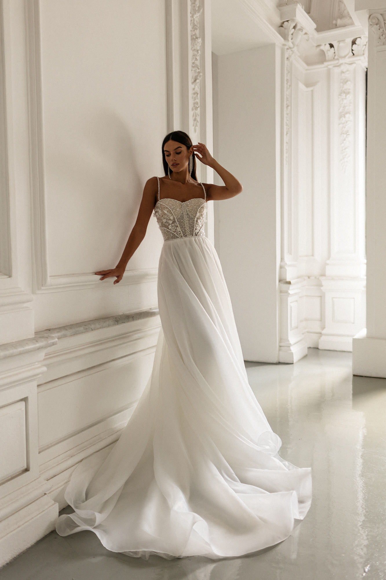 Романтичное свадебное платье с открытым ажурным лифом. Это свадебное платье подойдет для тех, кто мечтает о сказочной свадьбе в стиле принцессы. Оно идеально подойдет для свадьбы на природе или в роскошном зале.