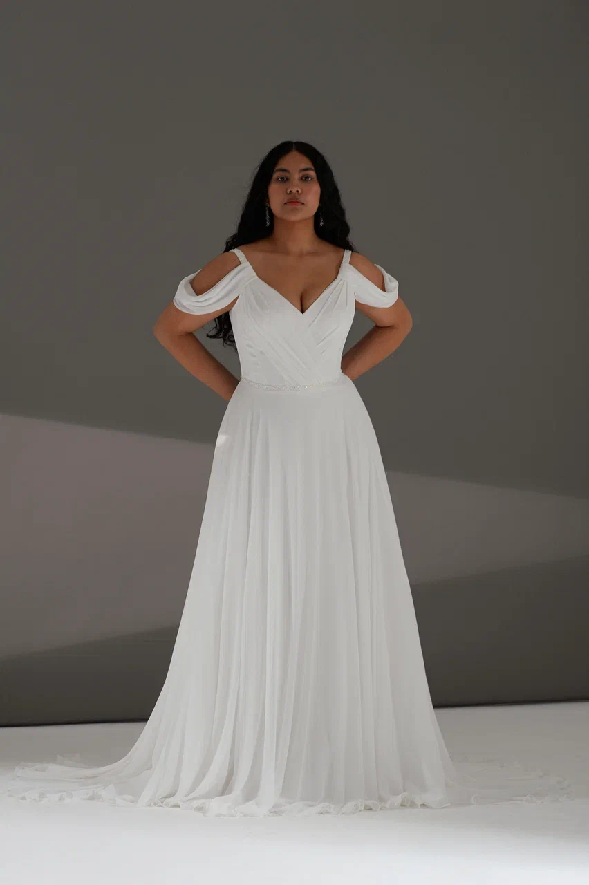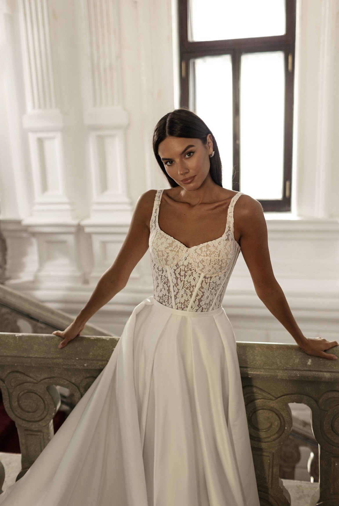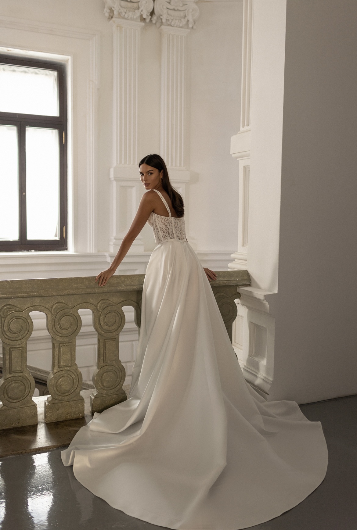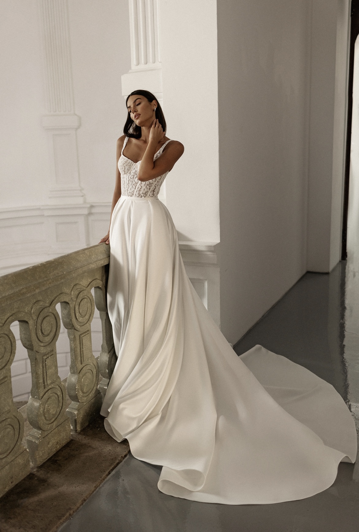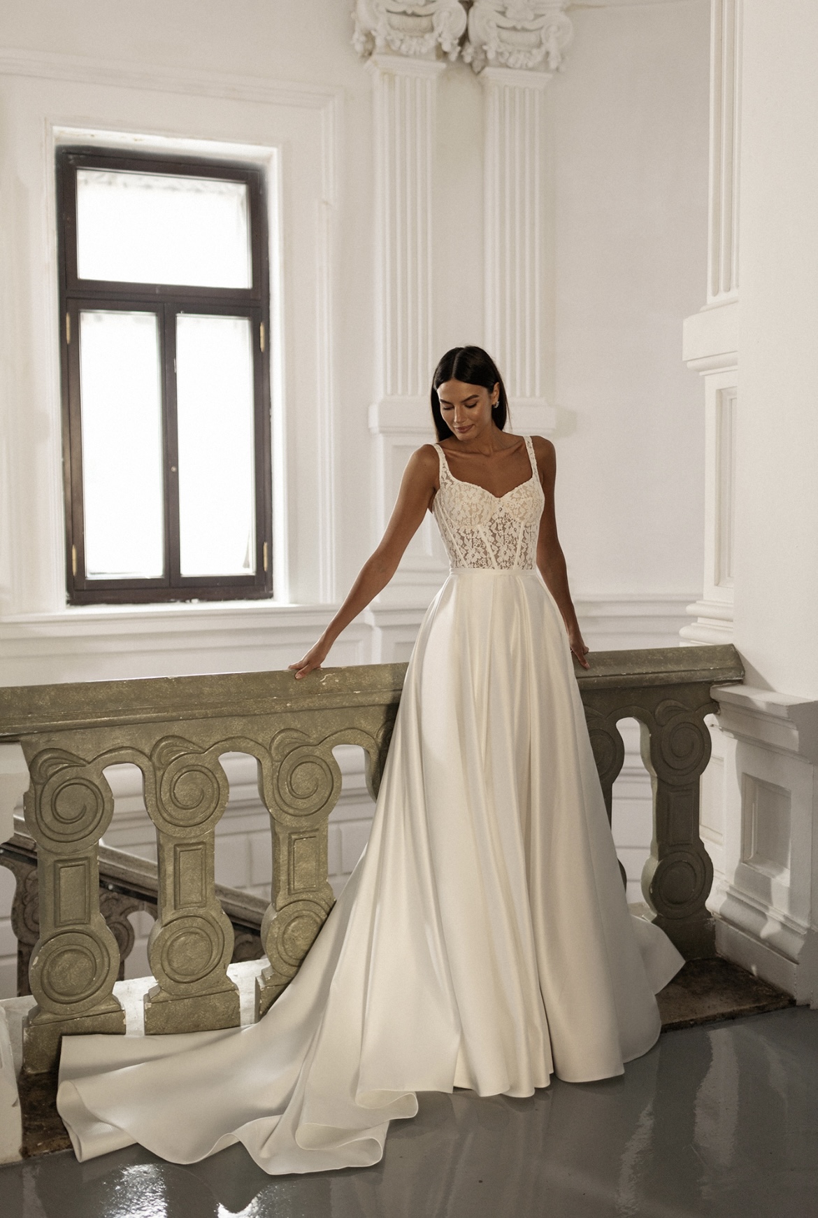Нежное атласное свадебное платье с открытым ажурным верхом. Платье прекрасно подходит для любого свадебного сезона и не привязано к определенной стилистической идее.