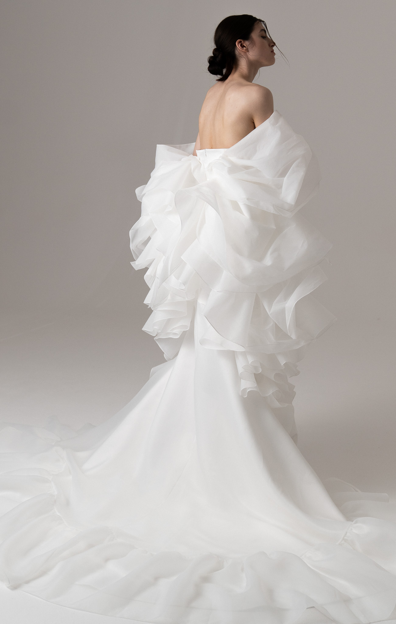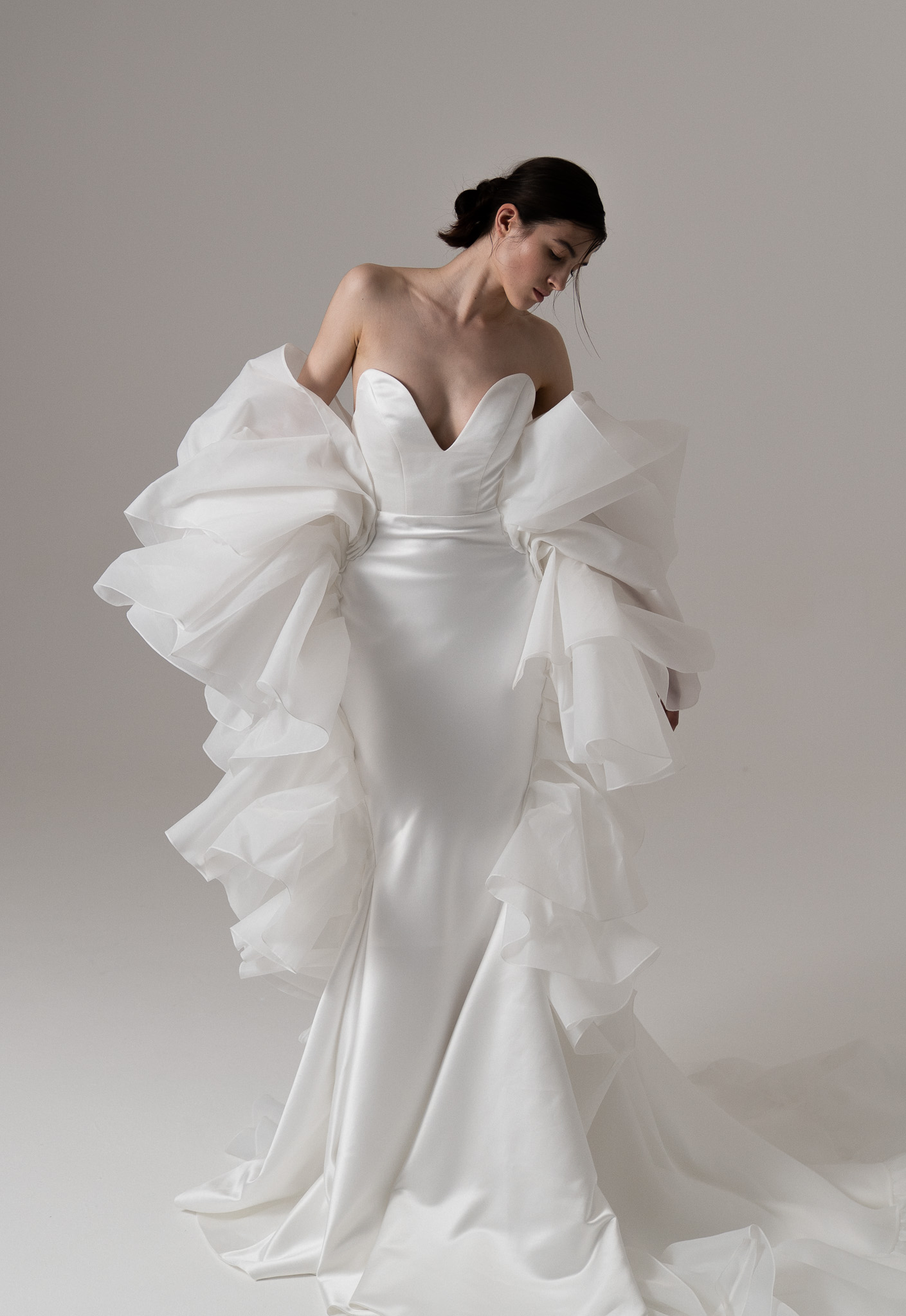 Платье вне рамок, вне времени, вне конкуренции. Эксклюзивная модель, созданная для тех, кто не ищет компромиссов. Матовый атлас, глубокий вырез, чистый корсет, идеальная посадка по фигуре — и взрывная архитектура объёмных воланов из органзы создает эффект, который невозможно забыть. Ты в нём — не просто невеста, ты fashion-героиня своего дня.