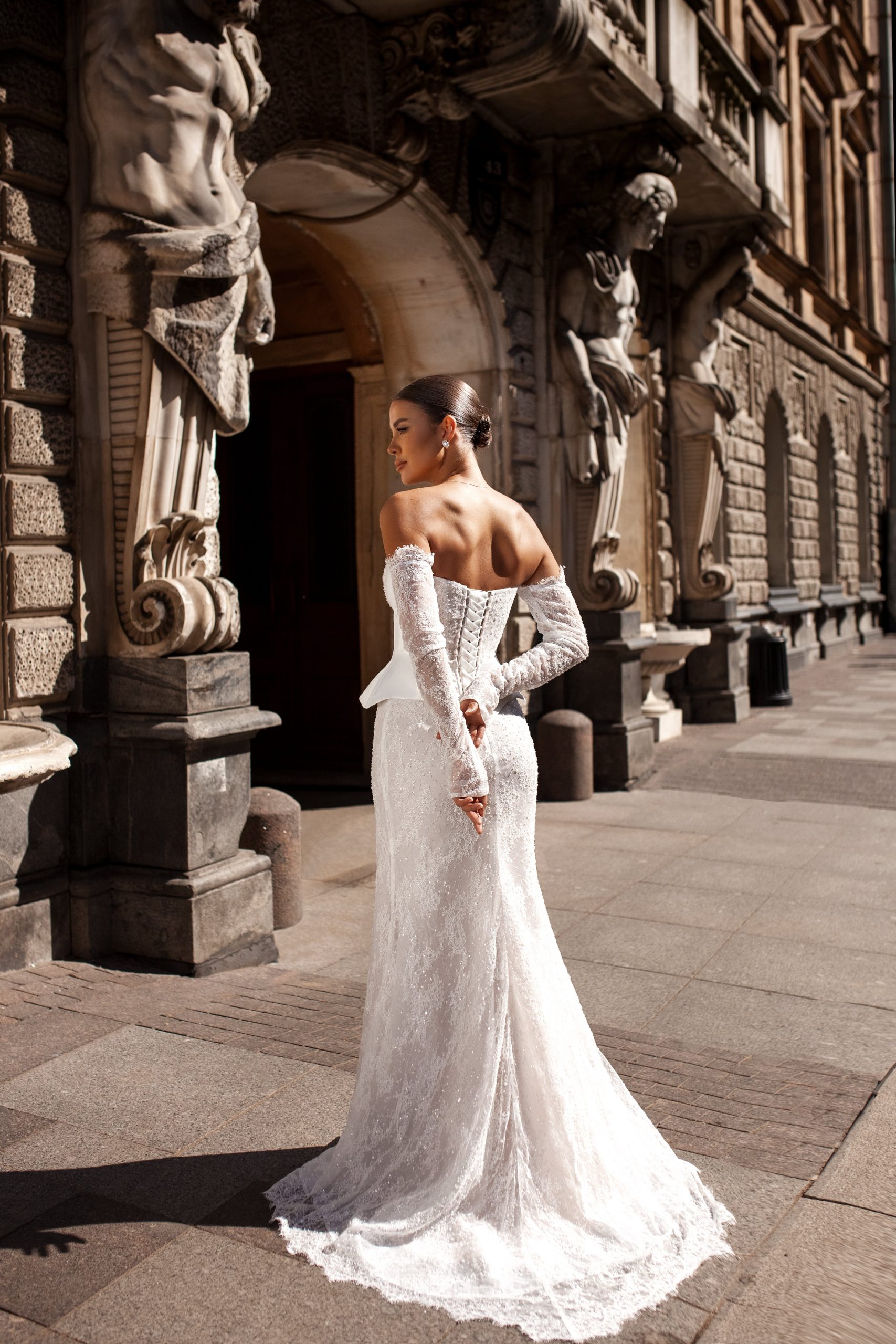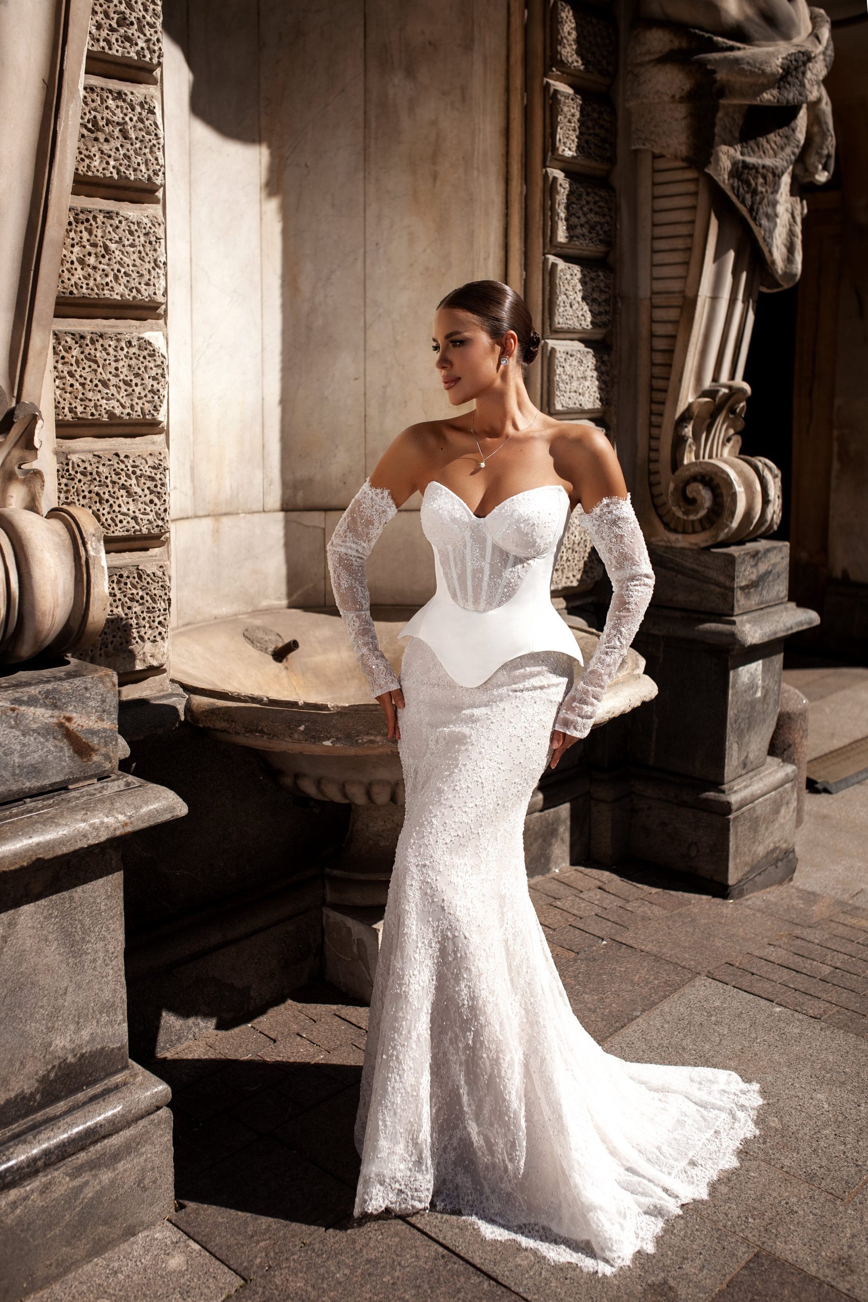 Платье, которое рисует силуэт. Сияющее кружево, облегающий силуэт и скульптурный корсет с подчёркнутой талией делают этот образ настоящим произведением свадебного искусства. Плавные линии, открытые плечи и съёмный акцент в виде жёсткого корсетного элемента создают баланс между драмой и женственностью.