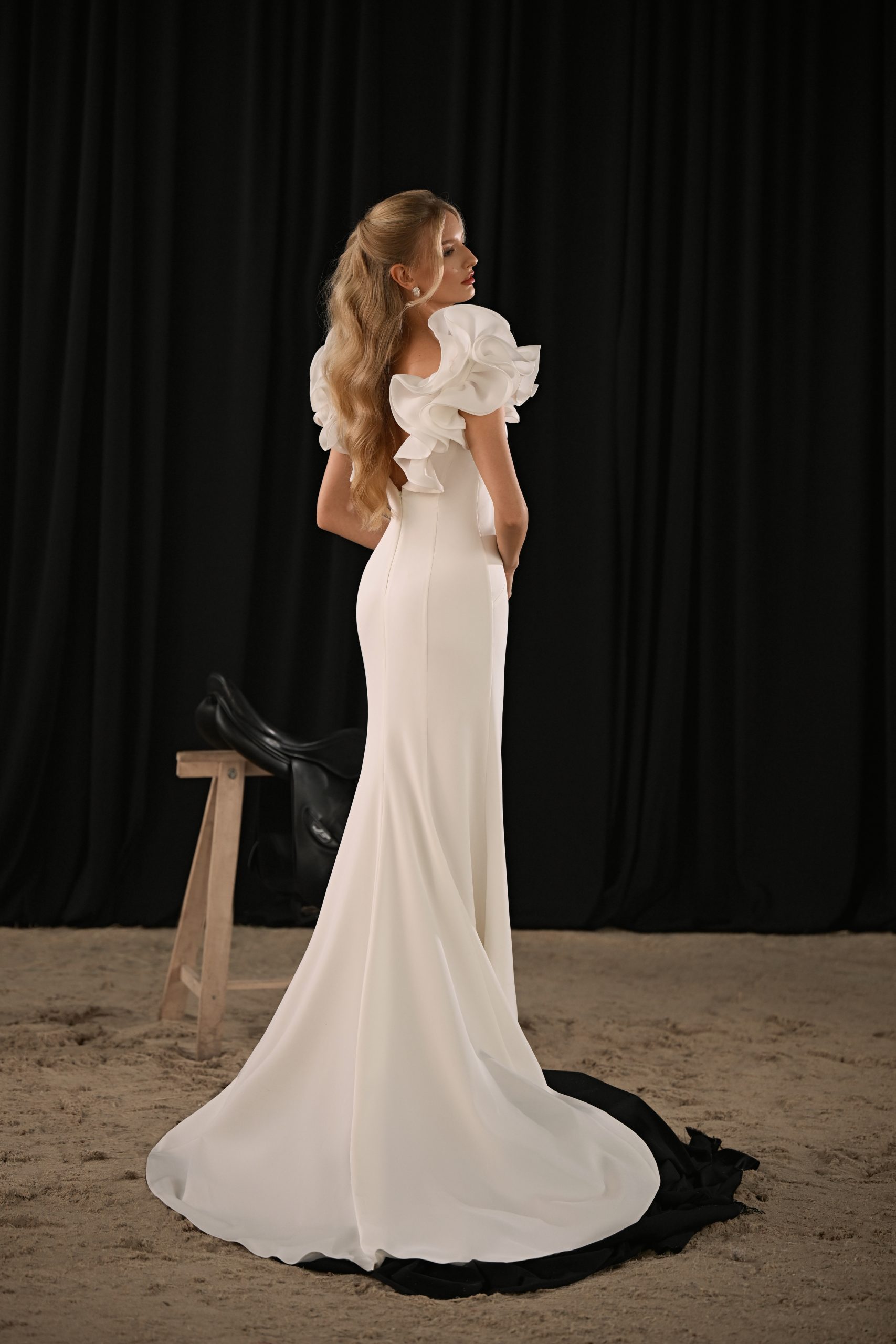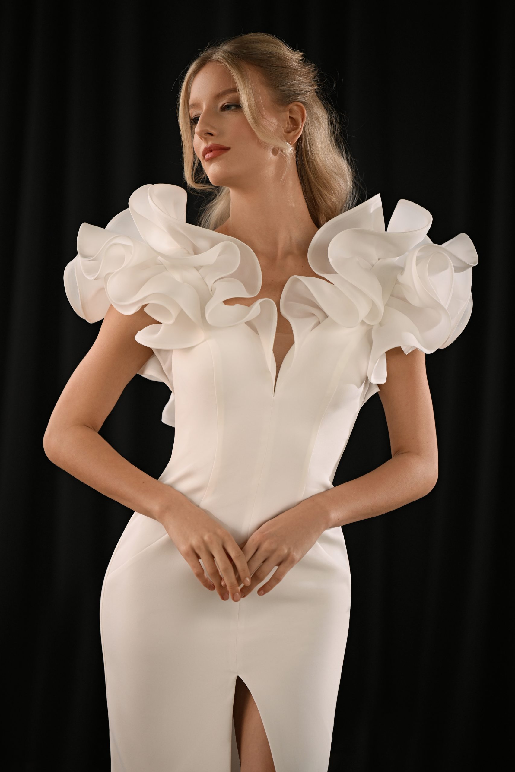 Смелое и безупречно женственное. Объёмные воланы на плечах создают эффект движения и легкости, а прямой силуэт с разрезом добавляет утончённой дерзости.