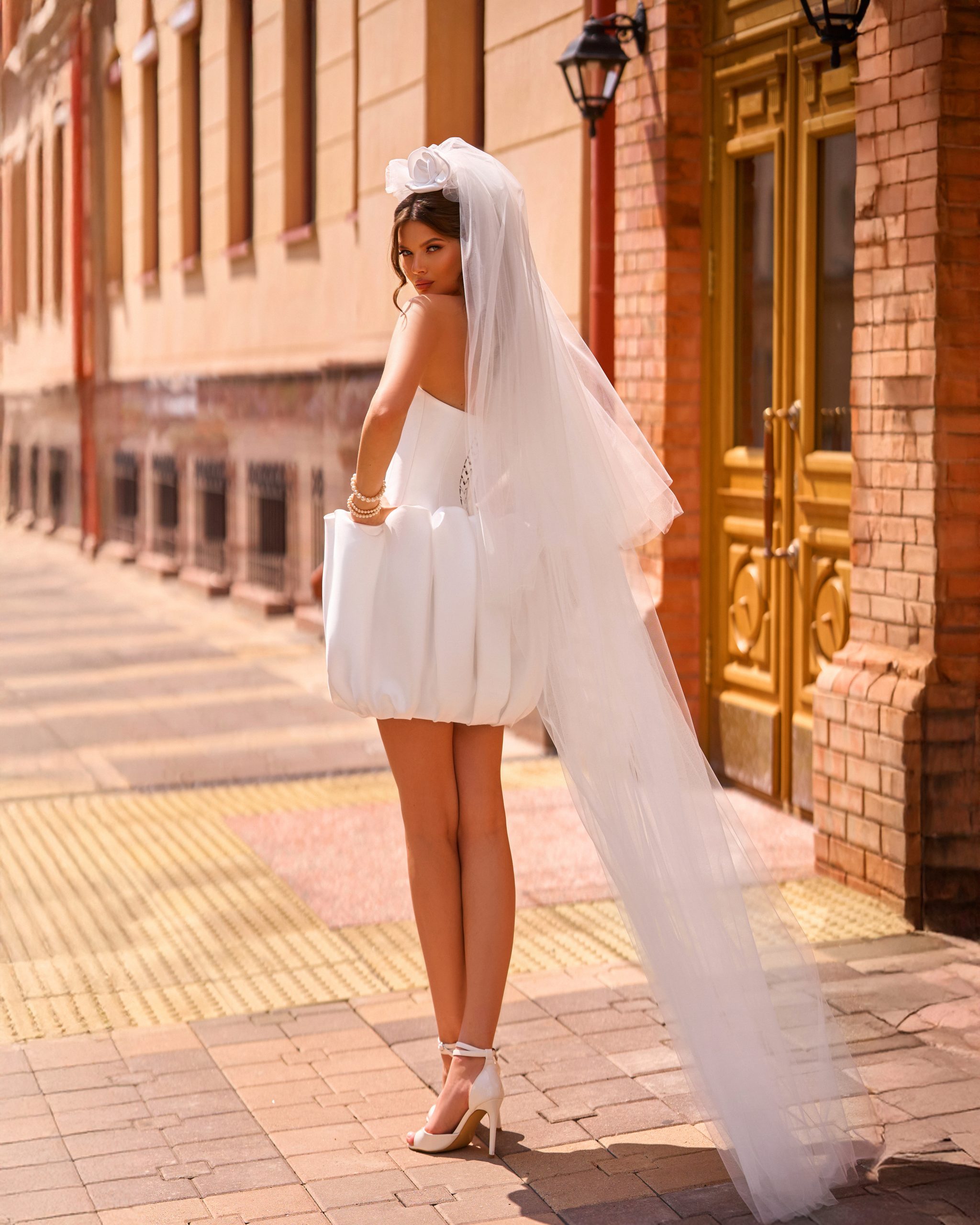 Это платье для невесты, которая не боится выделяться и предпочитает игривые, но элегантные образы.