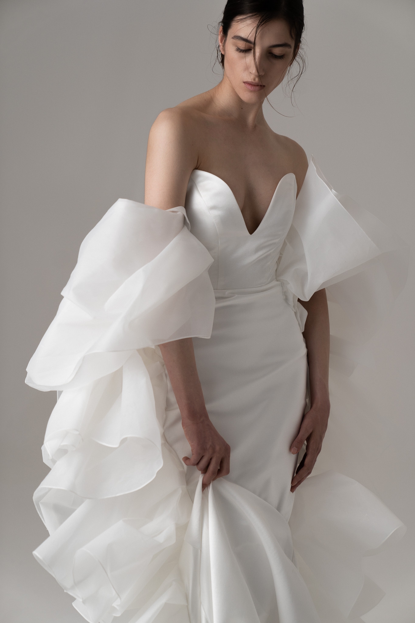 Платье, которое танцует вместе с тобой. Лёгкие сборки из шифона, воздушная ткань и романтичные завязки на плечах — всё в этом платье зовёт к движению. Оно будто создано для того, чтобы кружиться, влюбляться и запоминать каждый момент. Выбор невесты, в которой живёт свобода, лёгкость и немного дерзости.