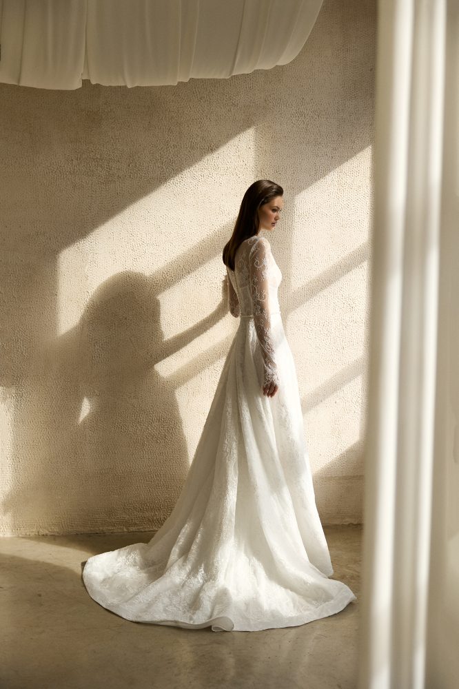 Стильное атласное платье с кружевными рукавами и разрезом. Прекрасный вариант, который гармонично смотрится на открытых площадках летних свадеб и в окружении гламурных интерьеров