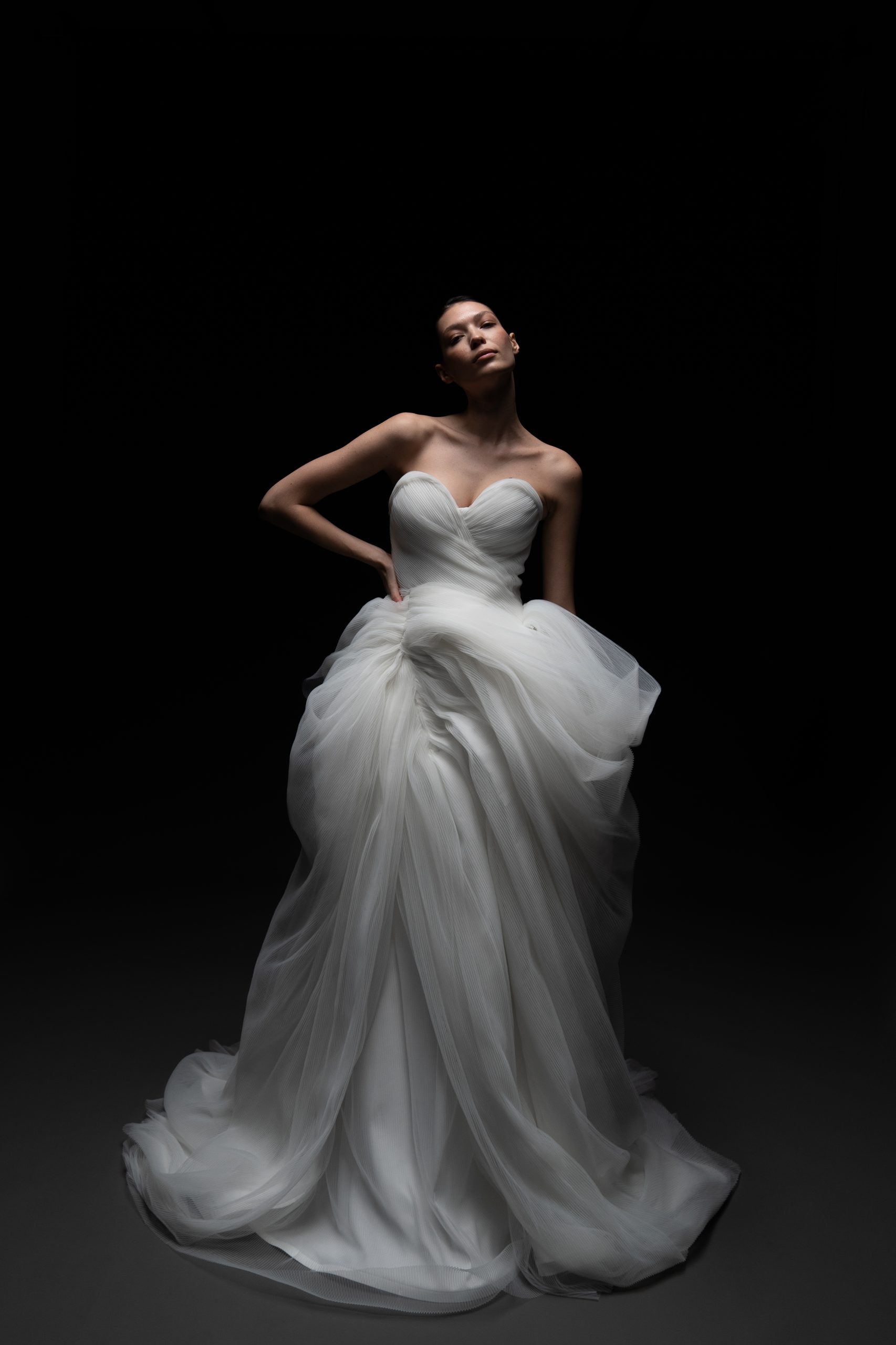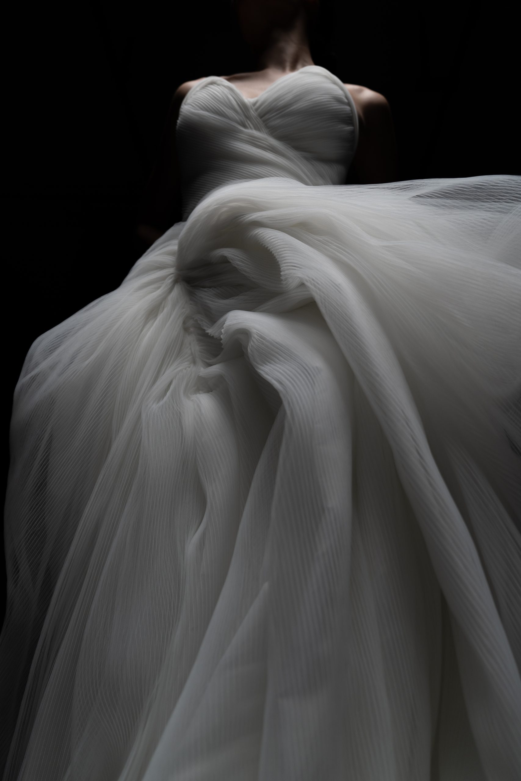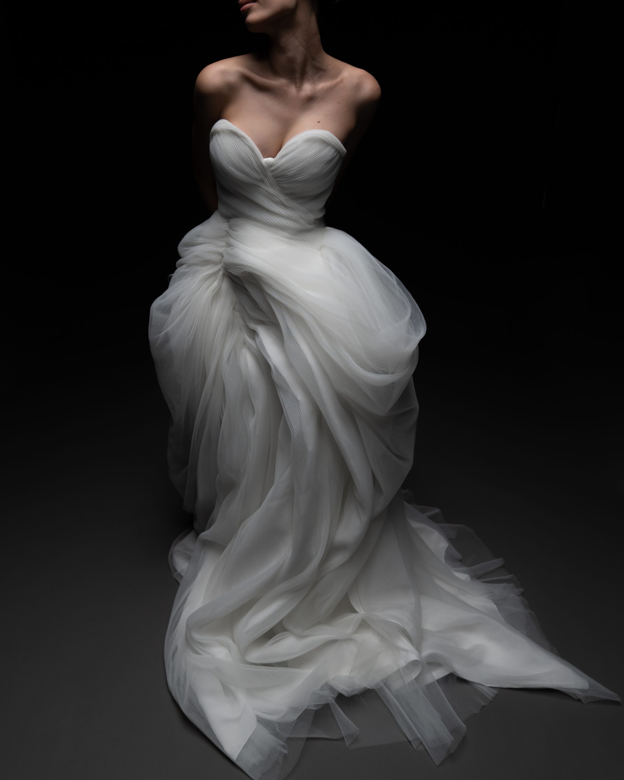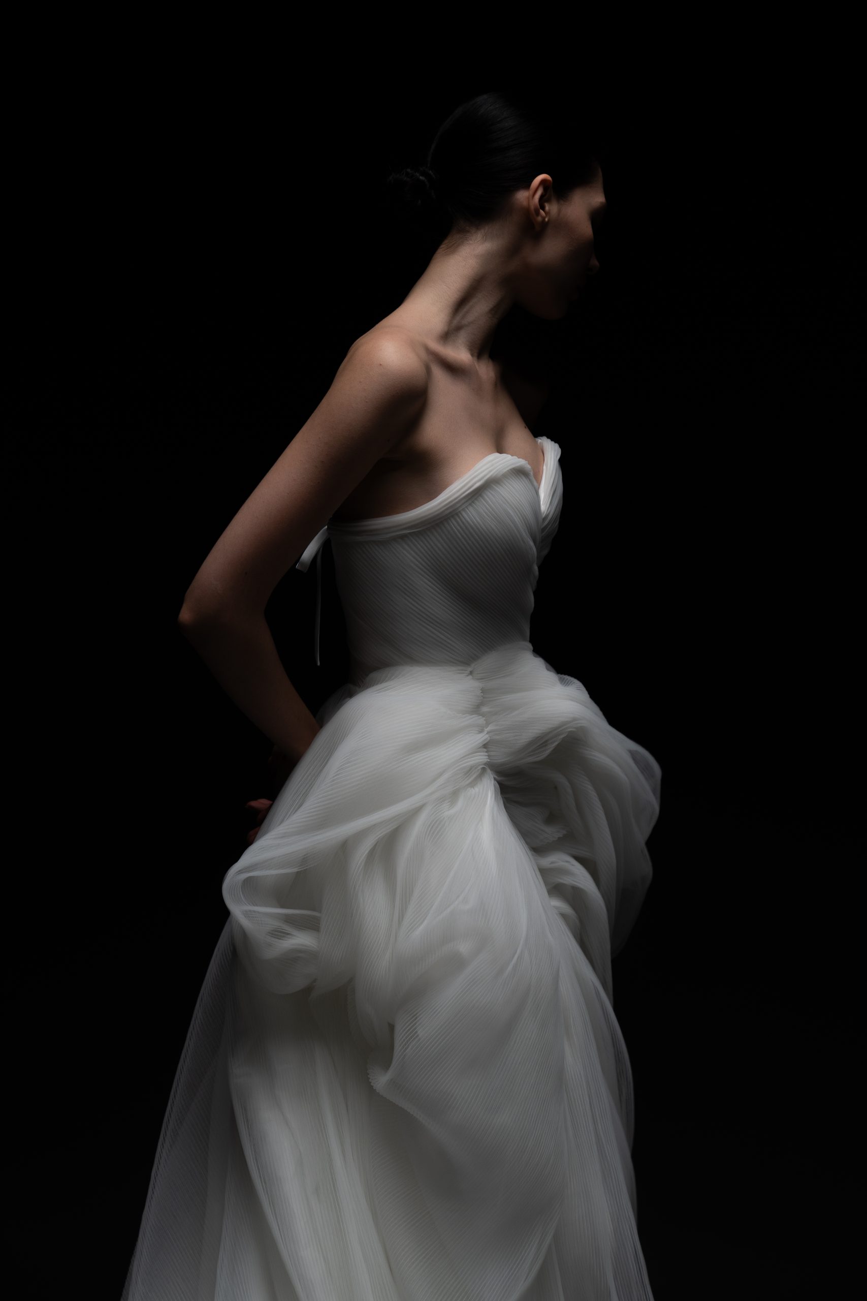 Платье, где ткань превращается в скульптуру. Воздушные складки струятся, как мраморные драпировки, создавая игру света и тени при каждом движении.