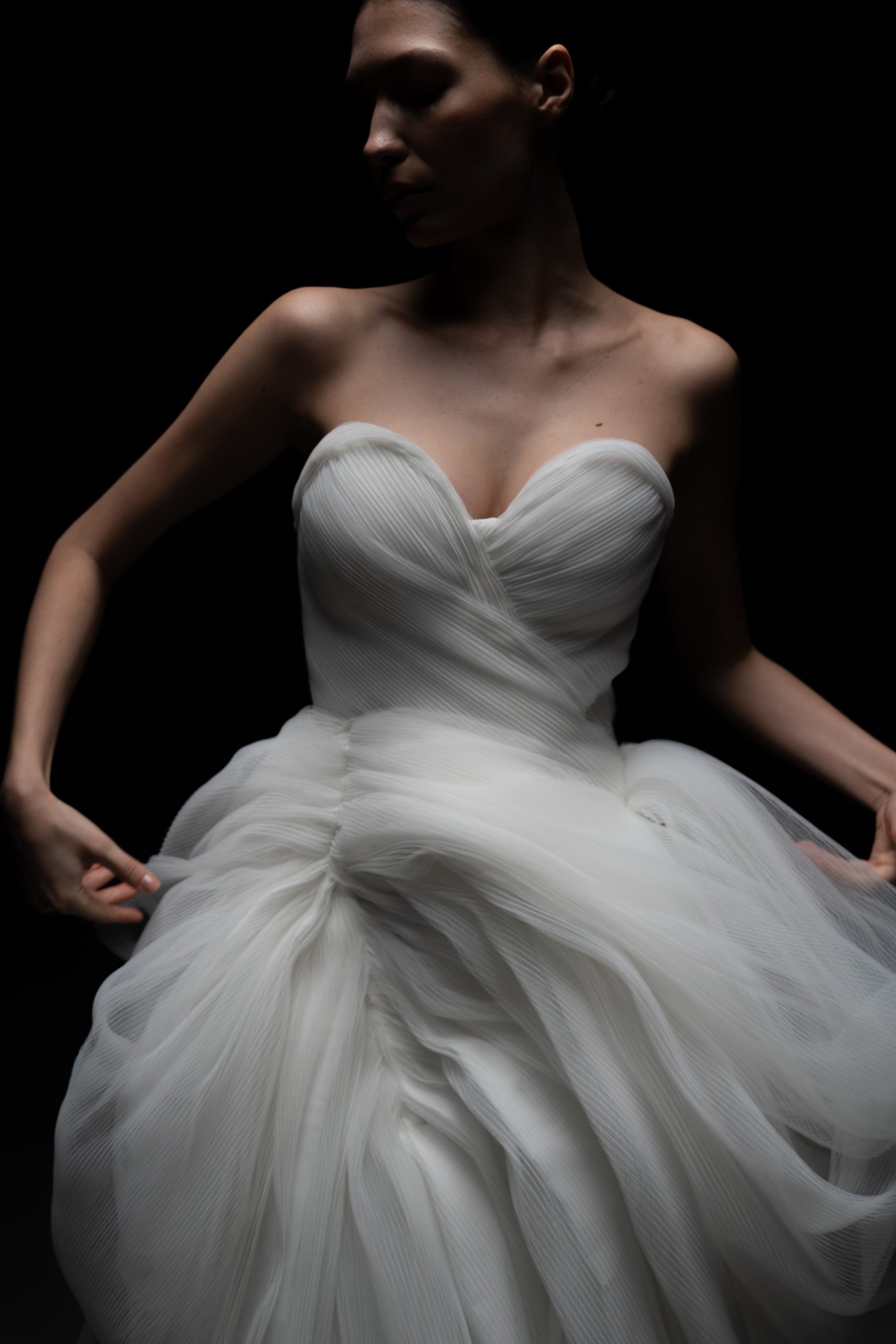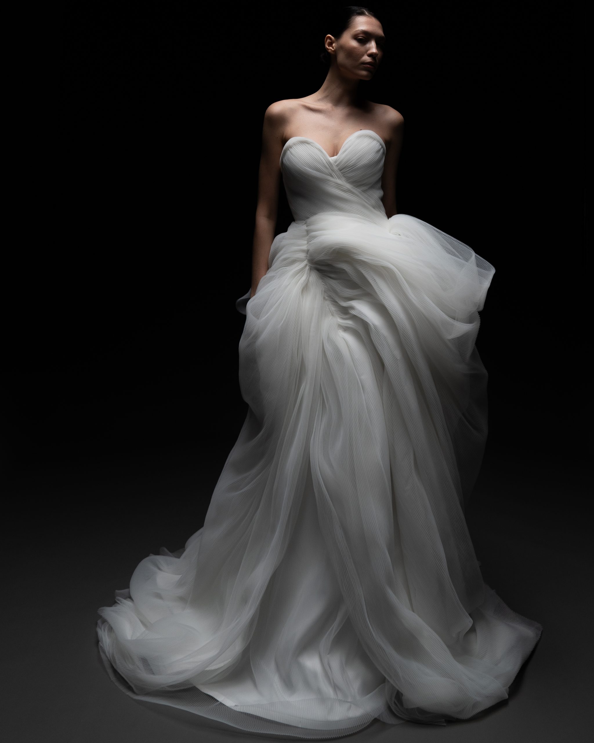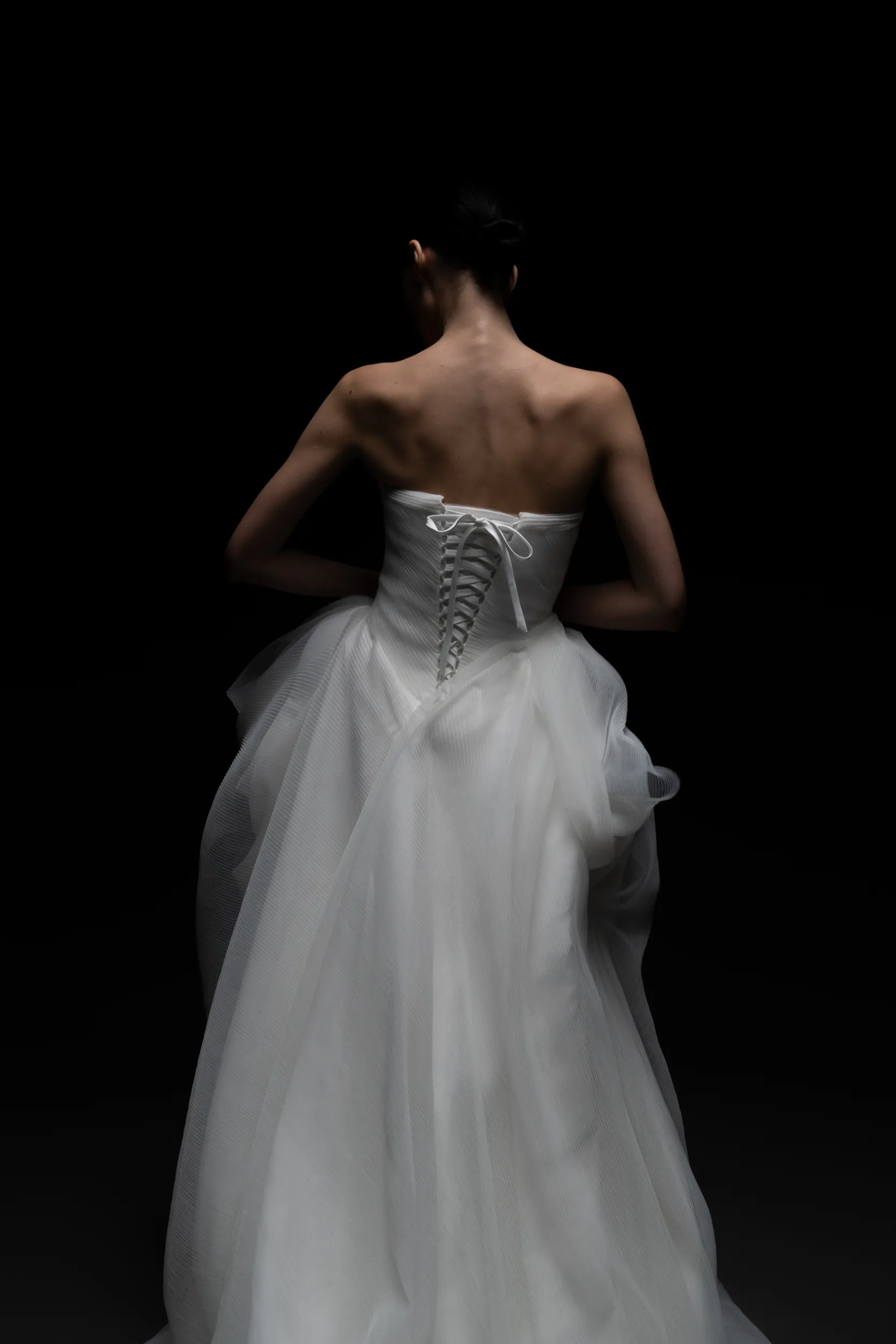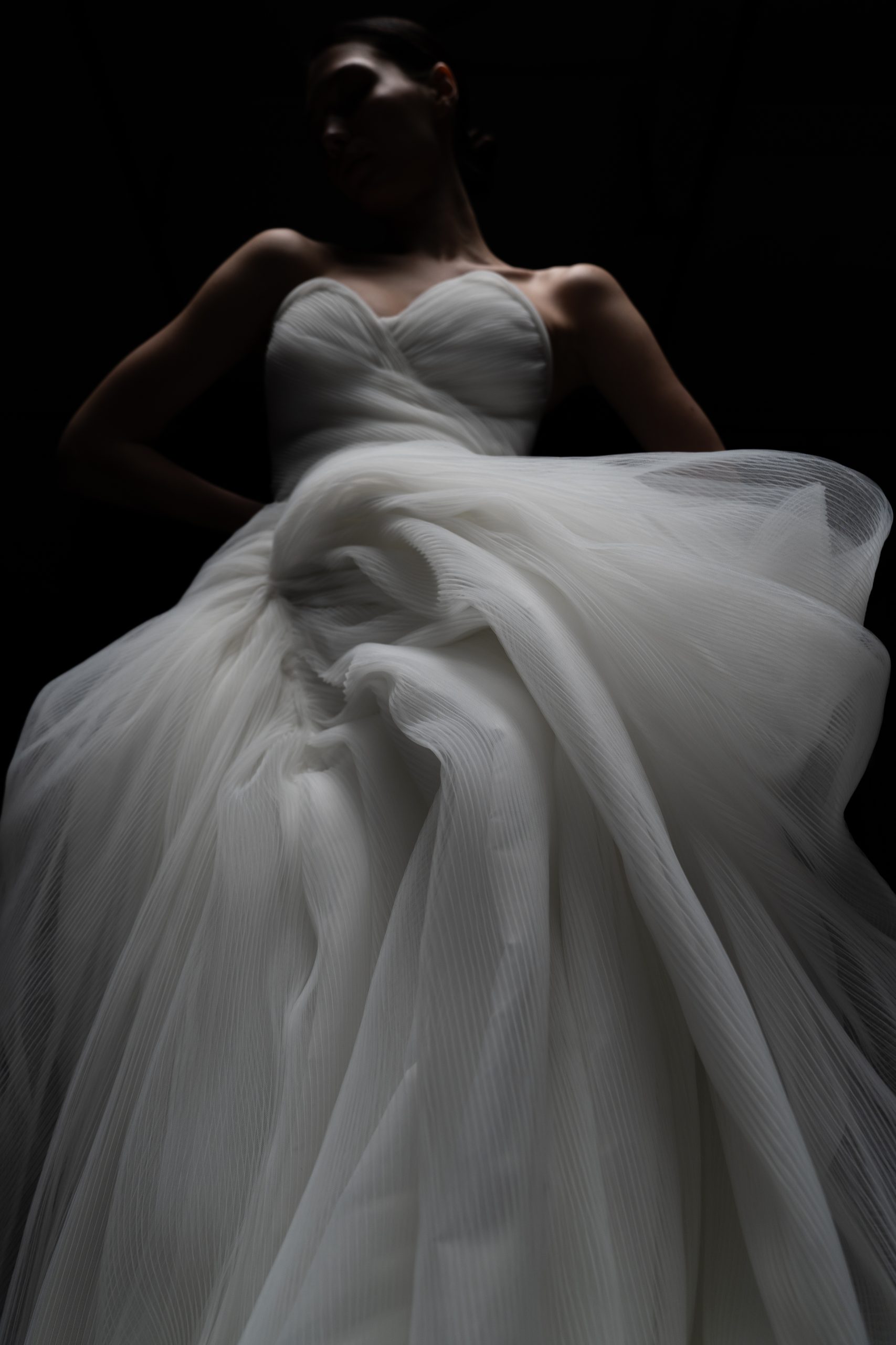 Платье, где ткань превращается в скульптуру. Воздушные складки струятся, как мраморные драпировки, создавая игру света и тени при каждом движении.