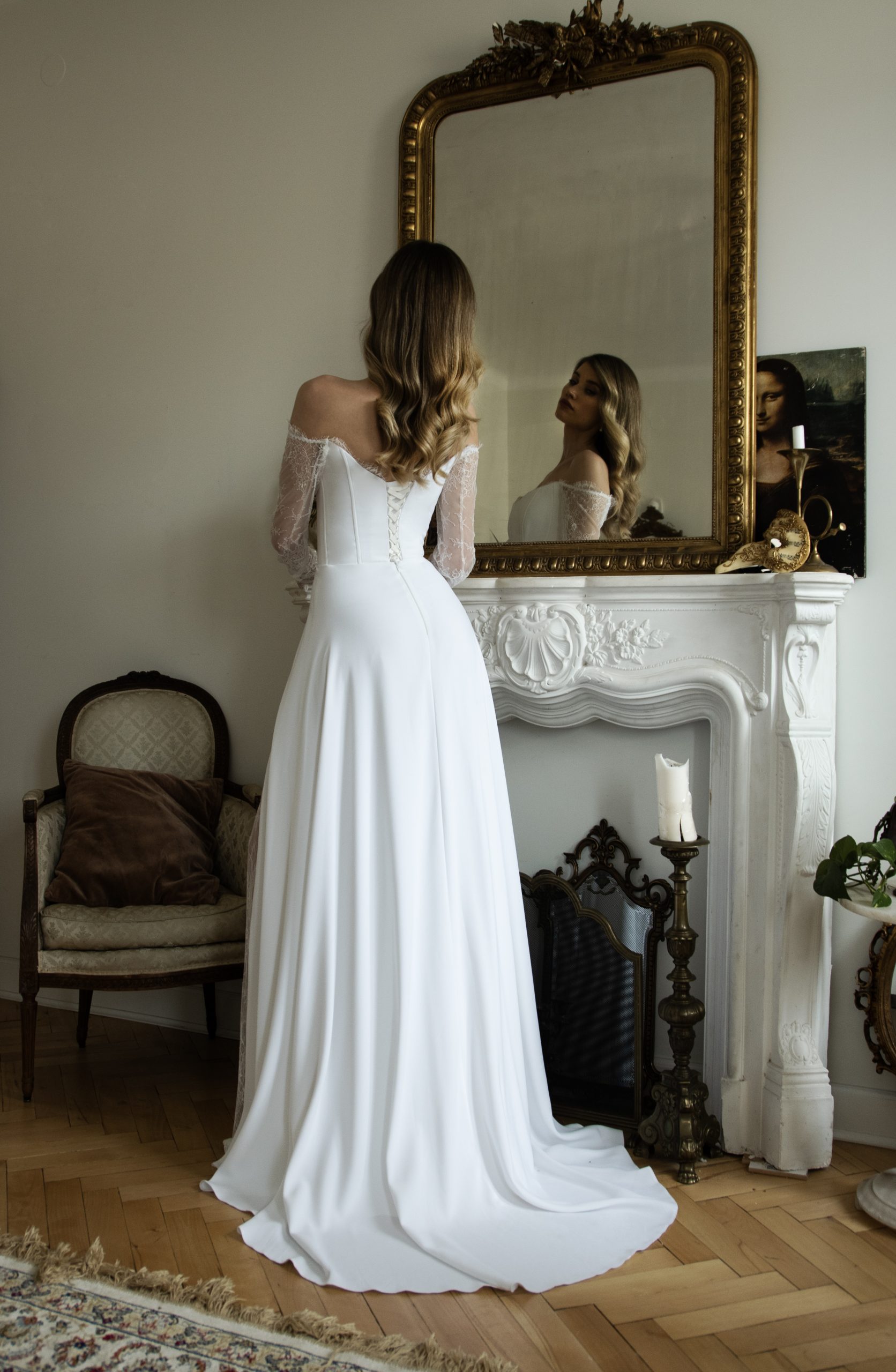 Платье, в котором чувствуется та самая винтажная роскошь, будто кадр из старинного фильма о большой любви. Открытые плечи создают утончённую линию декольте, корсет мягко собирает силуэт, а кружевные рукава и высокий кружевной разрез добавляют хрупкости и женственности.