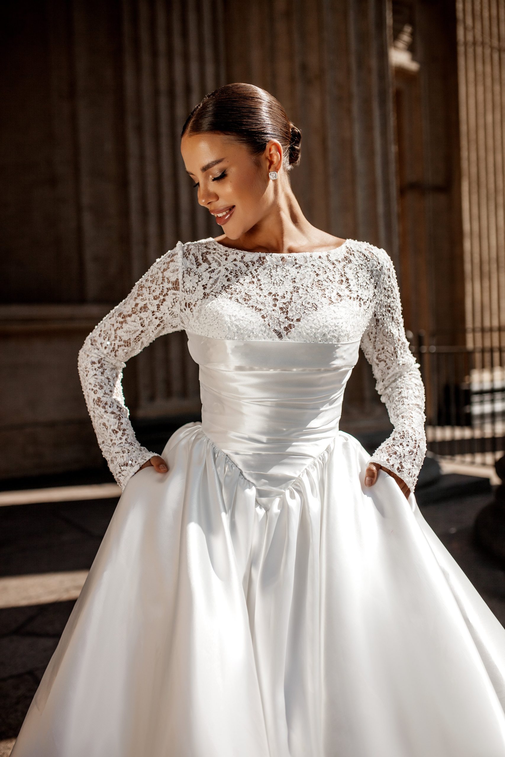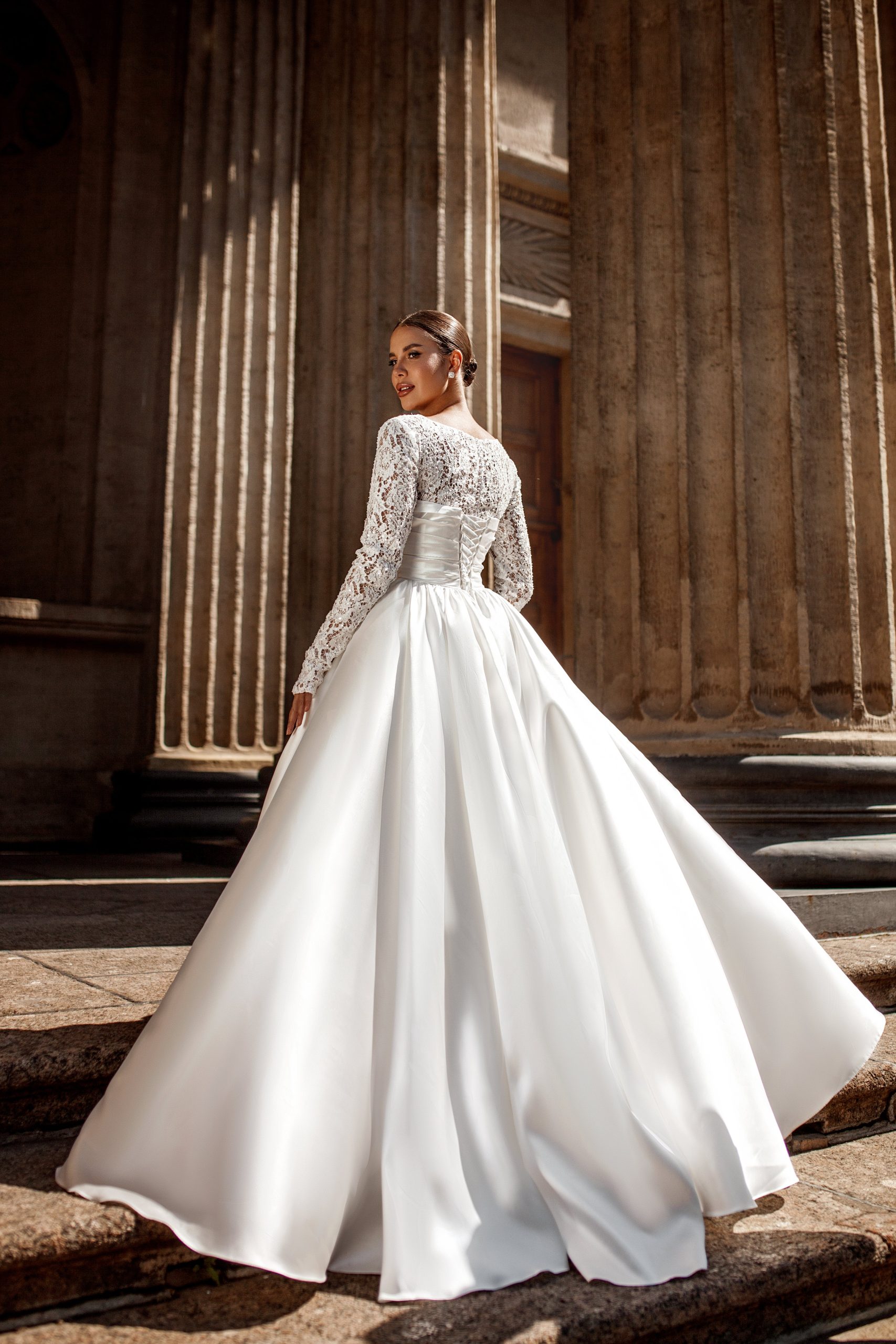 Изысканный атлас, пышная юбка и деликатное кружево на лифе и рукавах создают образ, который словно сошёл с кадров королевской свадьбы. Высокая посадка подчёркивает талию, а фактура ткани играет на свету, придавая платью глубину и благородство.