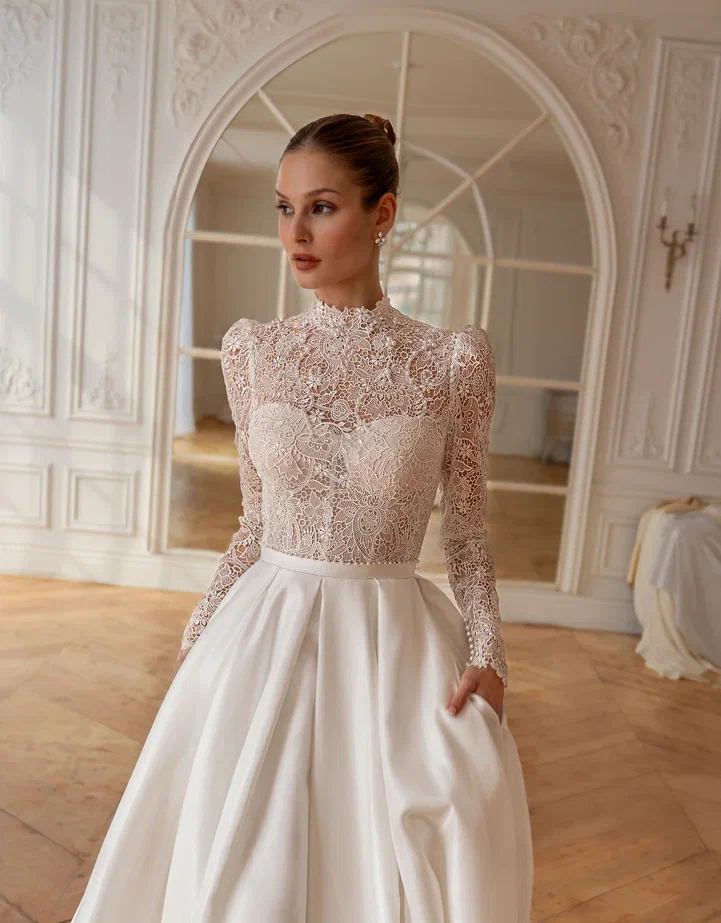 Платье Лаври — это чистая аристократия, воплощённая в свадебном образе. Верх из тончайшего кружева с высоким воротником создаёт изящный винтажный силуэт. Приталенный корсет подчёркивает талию, а аккуратные плечики и длинные рукава добавляют образу утончённости.