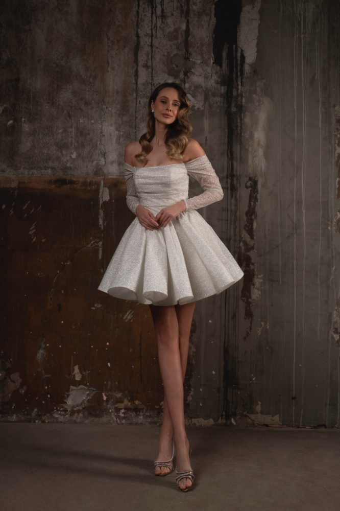 Платье для невесты, которая хочет сказку без компромиссов. Объёмные, съемные рукава с цветочными лепестками создают ощущение лёгкости и романтики, а корсетный лиф подчёркивает талию и визуально вытягивает силуэт. Юбка мягко струится при каждом движении — будто лёгкий ветерок в летнем саду.