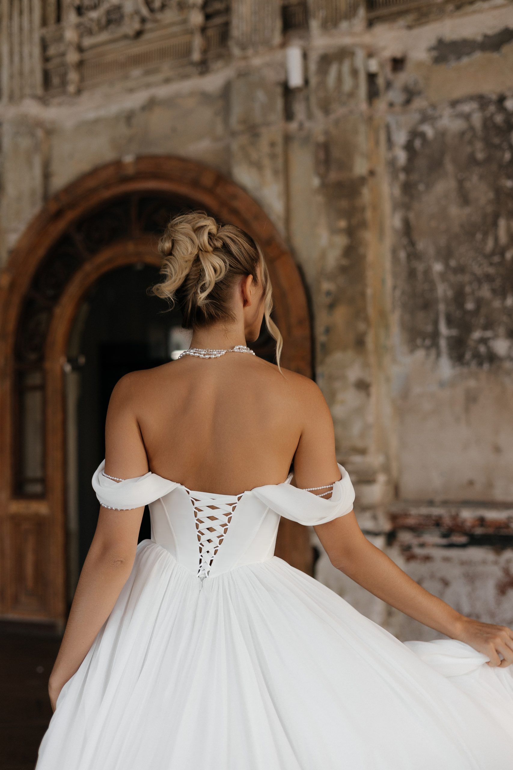 Платье, в котором лёгкость становится настроением. Чистый корсет с изящными линиями мягко подчёркивает фигуру, а деликатные нити украшений на плечах добавляют образу тонкую утончённость. Летящая юбка струится при каждом движении, создавая ощущение свободы и нежности.