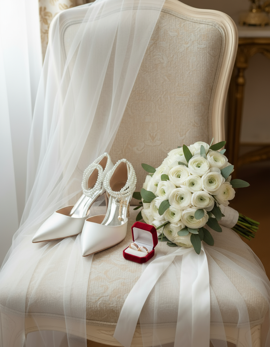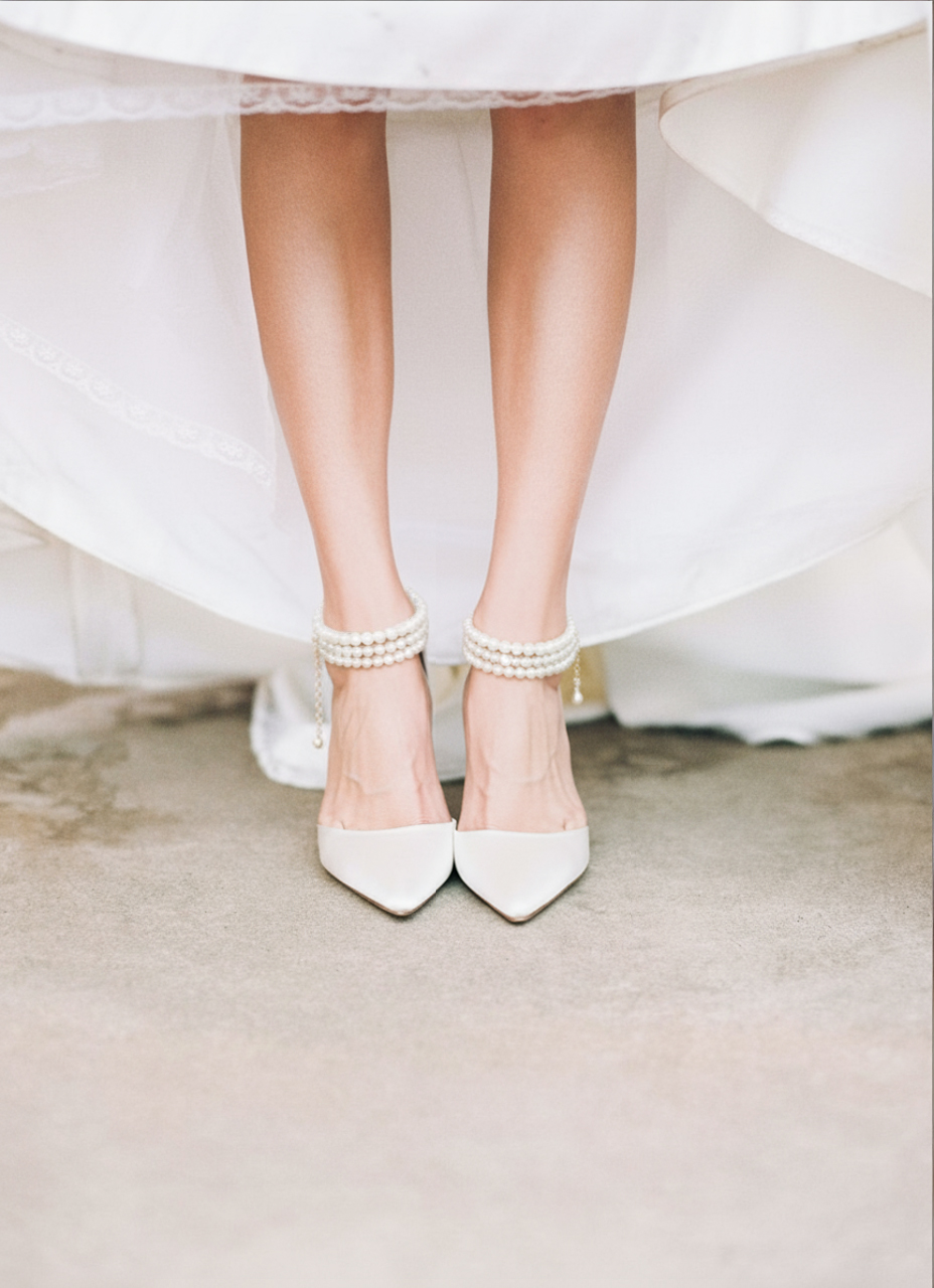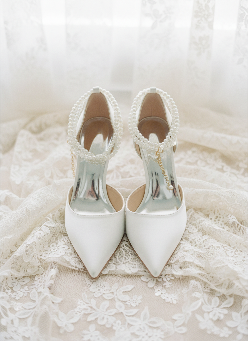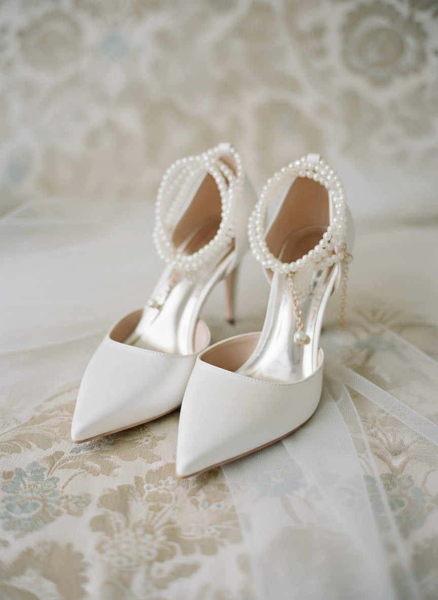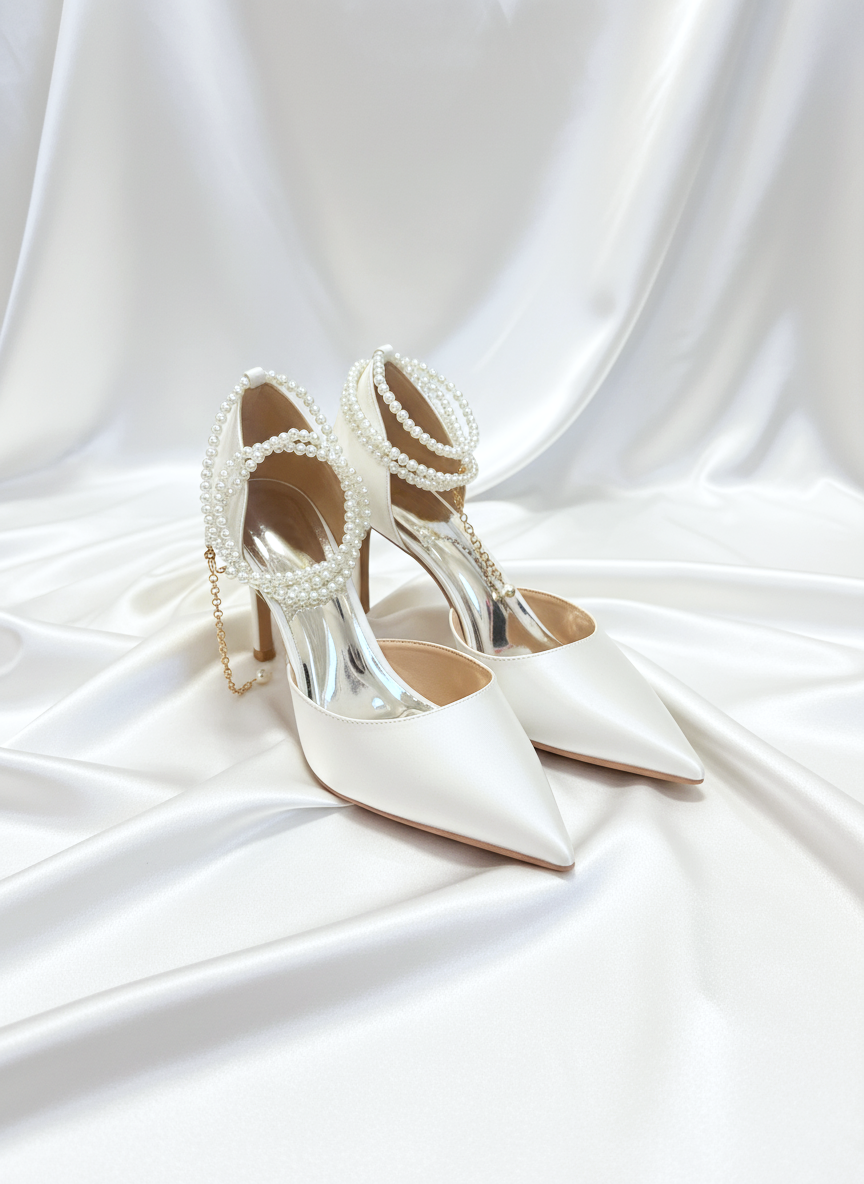 Молочный сатин, изящный вырез и тонкие жемчужные нити, обвивающие щиколотку — для невест, которые хотят добавить в образ немного винтажа и тонкую нотку драмы. Они идеально подойдут к лёгкому платью, шелковому шлейфу и моменту, когда сердце замирает.