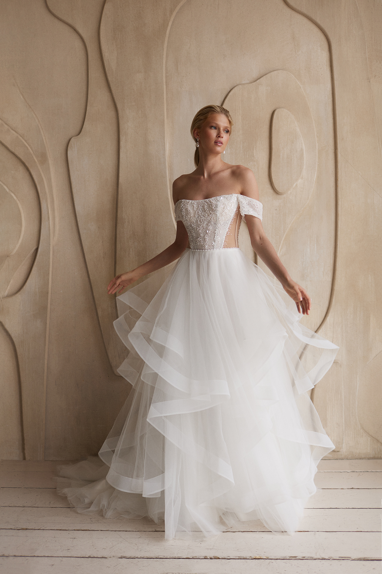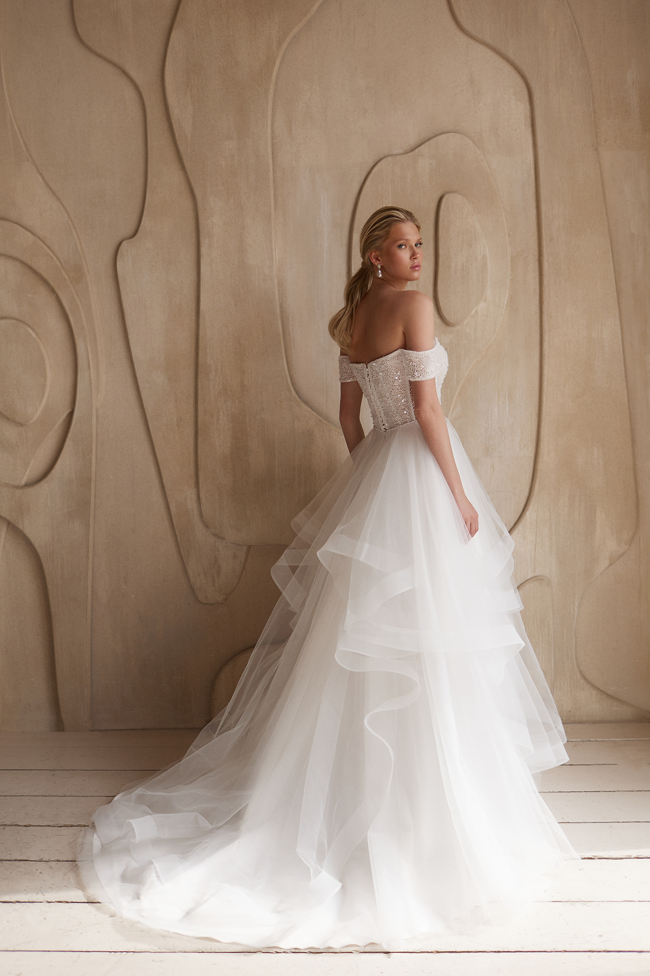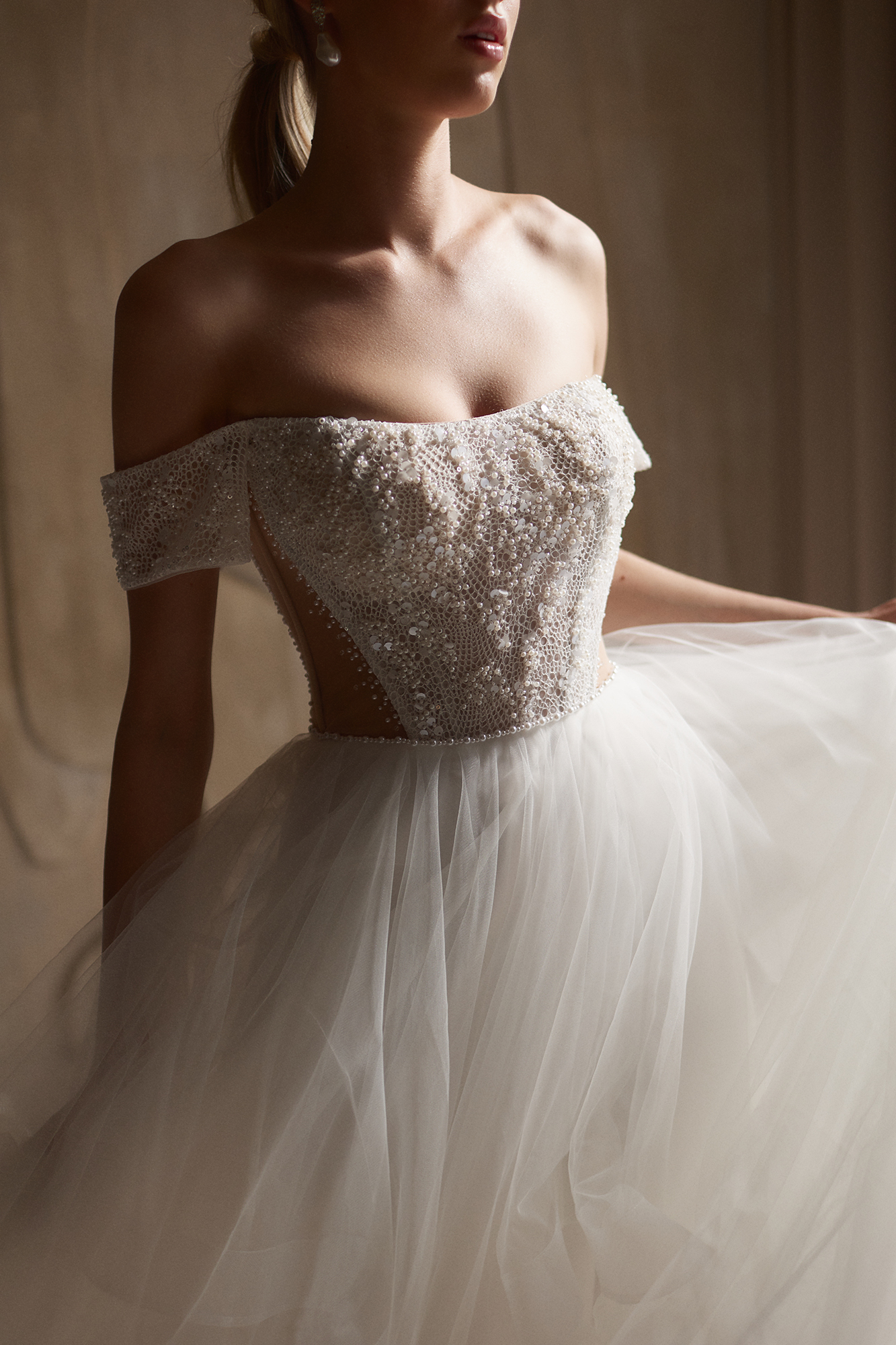 Платье, в котором хочется кружиться бесконечно. Сияющий корсет с деликатными вставками, спущенные рукава и многослойная юбка из фатина, которая движется, как облако. Это платье про мечту, которую ты носишь не внутри — а на себе. Про ту самую девочку, которая верила в сказку — и стала её главной героиней. Для невесты, которой важны и драматичность, и лёгкость.