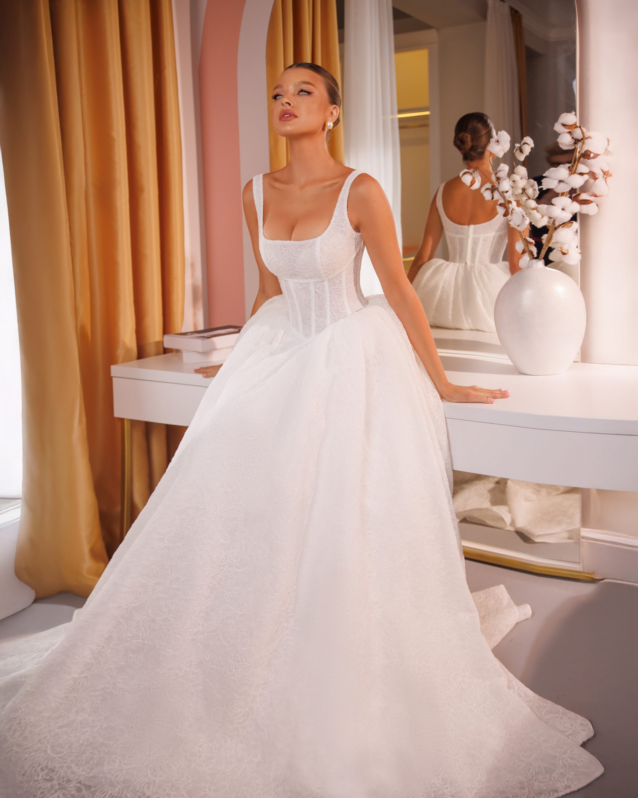 Классика, которая легко меняется вместе с настроением. Чёткий корсет с тонкими бретелями подчёркивает силуэт и линию декольте, а объёмная юбка создаёт ощущение баланса и лёгкости. Съёмный верх в формате блузы добавляет образу сдержанной элегантности — закрытый, более торжественный вариант сменяется открытым и чувственным всего одним движением.