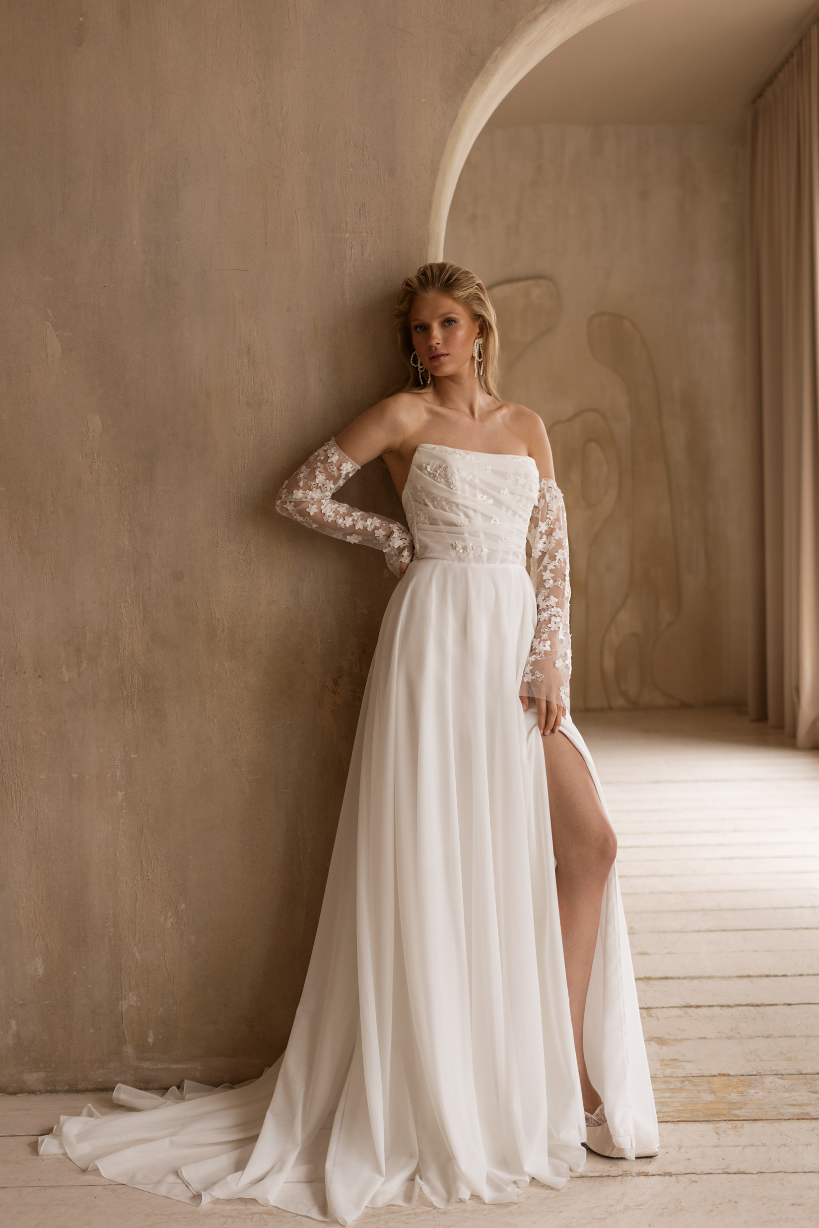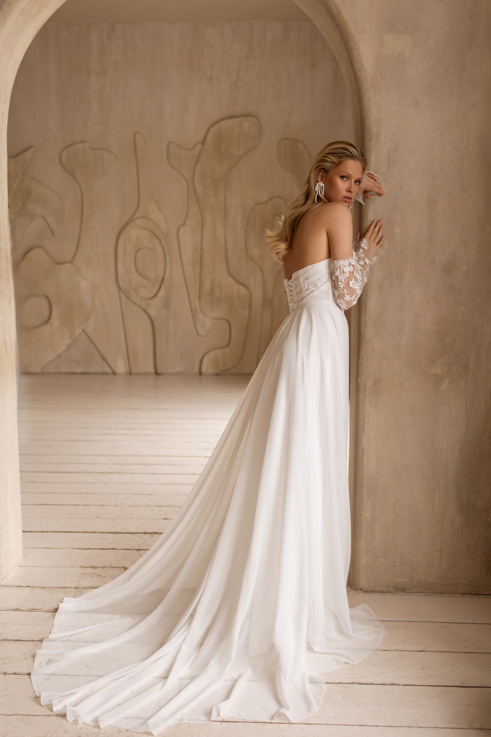 Образ, в котором каждая деталь говорит о вкусе. Чистый корсетный верх с ручной вышивкой создаёт современный силуэт, а полупрозрачные кружевные рукава добавляют мягкой романтики. Юбка струится за тобой лёгкой волной — и каждый шаг в ней как кадр из красивого фильма. Для невесты, которая ценит утончённость и мечтает о платье вне времени.