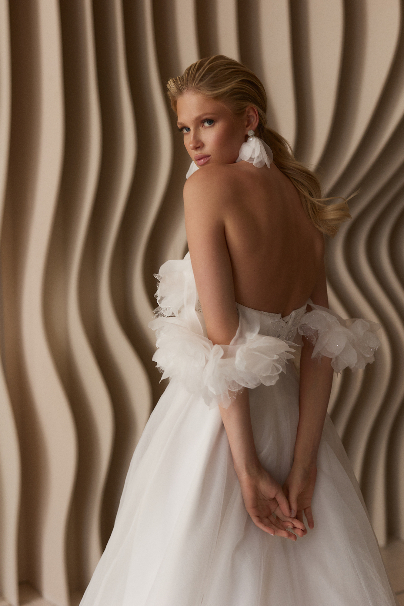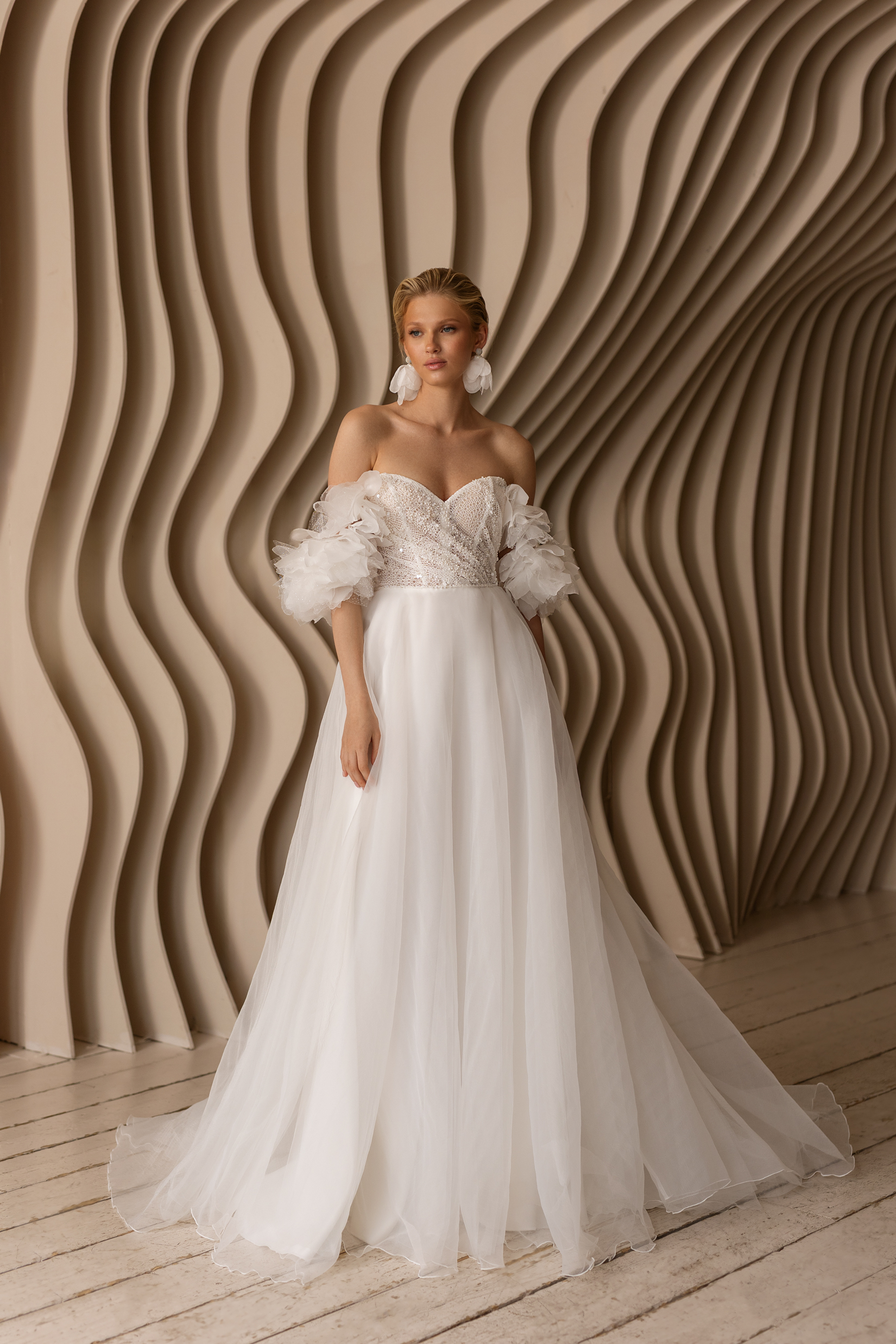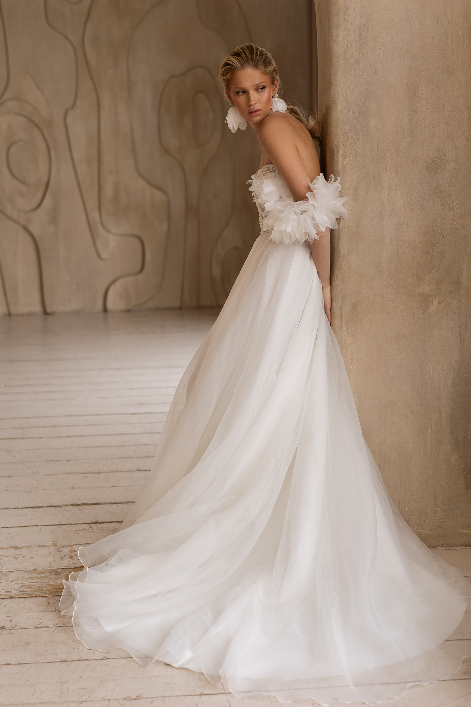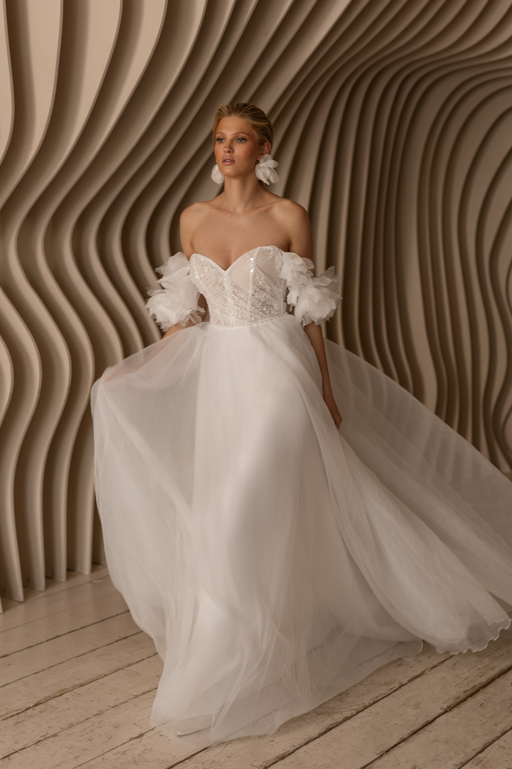 Платье, в котором всё про лёгкость и трепет. Корсет с нежной вышивкой подчёркивает линию декольте, а спущенные плечи будто сотканы из утреннего тумана. Юбка летит за тобой мягкой вуалью, создавая ощущение сказки — той самой, где ты главная героиня.