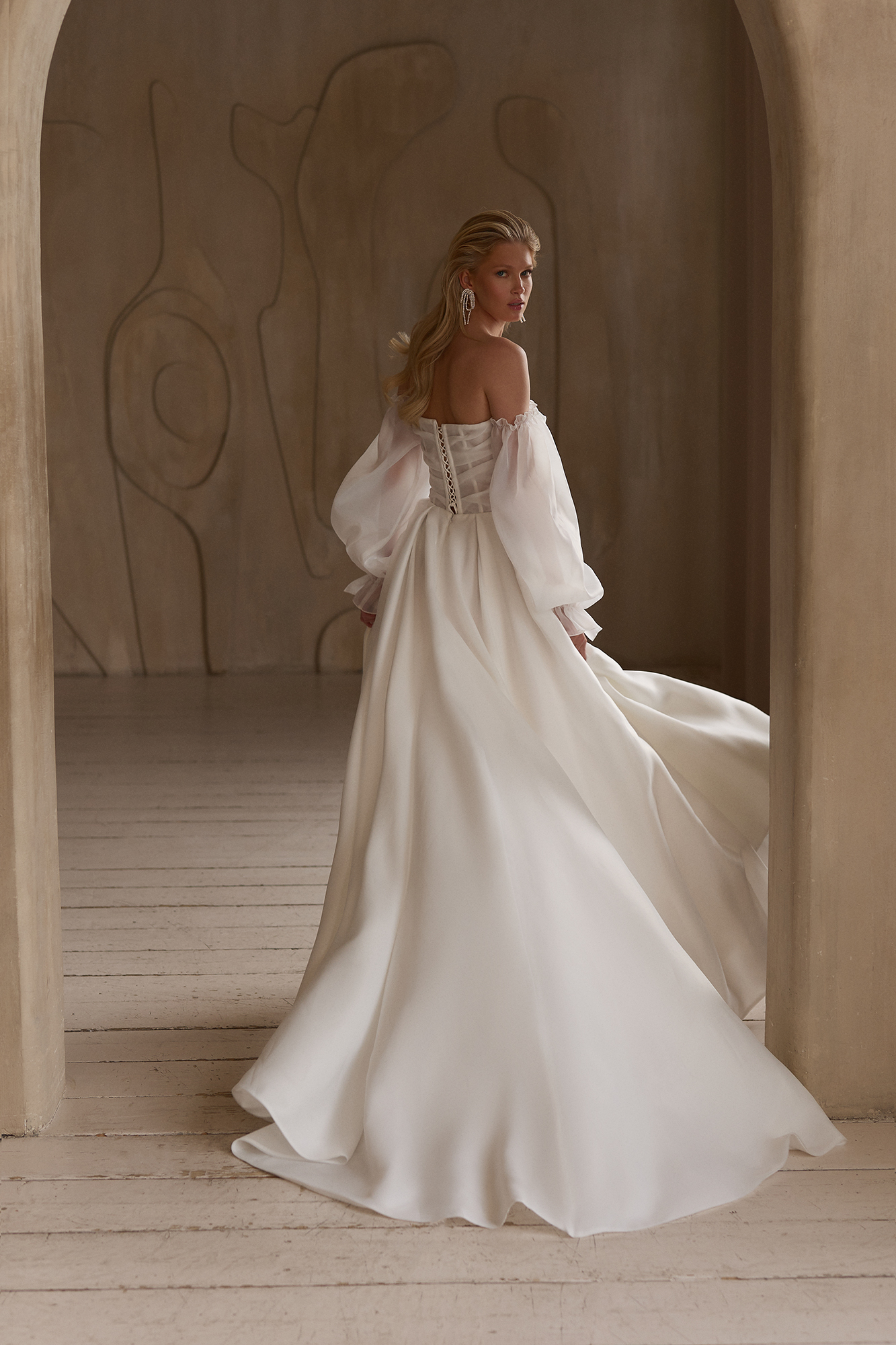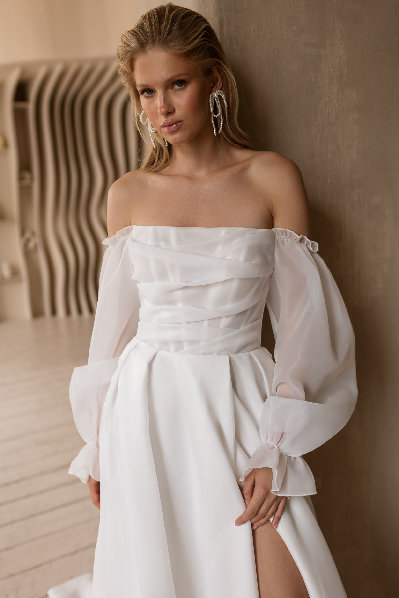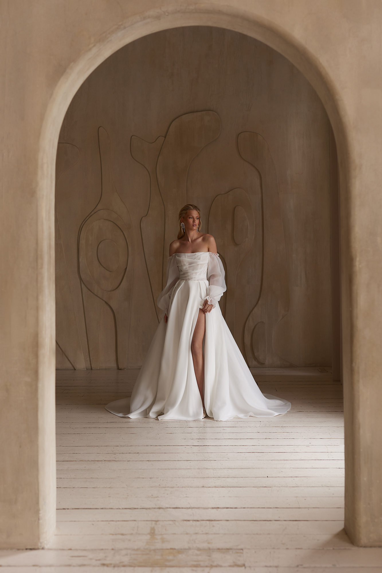 Моника — это платье с характером. Объёмные рукава из органзы, чистый корсет с драпировкой и выразительный разрез делают образ дерзким, но при этом невероятно женственным. Оно не требует украшений — в нём уже есть всё: форма, движение, воздух. Для невесты, которая выбирает лёгкость и стиль — и делает это уверенно.