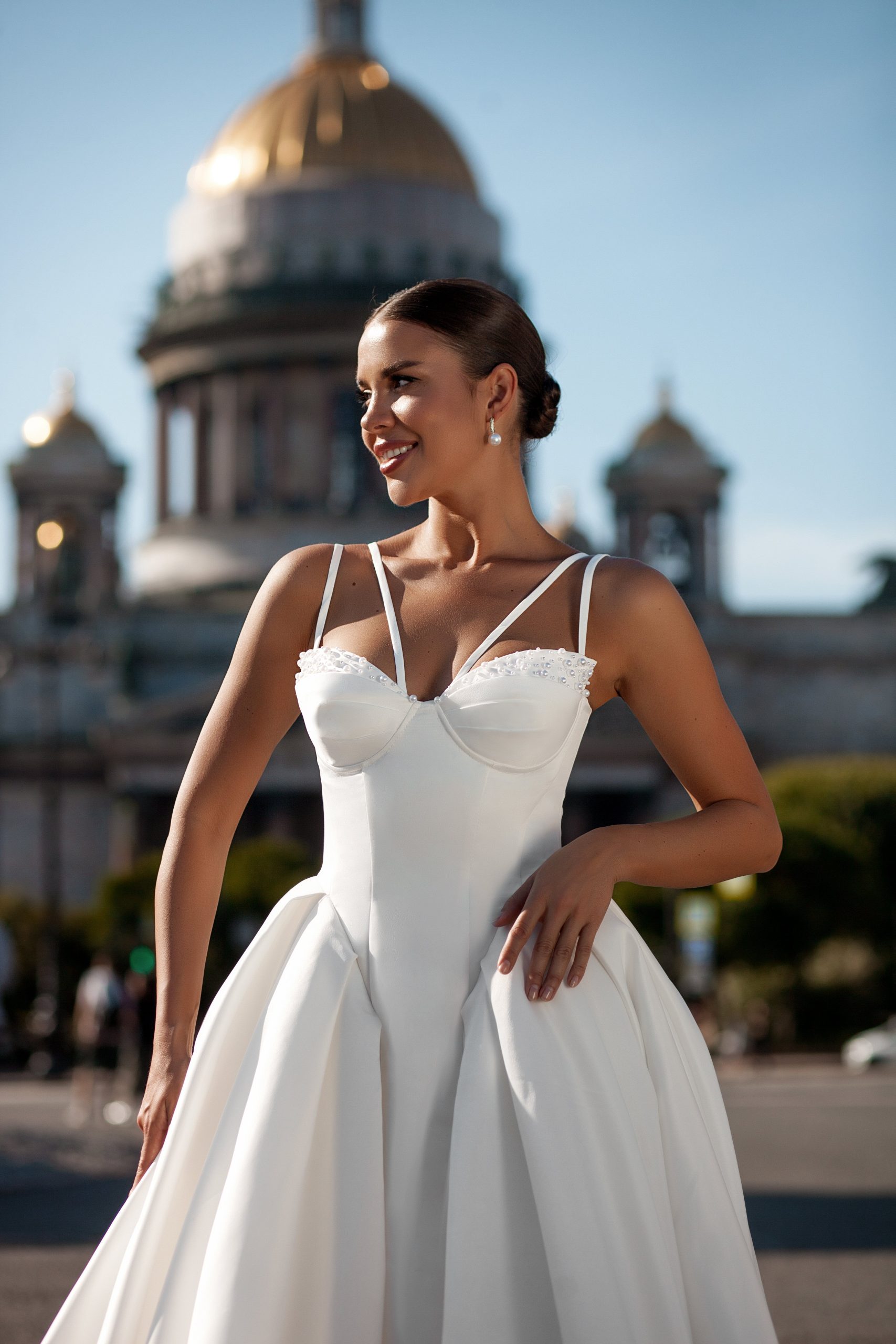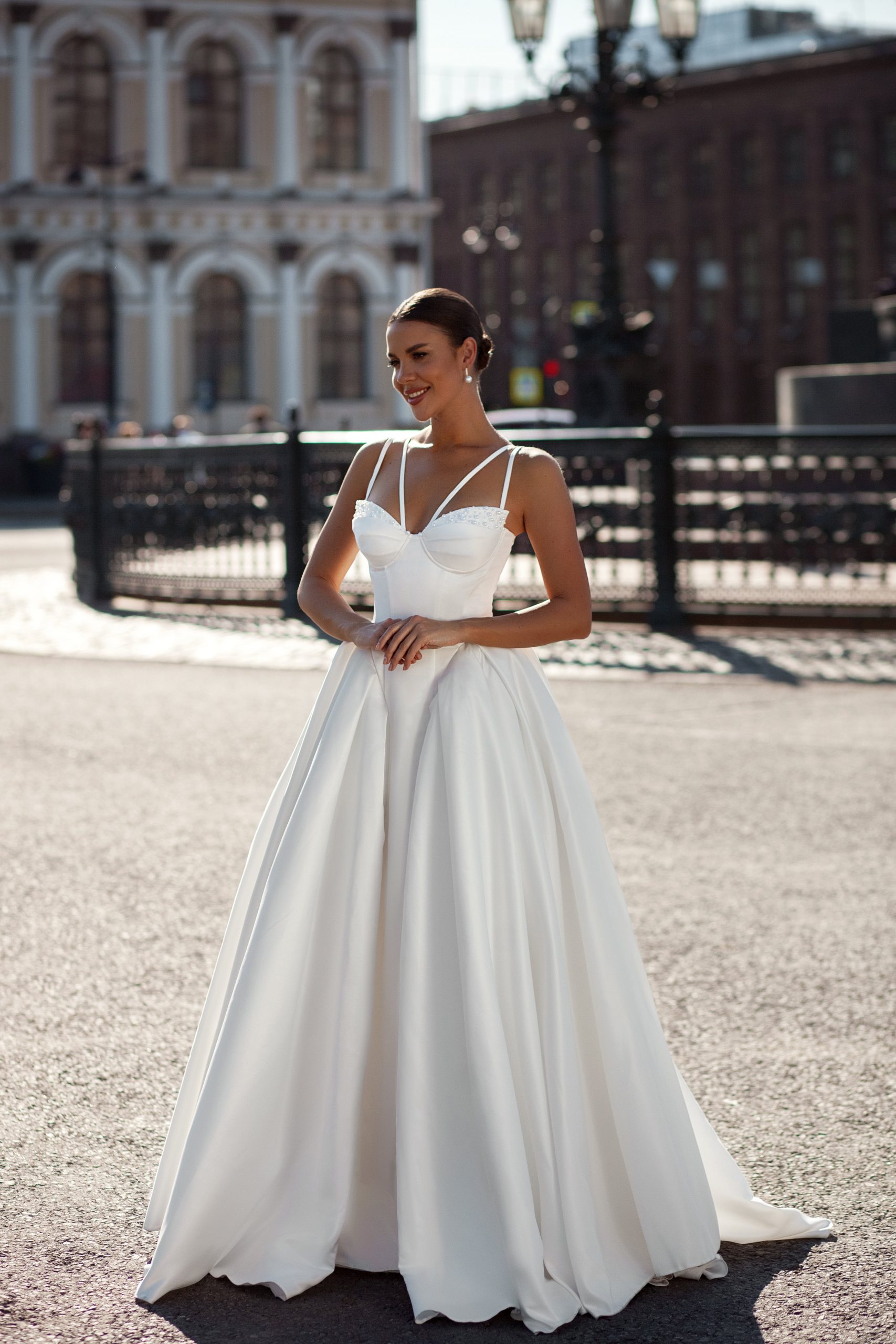Платье, которое подчёркивает фигуру и вкус. Чёткий корсет с двойными бретелями и жемчужной отделкой, подчёркнутая линия талии и пышная юбка из струящегося атласа создают образ современной и уверенной невесты.