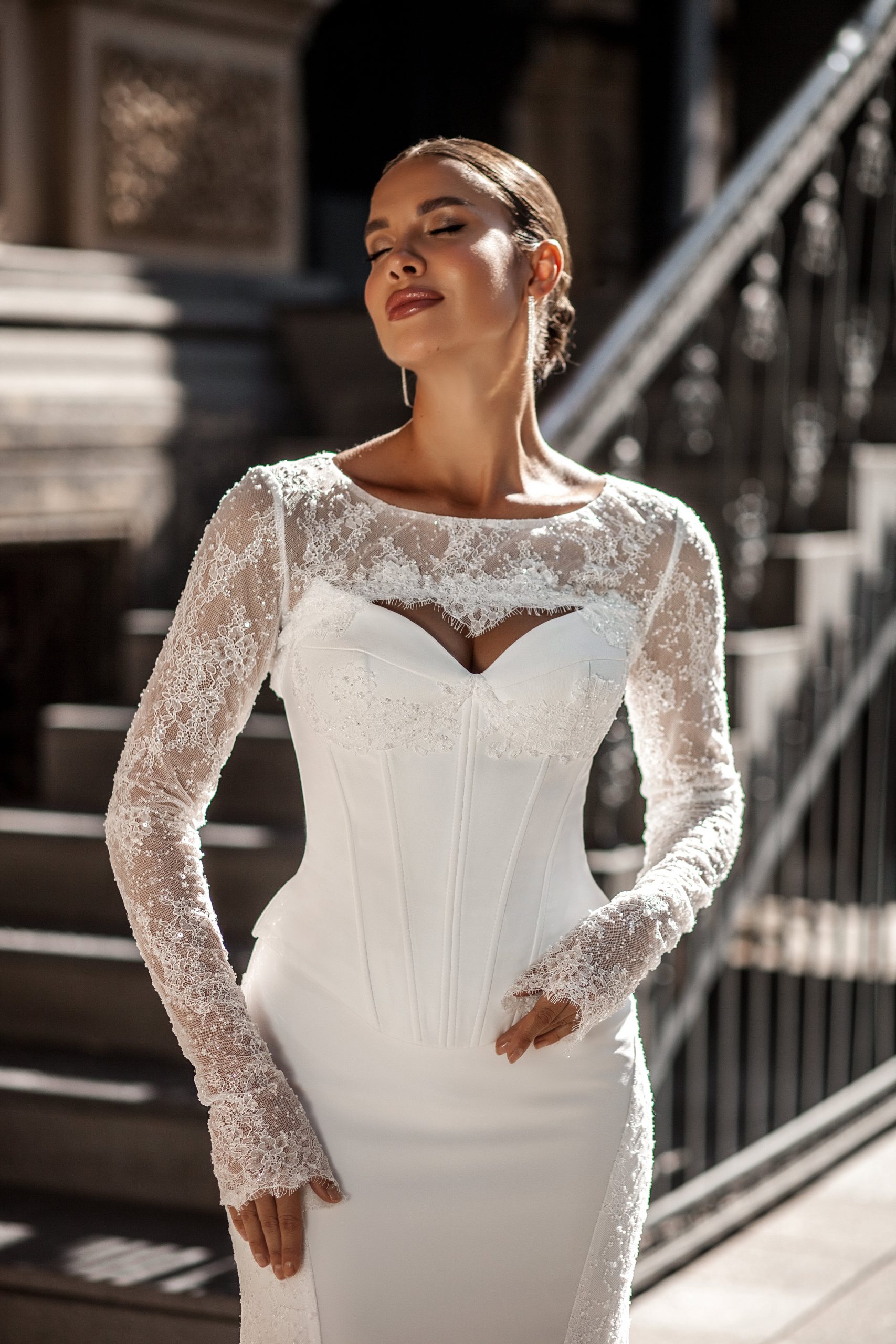 Платье для невесты, которая не боится выделяться. Смелый дизайн, благородный атлас, высокая горловина из расшитого кружева и эффектные плечи, будто сошедшие с подиума высокой моды. Контраст фактур, чёткие линии и струящаяся юбка с разрезом делают образ динамичным и элегантным одновременно.