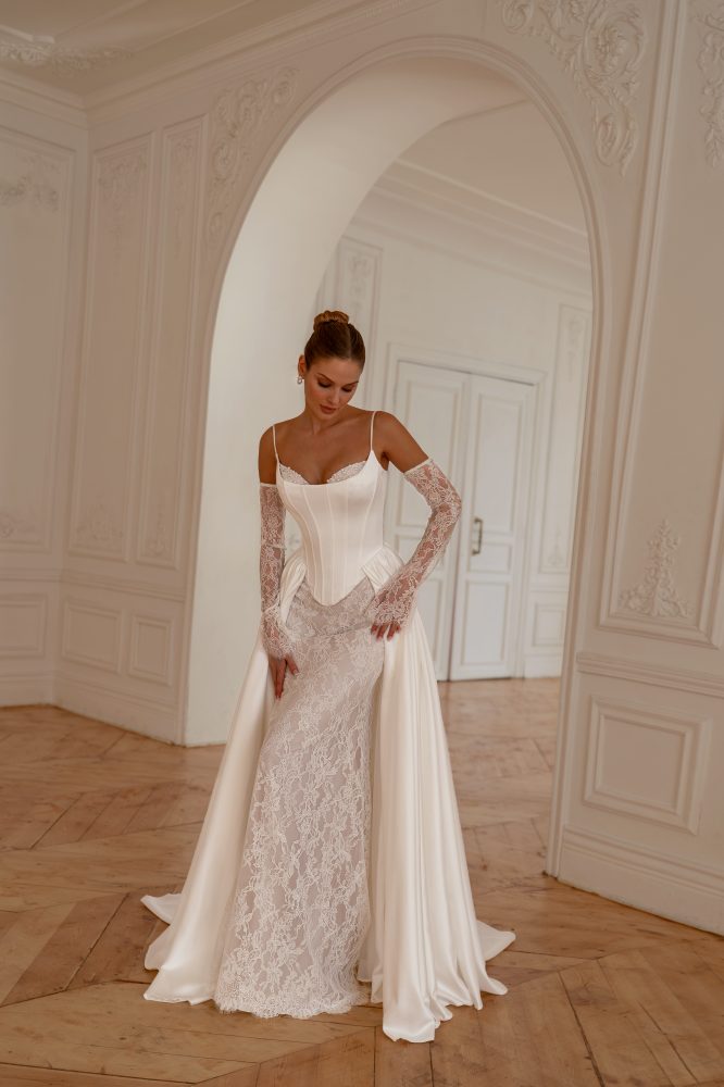 Платье с характером — утончённая классика с эффектным кружевным акцентом. Оно сочетает в себе корсет с открытыми плечами, драпировку по лифу и полупрозрачную вставку на юбке, обрамлённую кружевом. Образ получается чувственным, но сдержанным — для невест, которые ценят эстетику благородной драмы. Идеально для торжественной церемонии, где хочется выглядеть как героиня из кадра эпохального фильма.