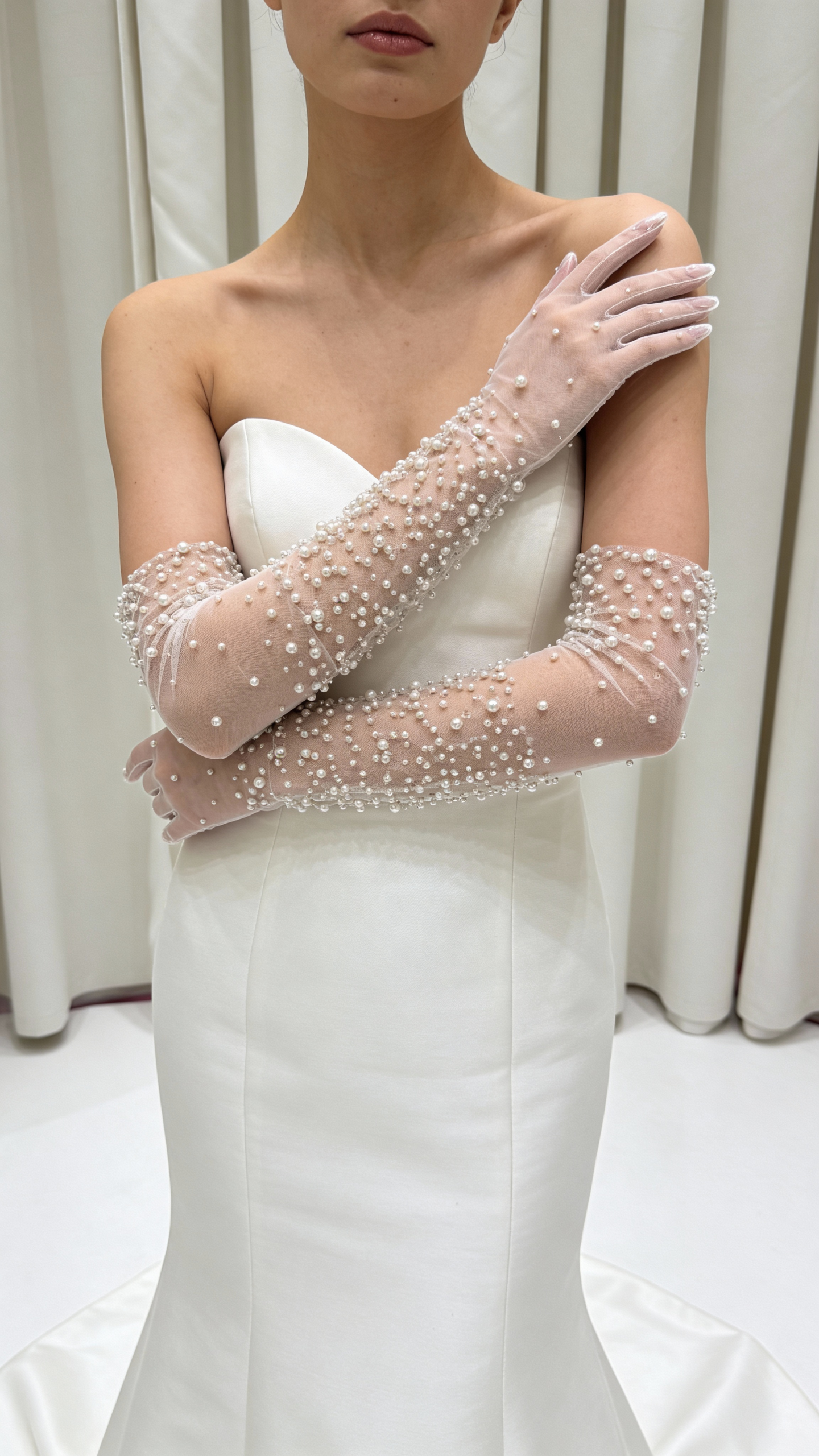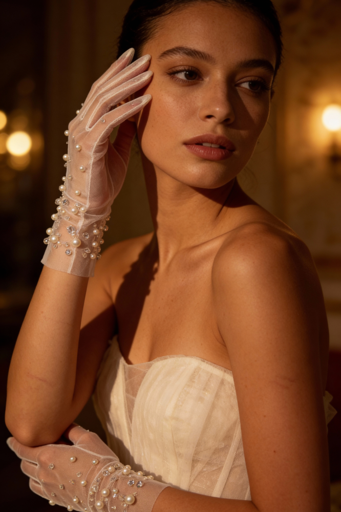 Невесомые перчатки из тонкой сетки, расшитые жемчугом, создают эффект мягкого сияния на коже. Декор распределён деликатно, подчёркивая линию рук и добавляя образу утончённый акцент без перегруженности.