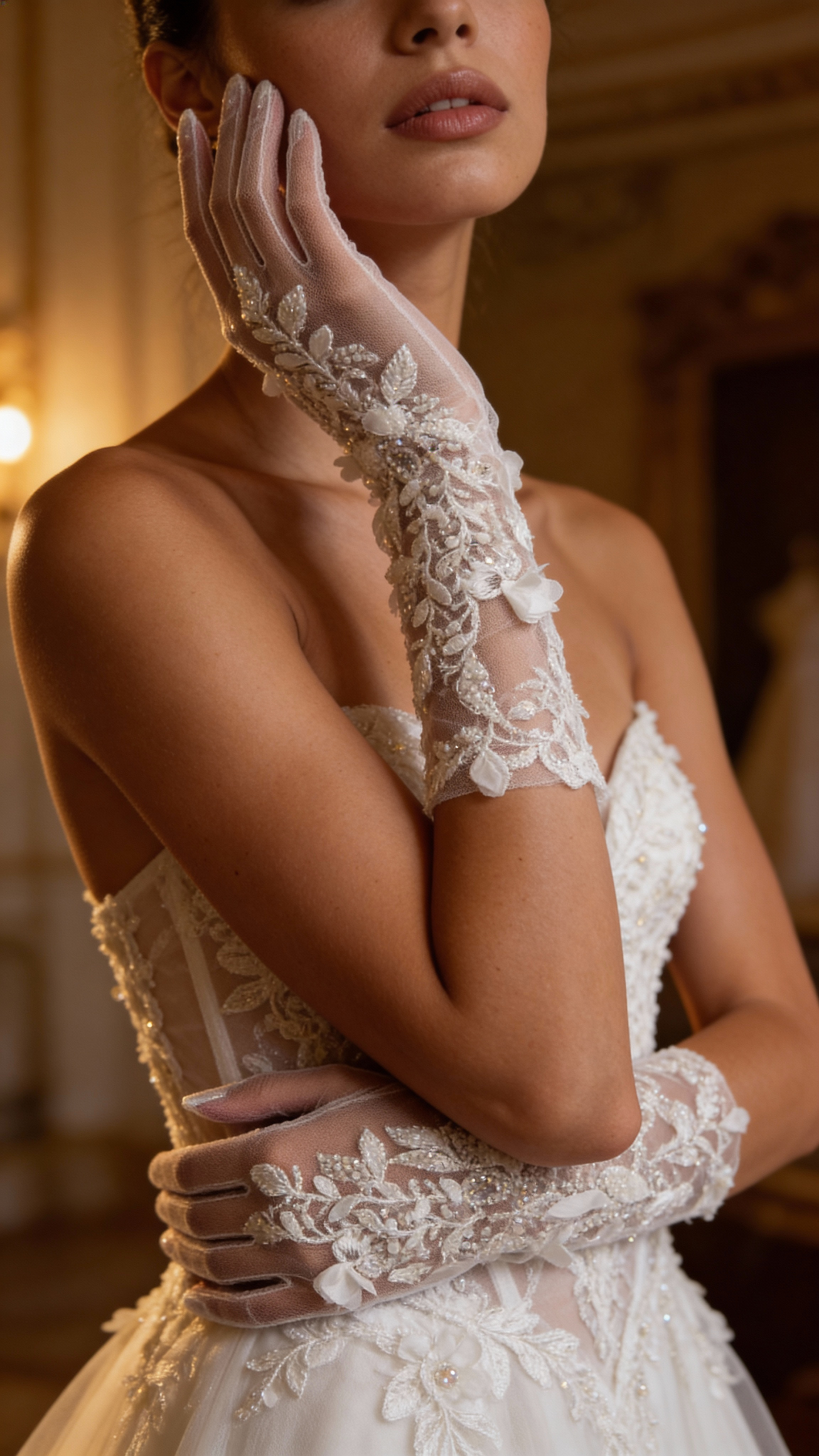 Эти перчатки — про утончённость и особое настроение. Идеальны для свадебного дня, камерной церемонии или съёмки в атмосфере тихой роскоши, когда важна каждая деталь и хочется выглядеть по-настоящему изысканно.
