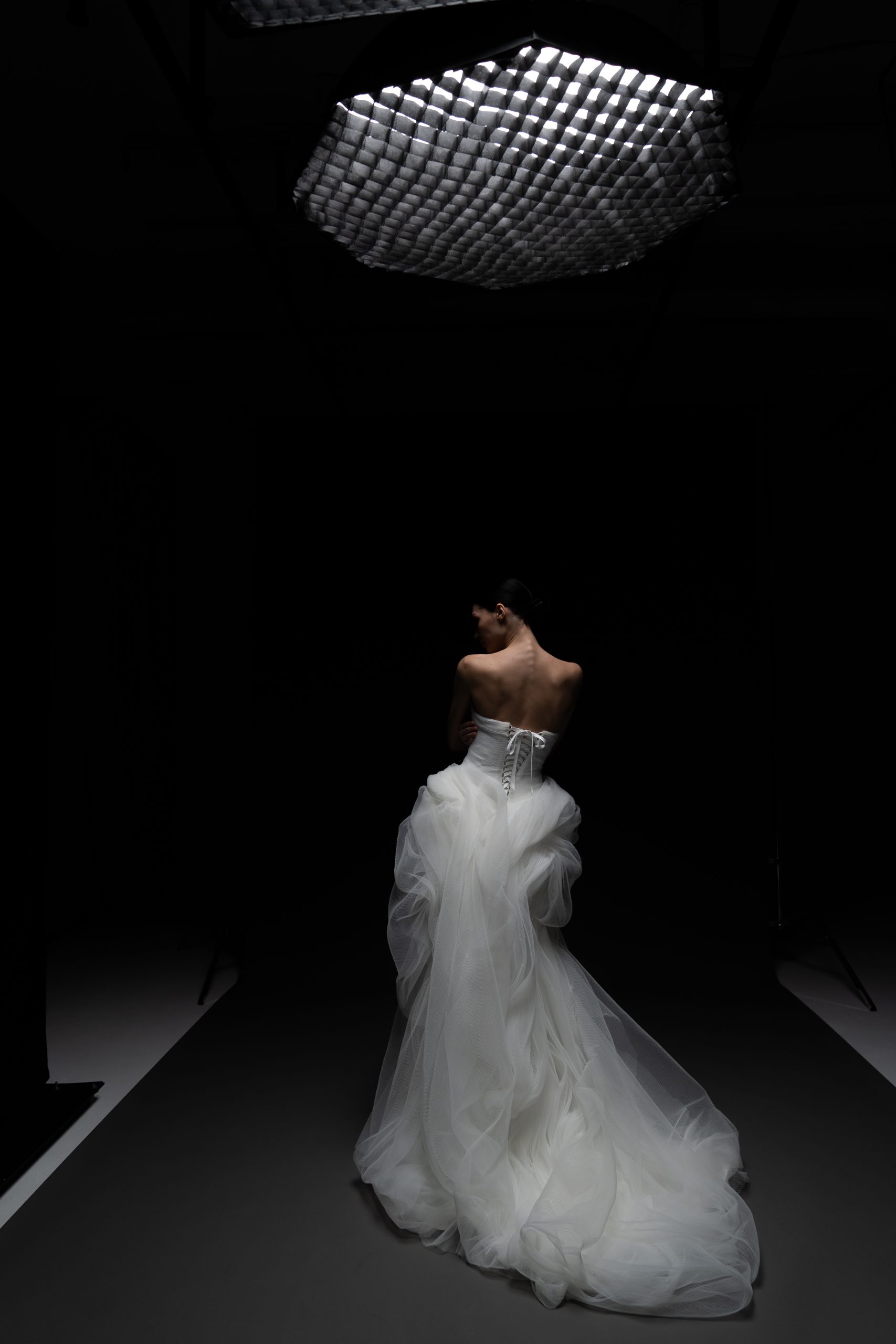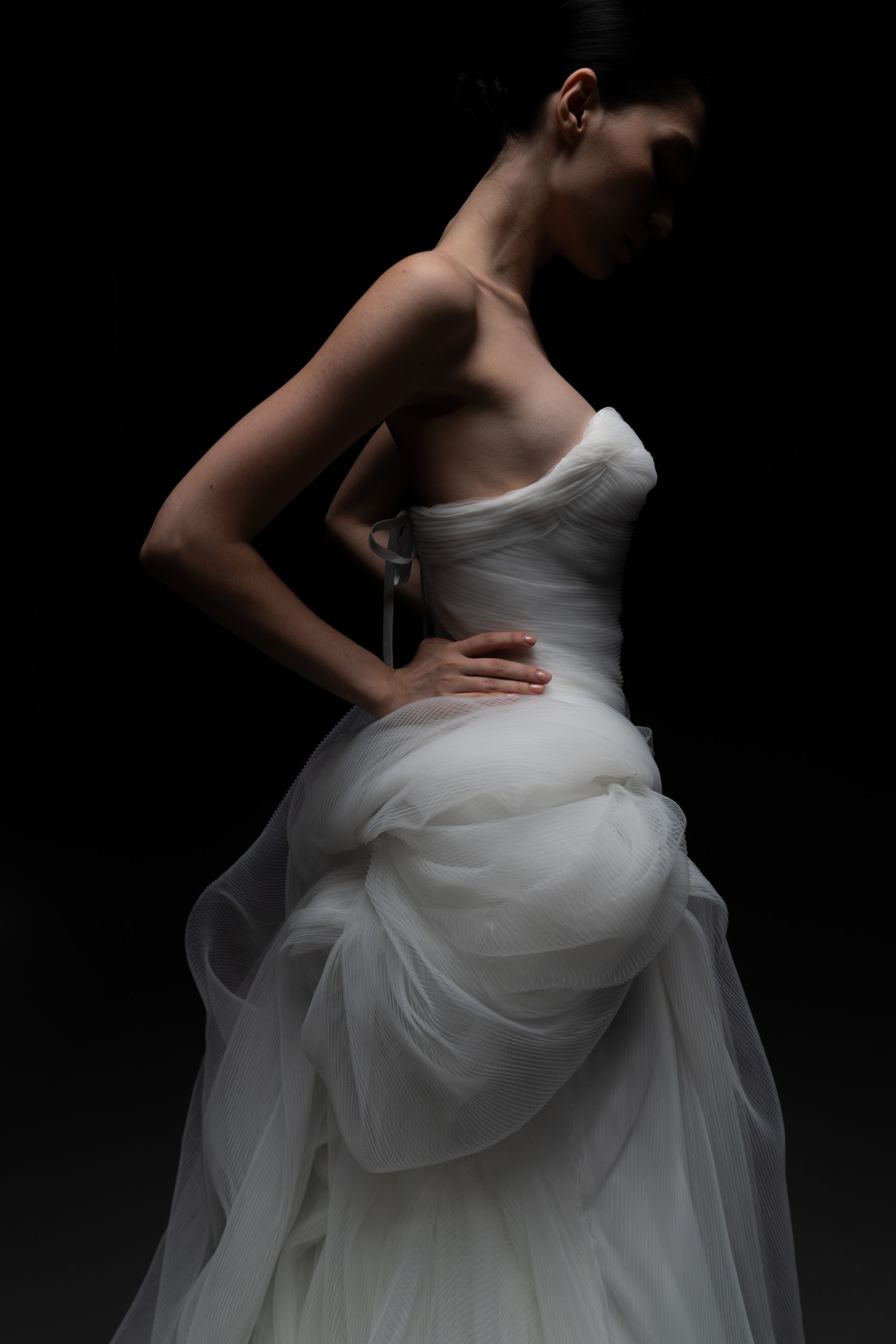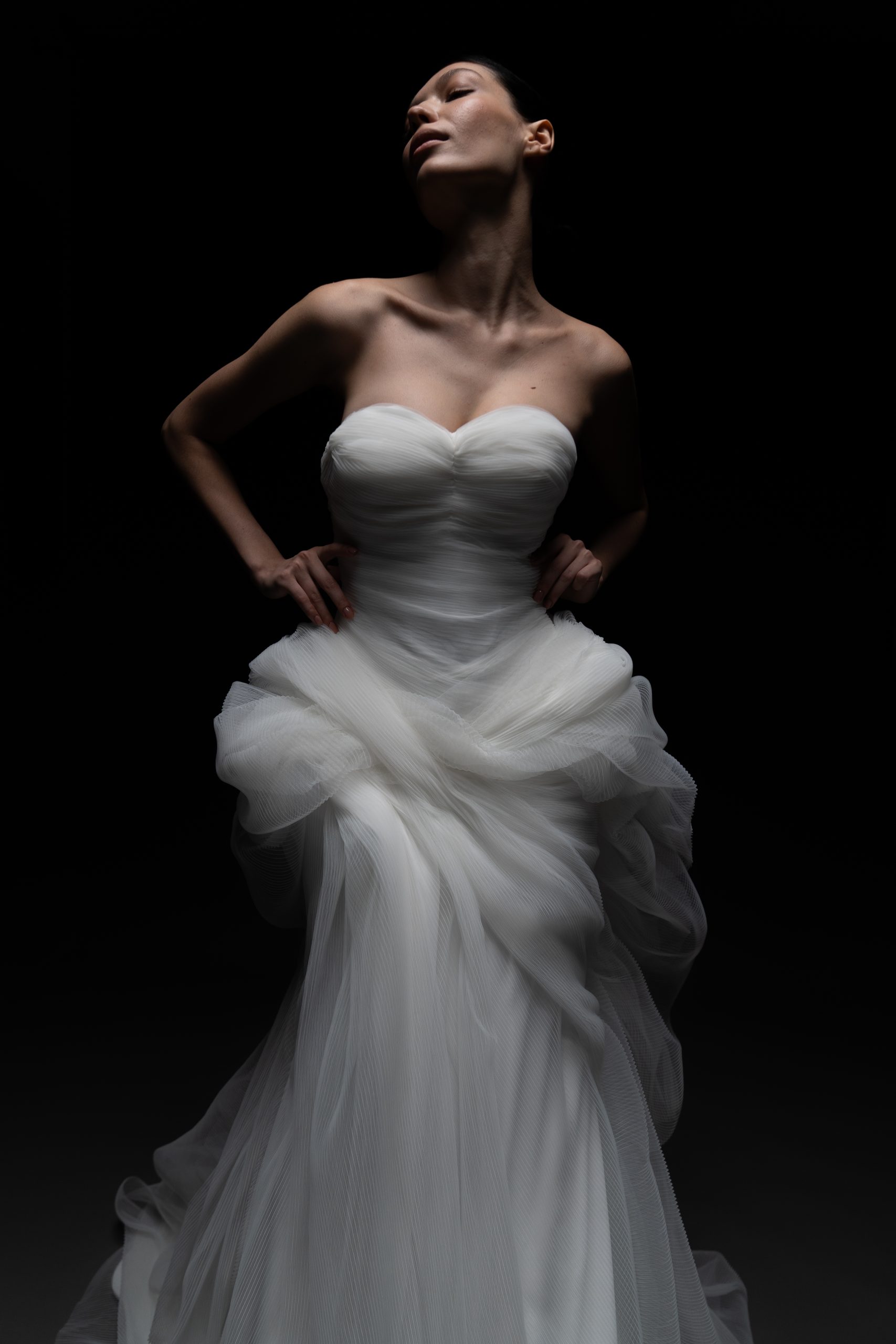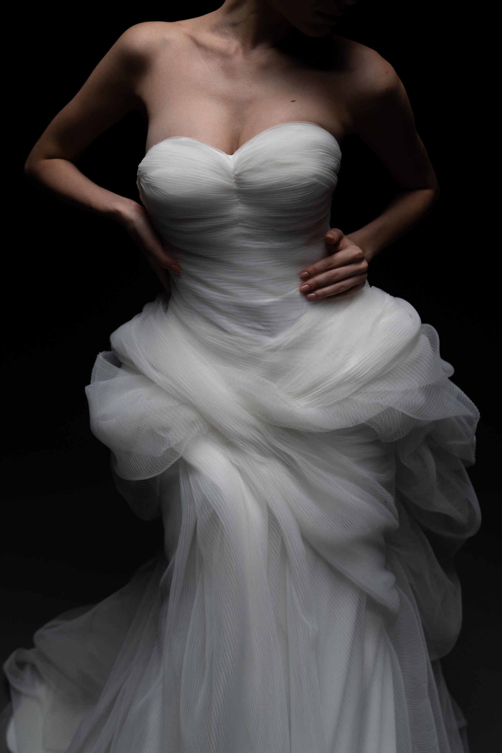 Роскошь, которая говорит шёпотом. Объёмные драпировки тюля струятся, словно дыхание ветра, а корсет подчёркивает утончённую силуэтную линию.