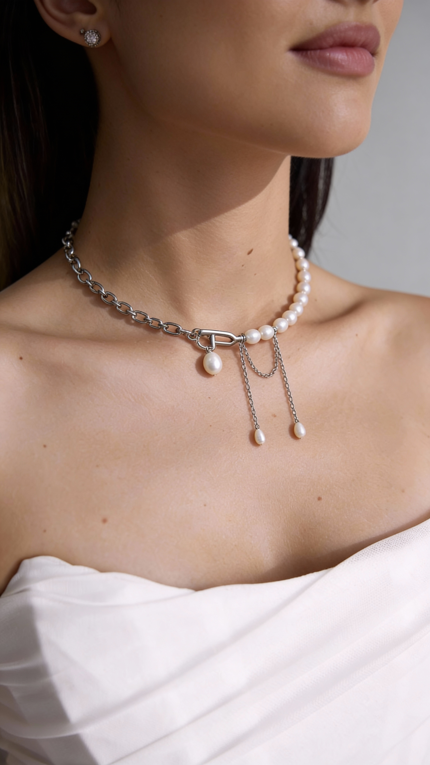 Холодный металл и тёплый натуральный жемчуг соединяются в одном акценте, создавая ощущение современной элегантности. Асимметричная композиция с цепью, лаконичной застёжкой и подвесками из жемчуга добавляет образу графичность и характер, оставаясь при этом очень женственной.