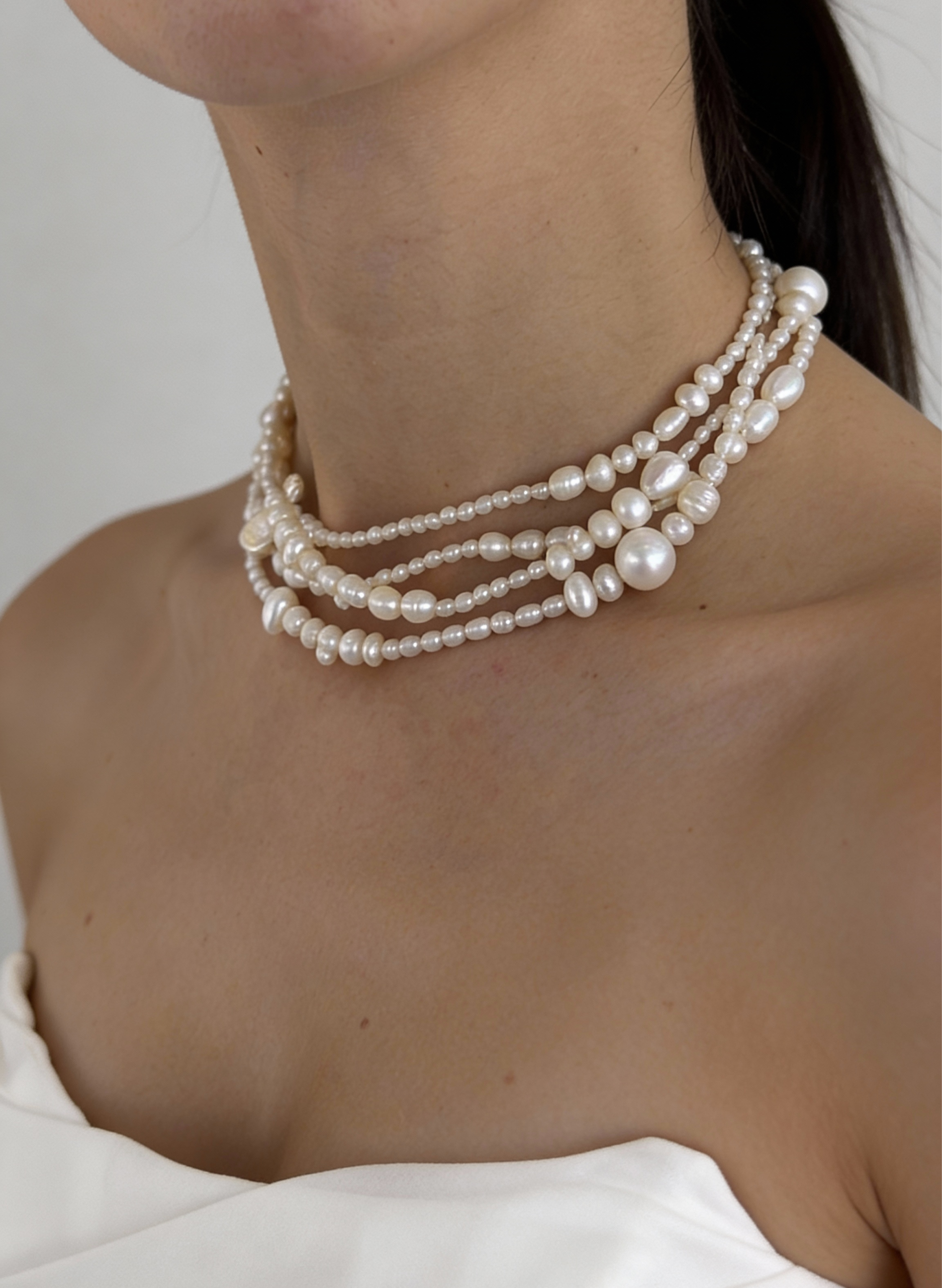 Эта подвеска про слои, тактильность и живую фактуру. Несколько нитей натурального жемчуга разного размера мягко переплетаются между собой, создавая объёмный, но очень деликатный акцент на шее.