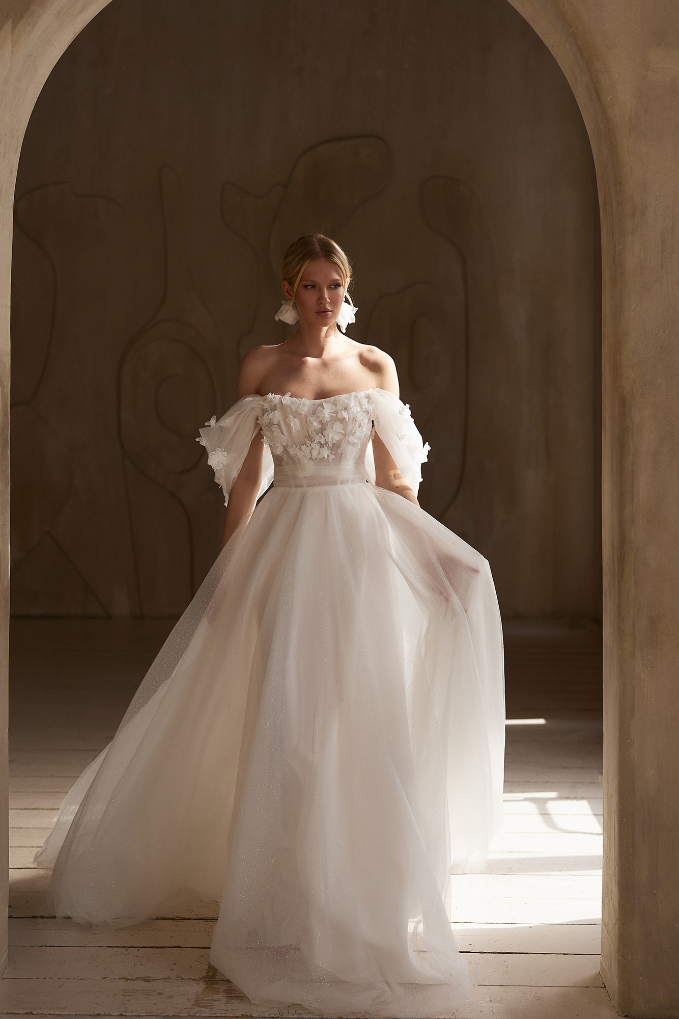 Платье Росио — это воплощение нежности и воздушности. Полупрозрачный корсет украшен объёмными цветами, которые словно парят на коже, создавая эффект утреннего сада. Лёгкие фатиновые рукава добавляют романтики, а мягкая юбка струится при каждом движении. Идеальный выбор для невесты, которая хочет быть нежной, но уверенной.