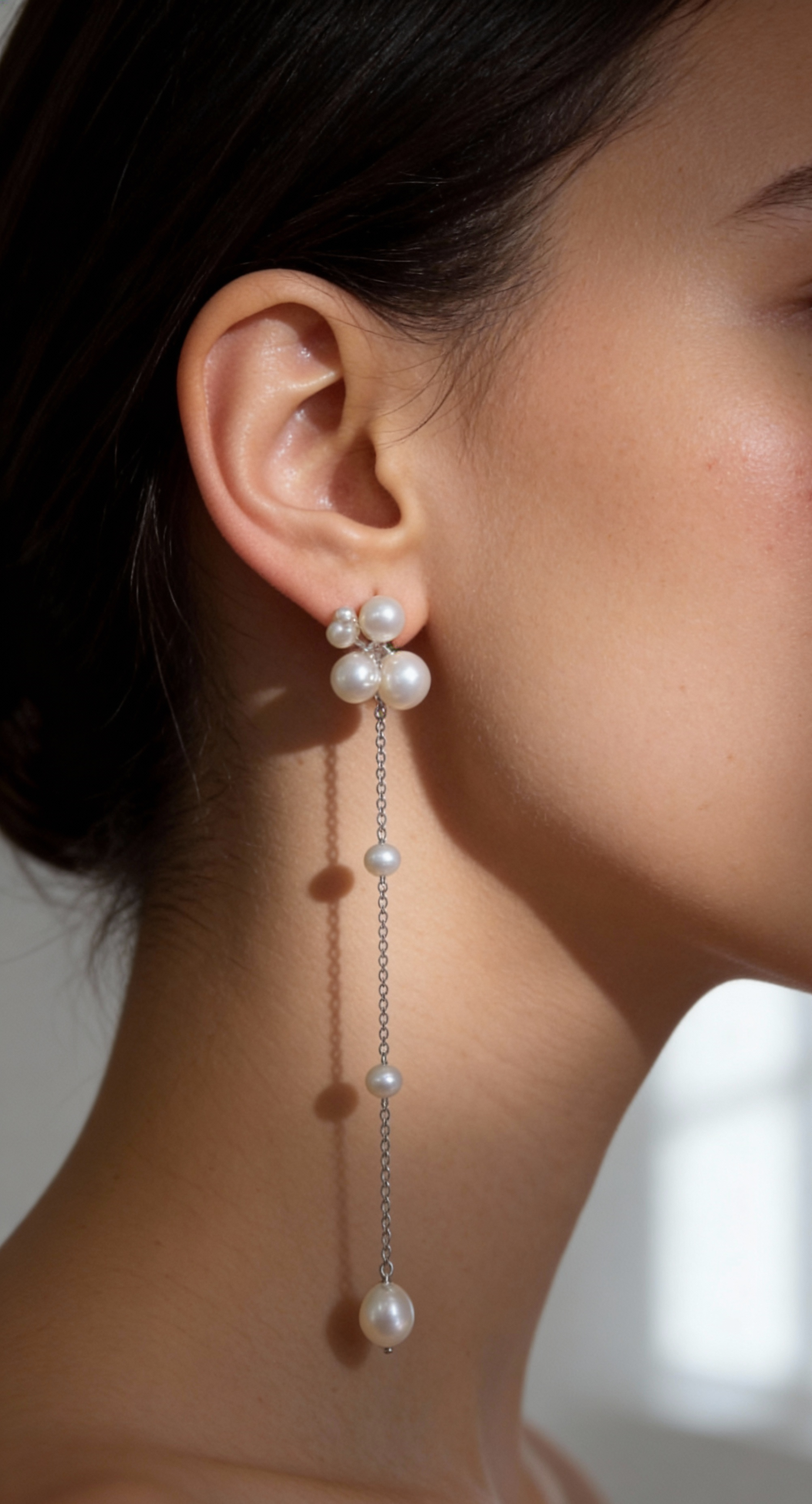 Серьги, которые ловят свет и каждое движение. Они вытягивают силуэт, подчёркивают линию шеи и добавляют образу живости, игривости и чувственности.