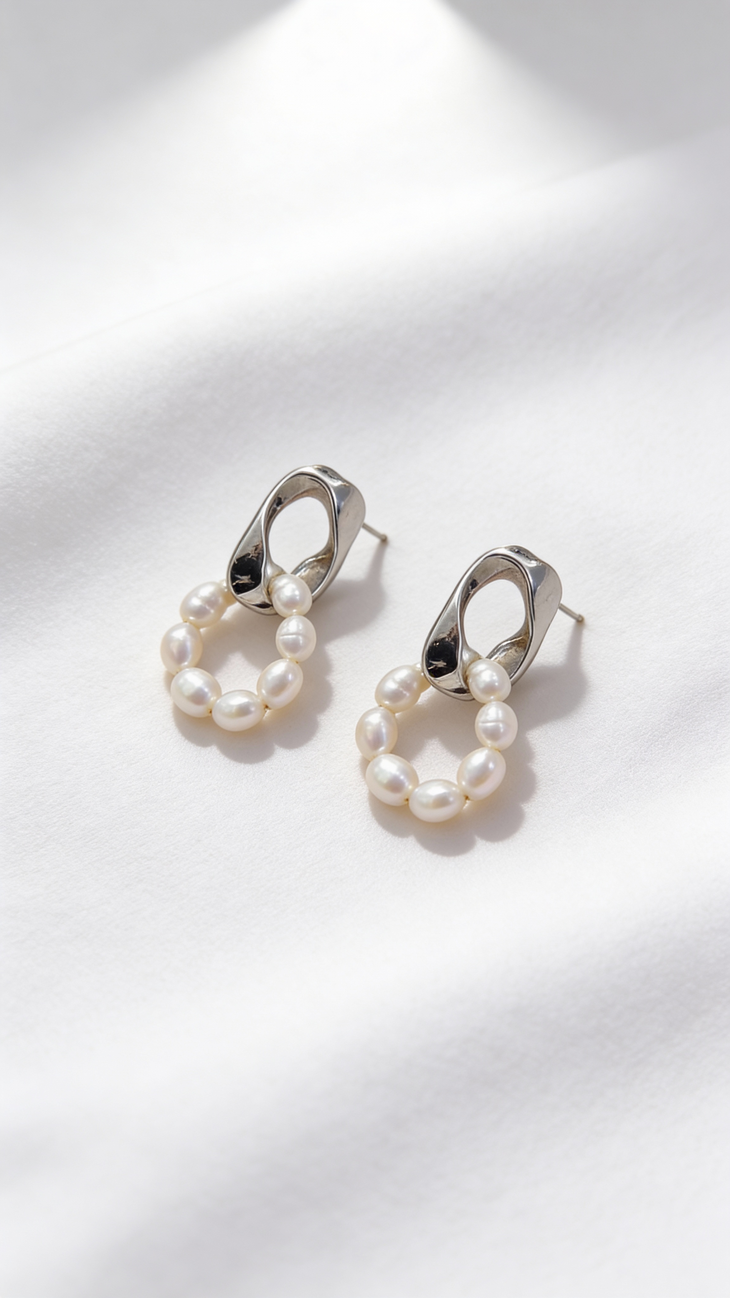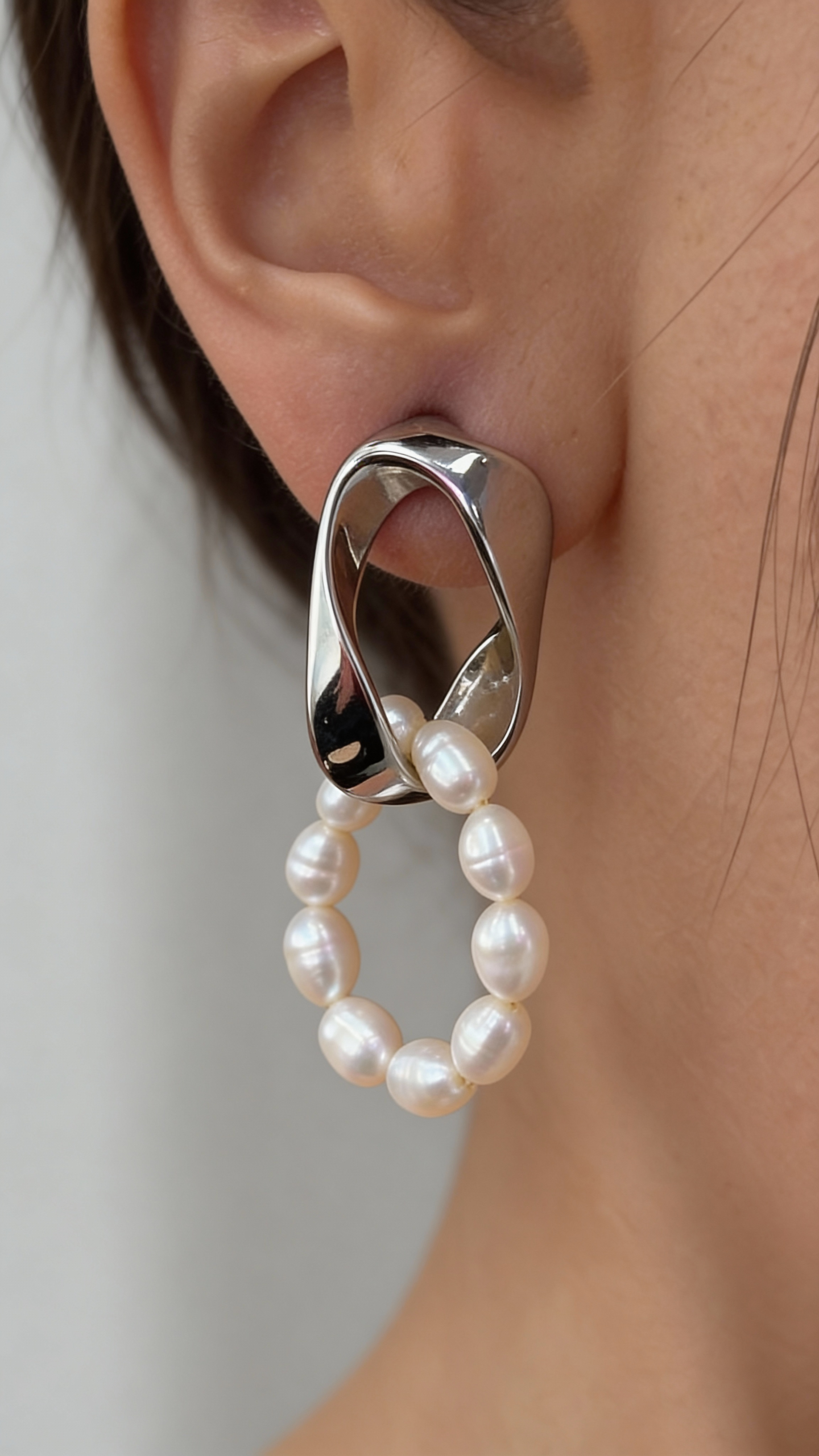 Серьги с гладкой металлической формой и подвижным кольцом из жемчуга создают выразительный, но очень сбалансированный акцент. Контраст холодного металла и мягкого жемчужного блеска добавляет образу глубину и современную элегантность.