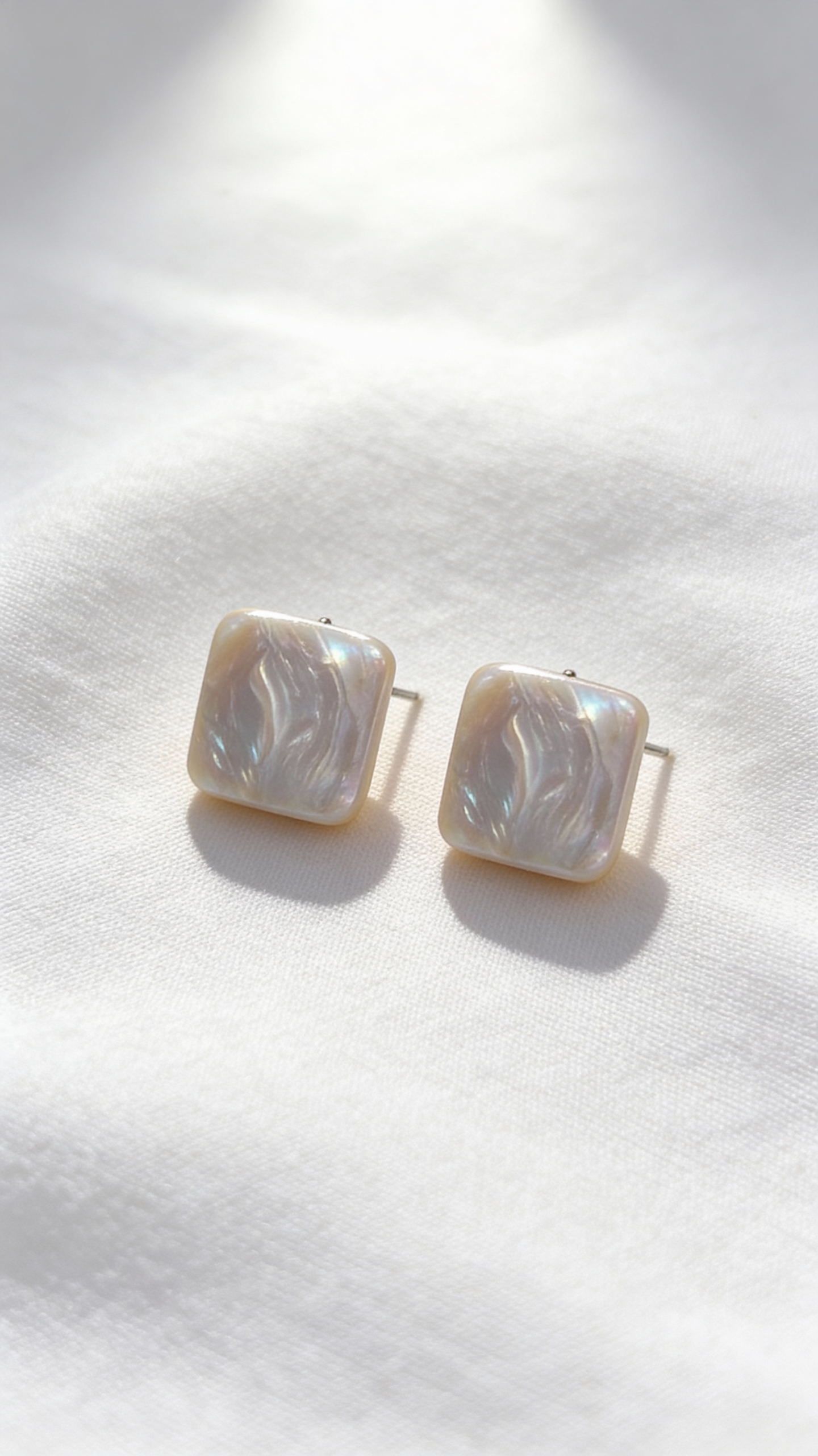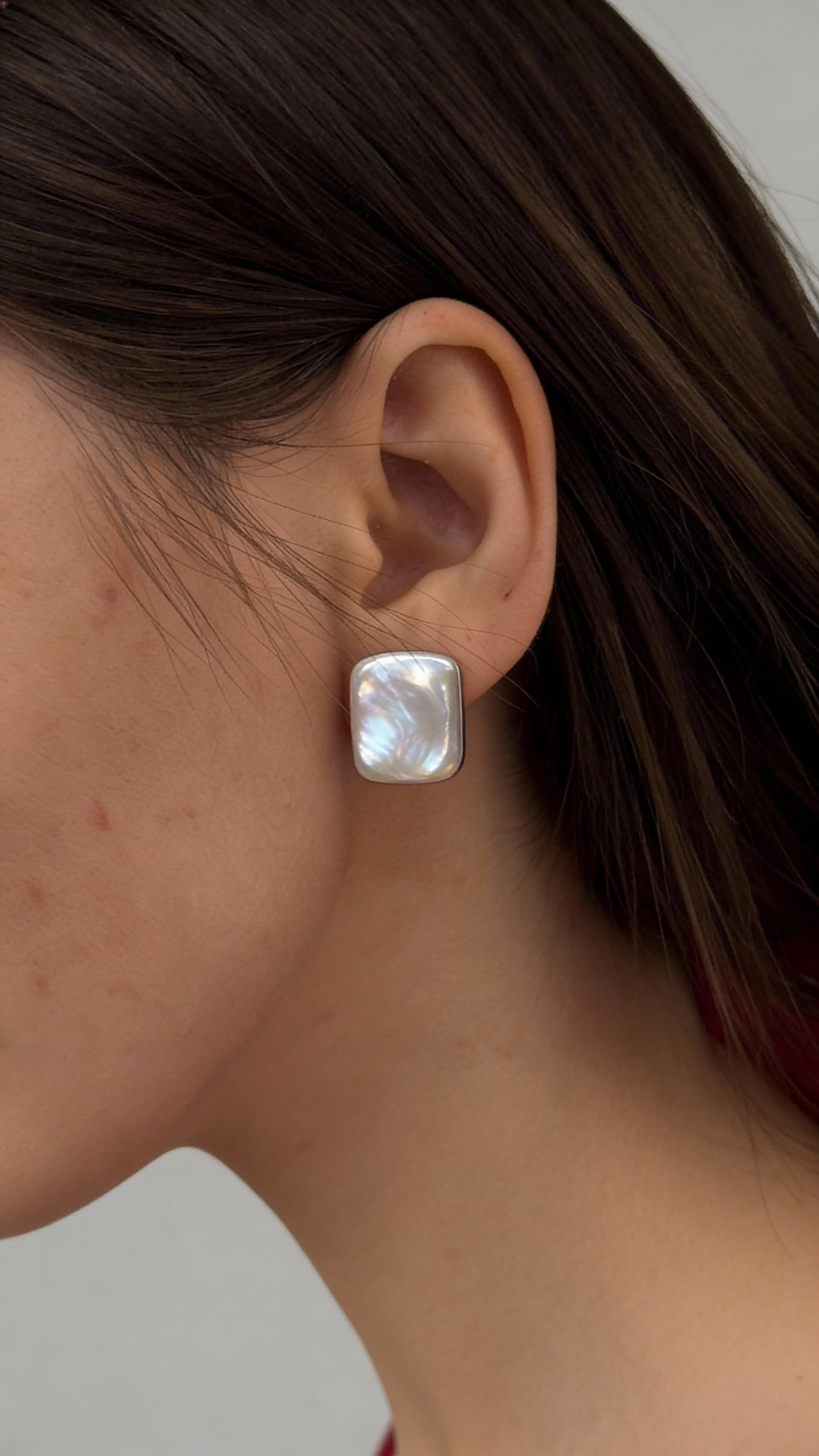 Форма, в которой хочется задержать взгляд. Мягкий квадрат из перламутра красиво ловит свет и подчёркивает естественное сияние кожи. Эти серьги работают как аккуратный акцент — добавляют образу собранности и спокойной элегантности.