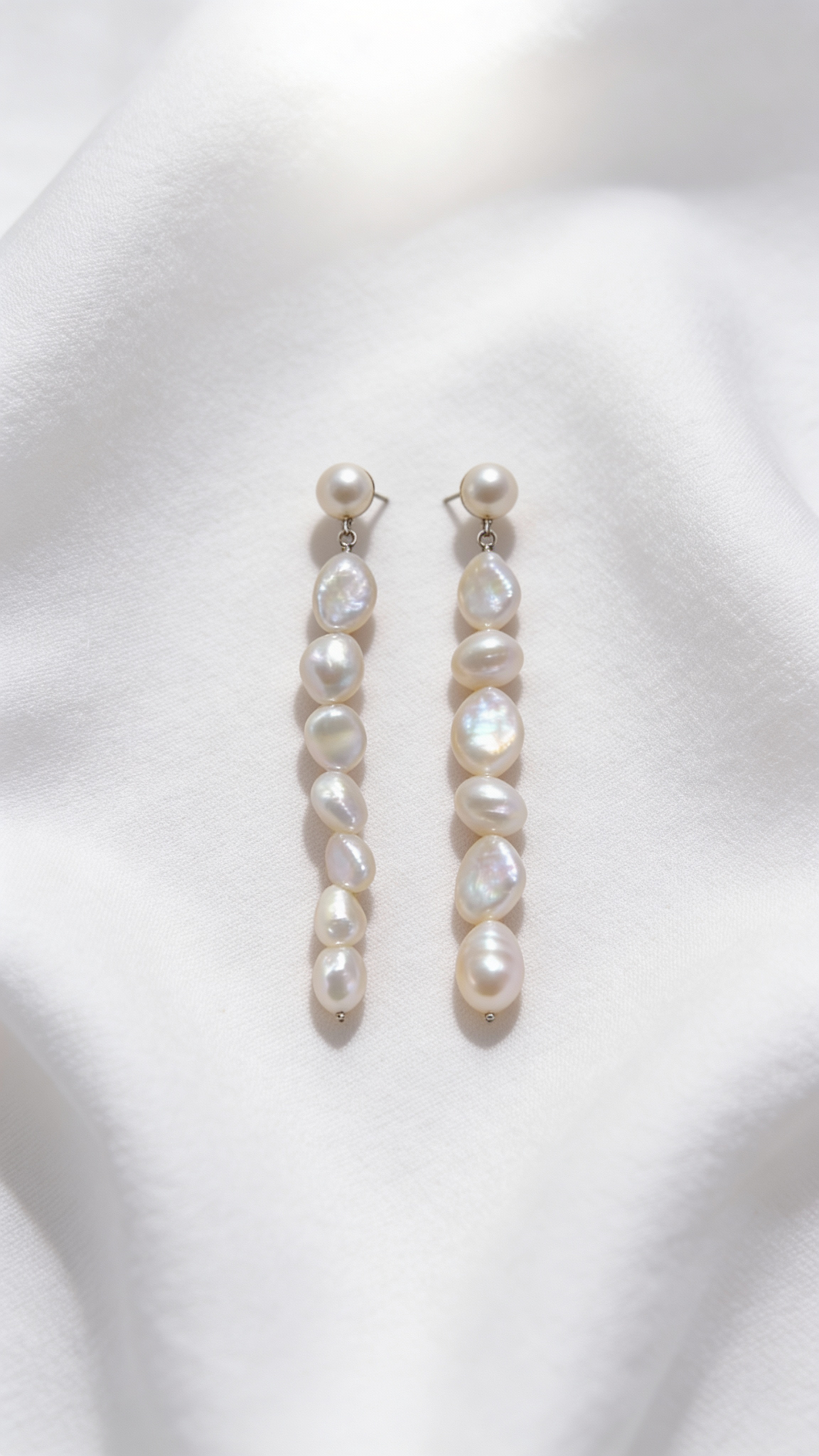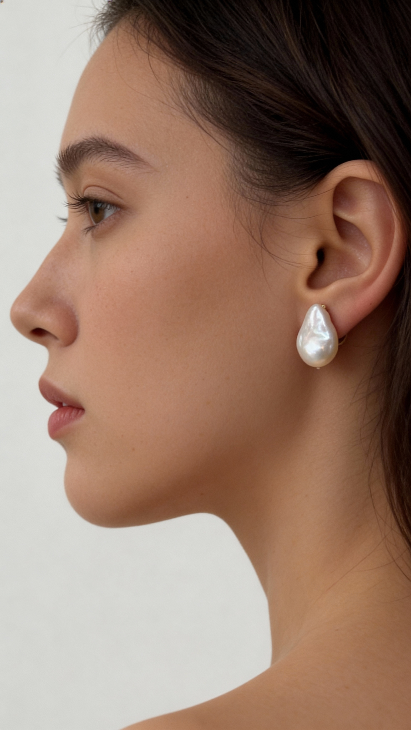 Удлинённые серьги с барочным жемчугом выстраивают чёткую вертикаль и мягко подчёркивают линию шеи. Жемчужины разной формы создают живой ритм и деликатное мерцание, которое красиво раскрывается в движении.