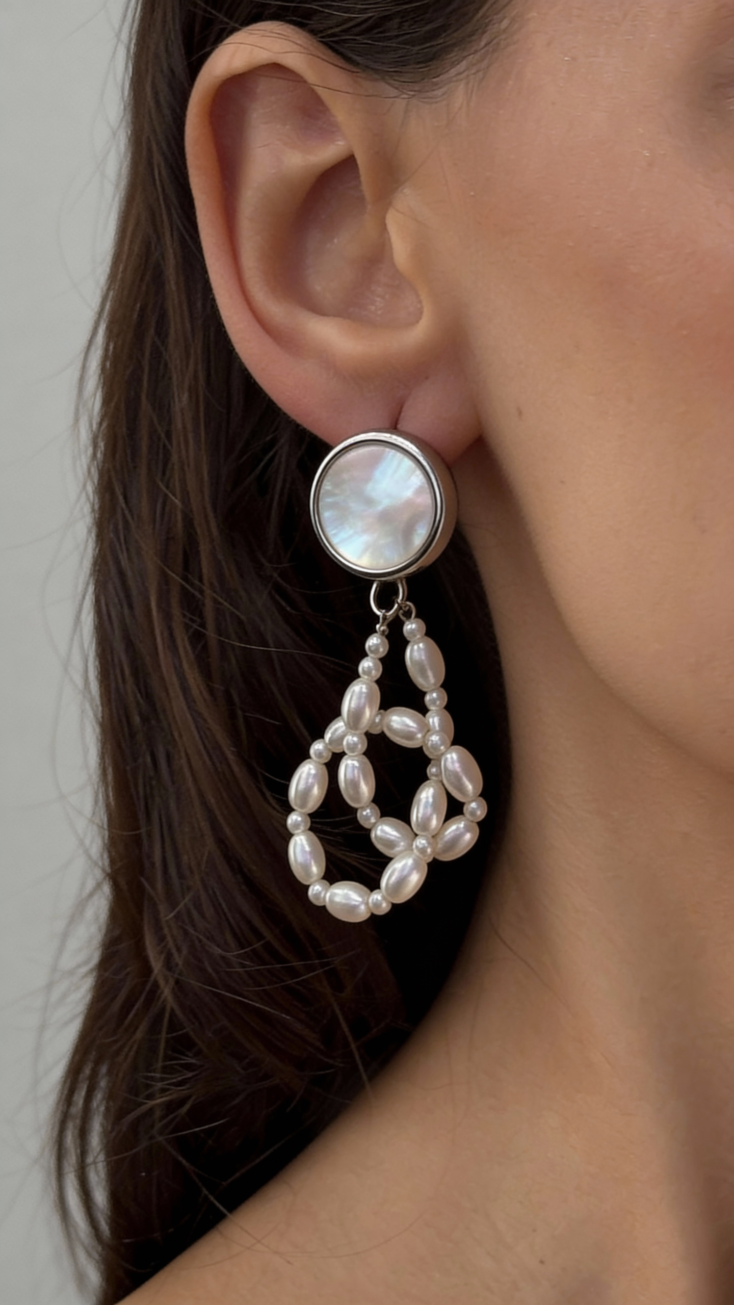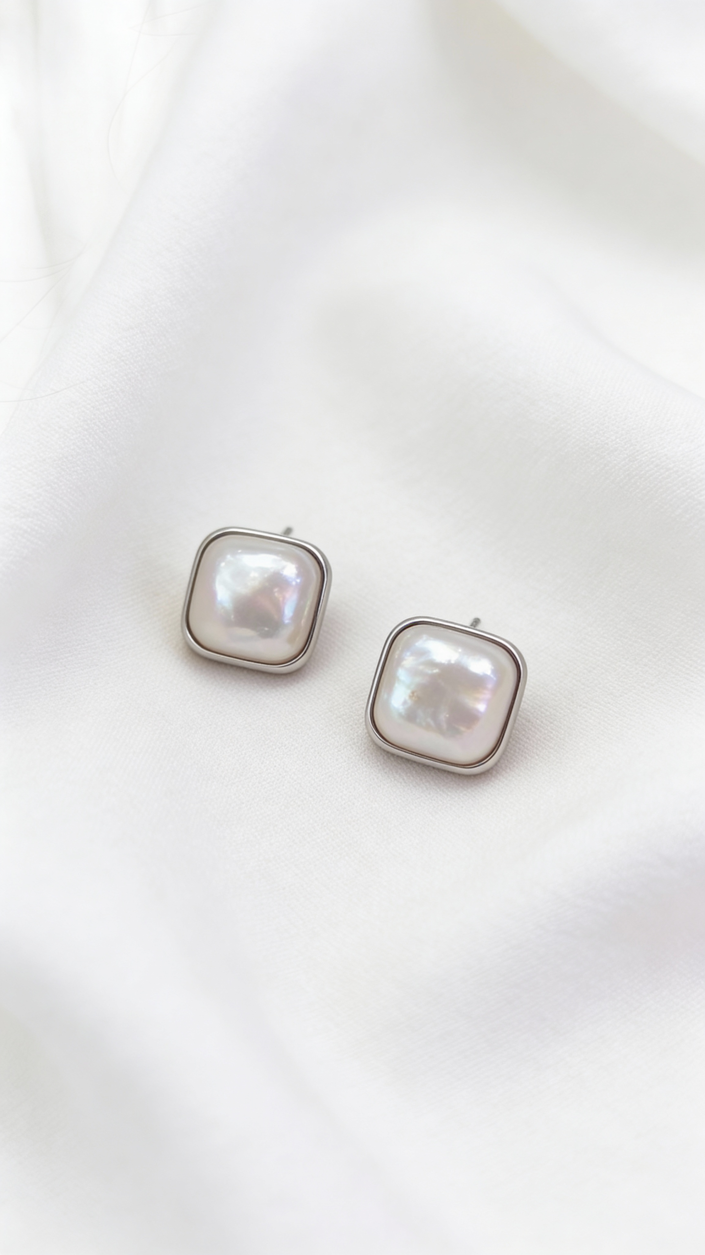 Минималистичные серьги с перламутровой вставкой создают аккуратный, собранный акцент и мягко подсвечивают образ. Неровная форма перламутра добавляет живую фактуру и ощущение естественной, неброской элегантности.