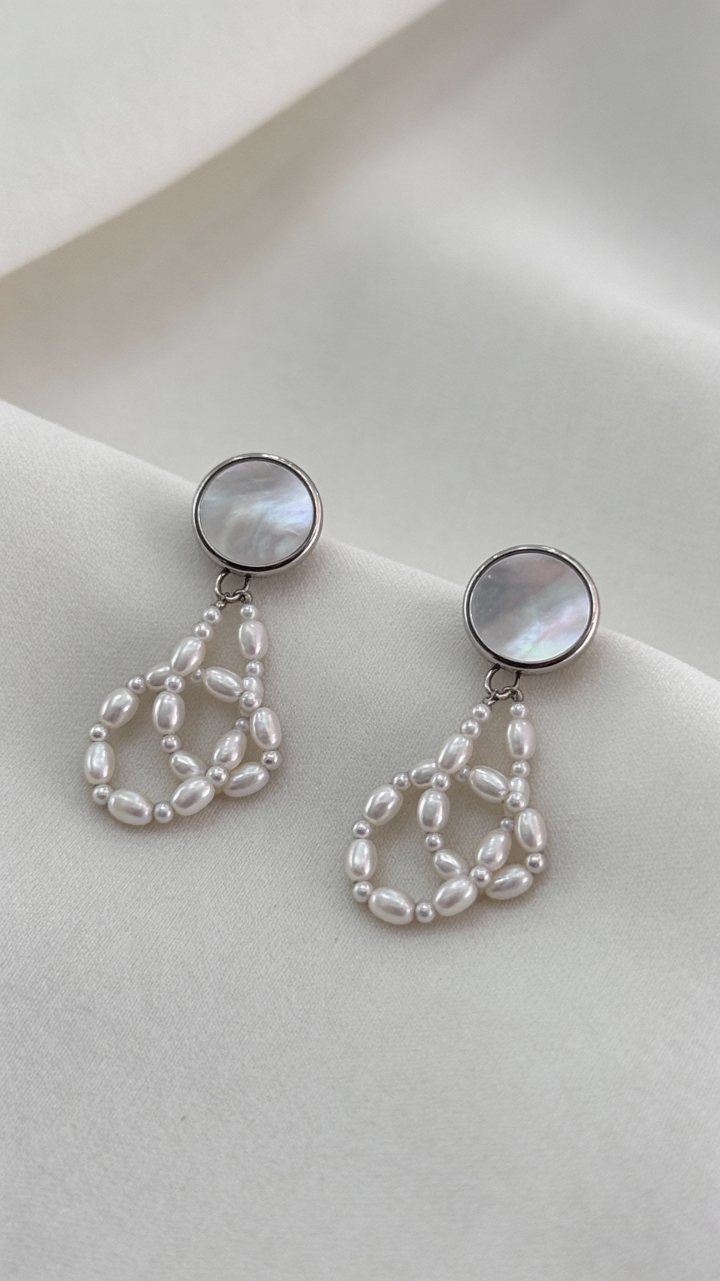 Серьги с перламутровым диском и жемчужным подвесом создают мягкий, светлый акцент и красиво раскрываются в движении. Живой блеск перламутра и округлая форма жемчуга добавляют образу глубину и ощущение естественной элегантности.