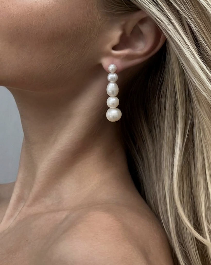 Серьги с жемчужными подвесами мягко движутся при каждом шаге, добавляя образу глубину и деликатное сияние. Разная форма и размер жемчуга создают ощущение естественности и лёгкой, непринуждённой элегантности.