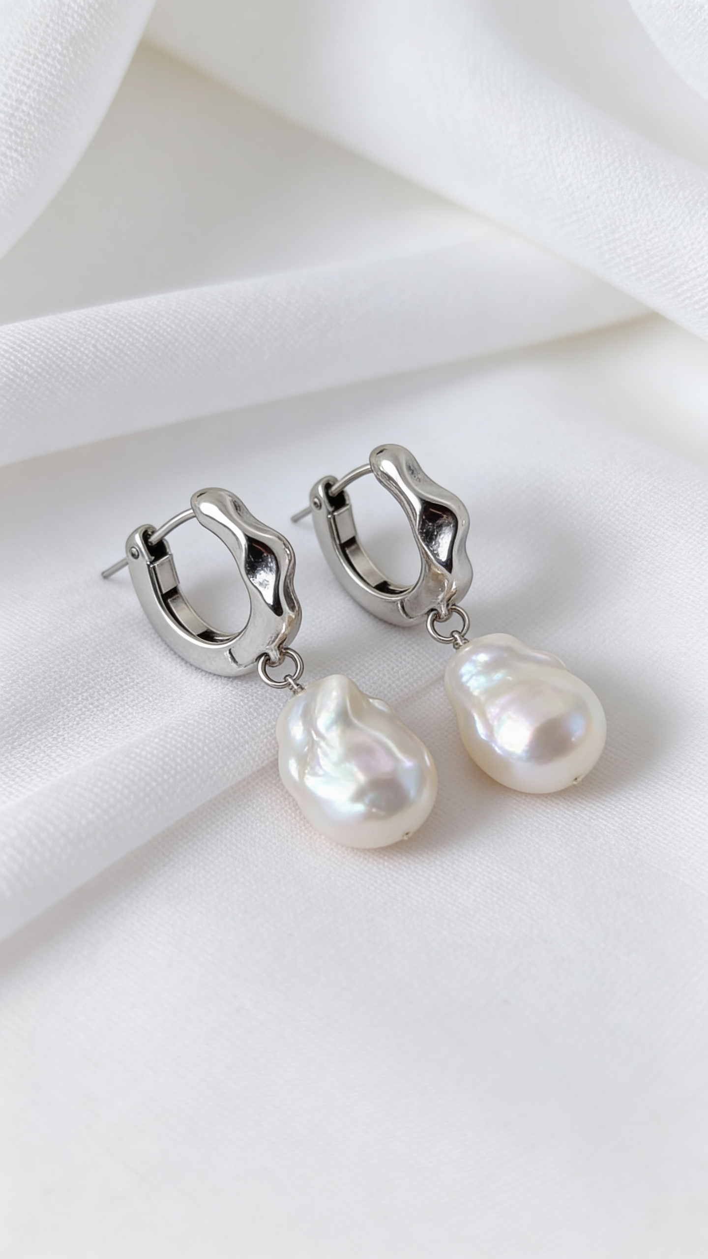 Серьги, которые сразу притягивают взгляд. Стильные серебристые кольца и барочный жемчуг создают контраст формы и фактуры — современно, чисто, уверенно.