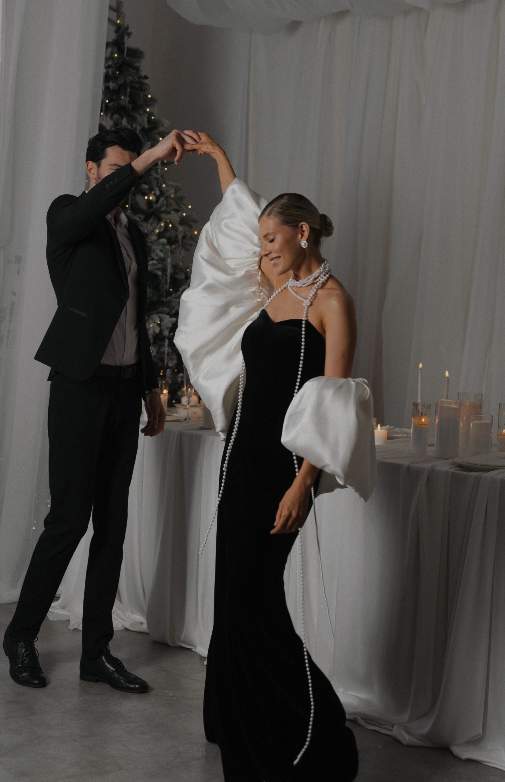 Игра на контрастах и уверенная женственность. Лаконичное чёрное платье в пол подчёркивает фигуру и создаёт эффект вытянутого силуэта, а объёмное белое болеро добавляет образу драматичности и настроения. Минимализм и выразительные детали делают образ сильным и запоминающимся.