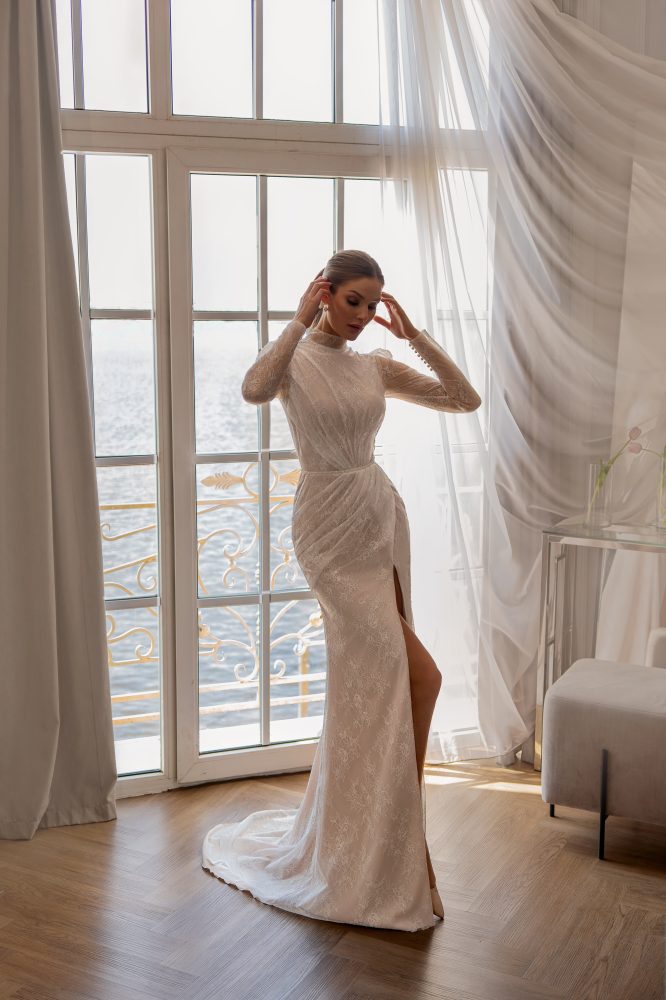Это платье про магию движения и тот самый эффект «невесомой невесты». Полупрозрачное кружевное платье мягко повторяет силуэт, а воздушный кейп струится за спиной, будто продолжение твоего дыхания. Легкость, свет и утончённость — образ для тех, кто хочет чувствовать себя не просто красивой, а по-настоящему особенной.