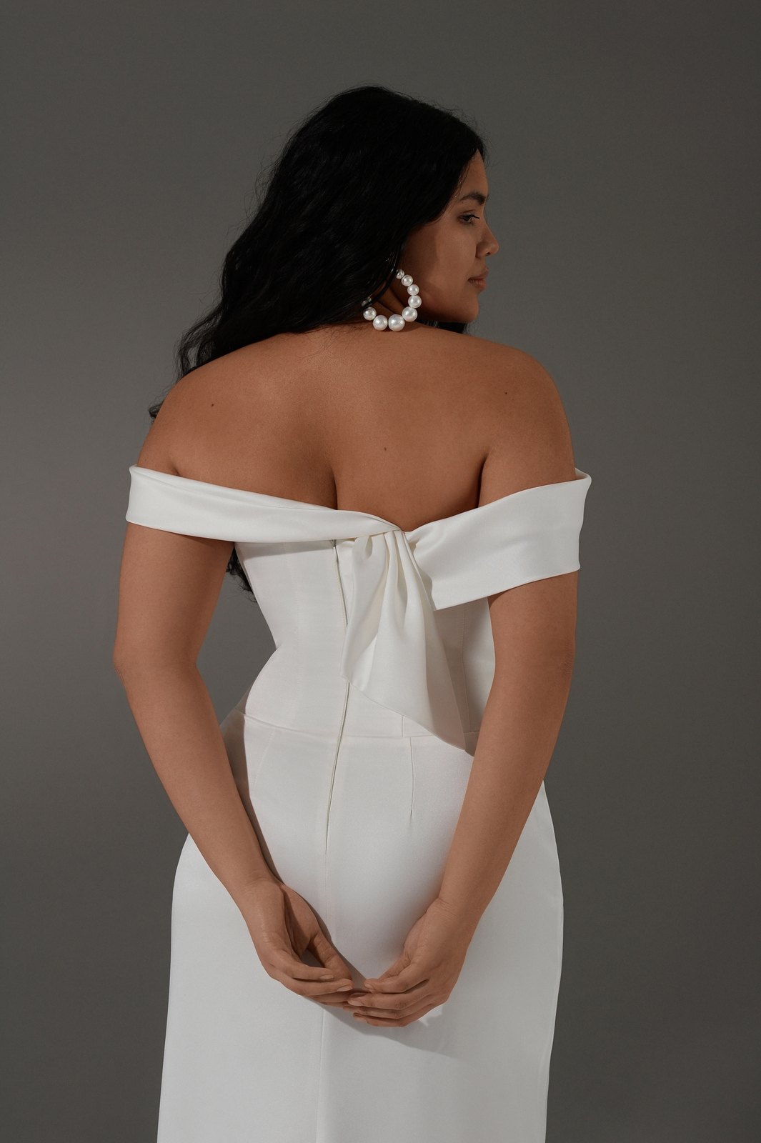 Это платье, в котором сила и чувственность звучат в унисон. Скульптурные драпировки подчёркивают талию и бёдра, а открытая линия плеч создаёт мягкий акцент на ключицах. Этот образ — про уверенность без слов и про красоту, в которой нет нужды сомневаться.